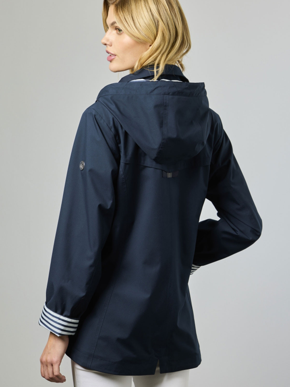 En sportig vårjacka från danska Junge med avtagbar huva. Modellen är lätt figursvängd och stängs med dold dragkedja och tryckknappar. Den har två snedställda fickor med knapp samt en bröstficka med dragkedja. Innerficka med dragkedja. Fodrad.
