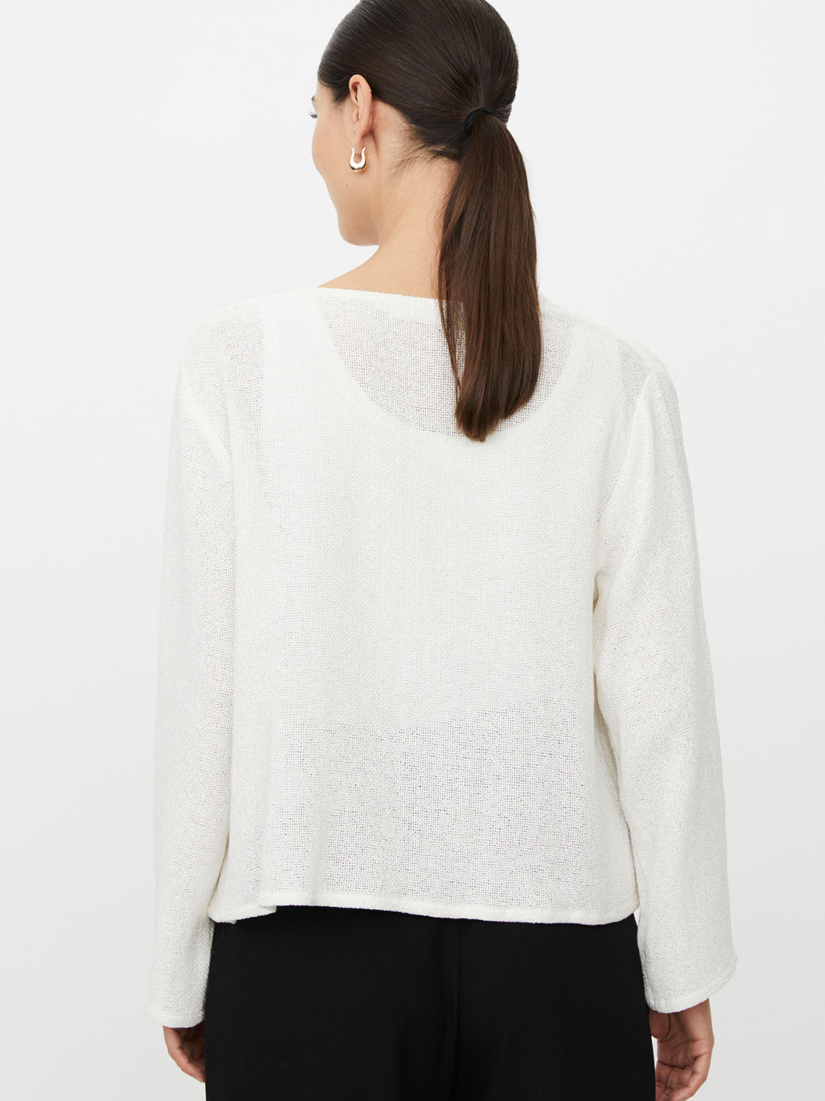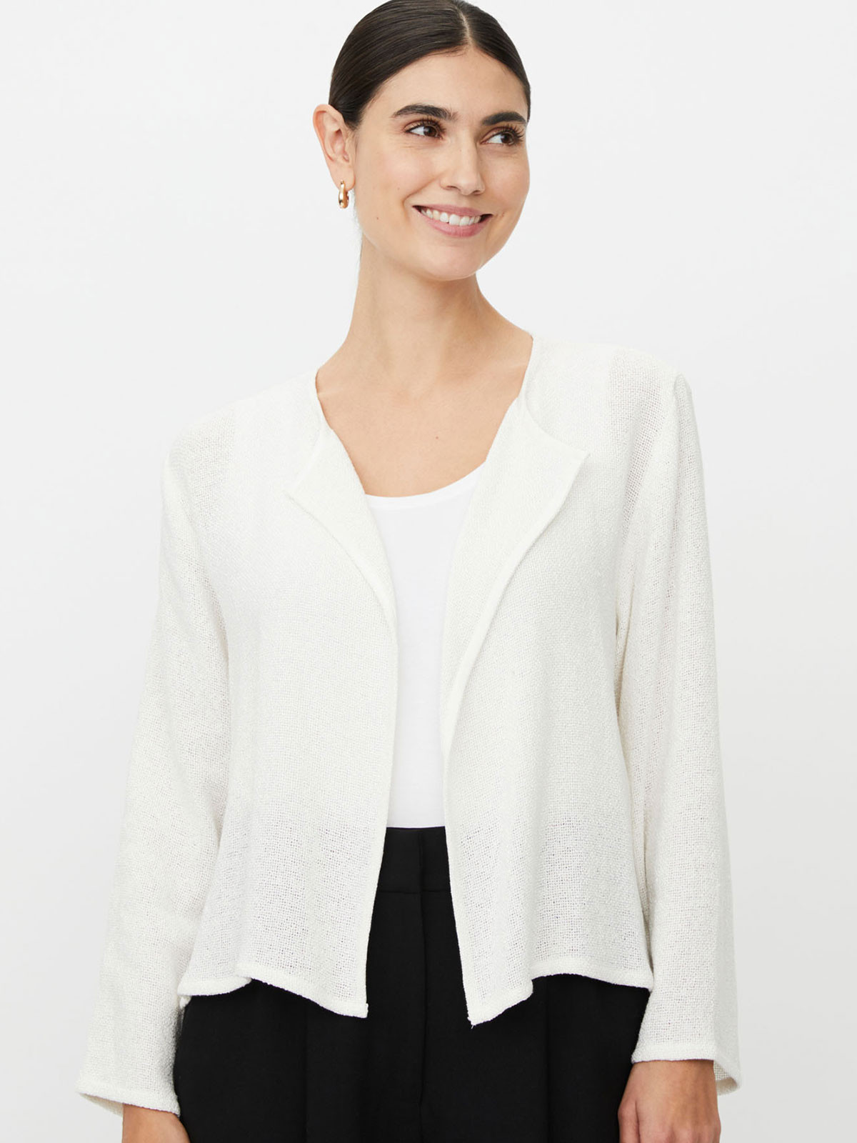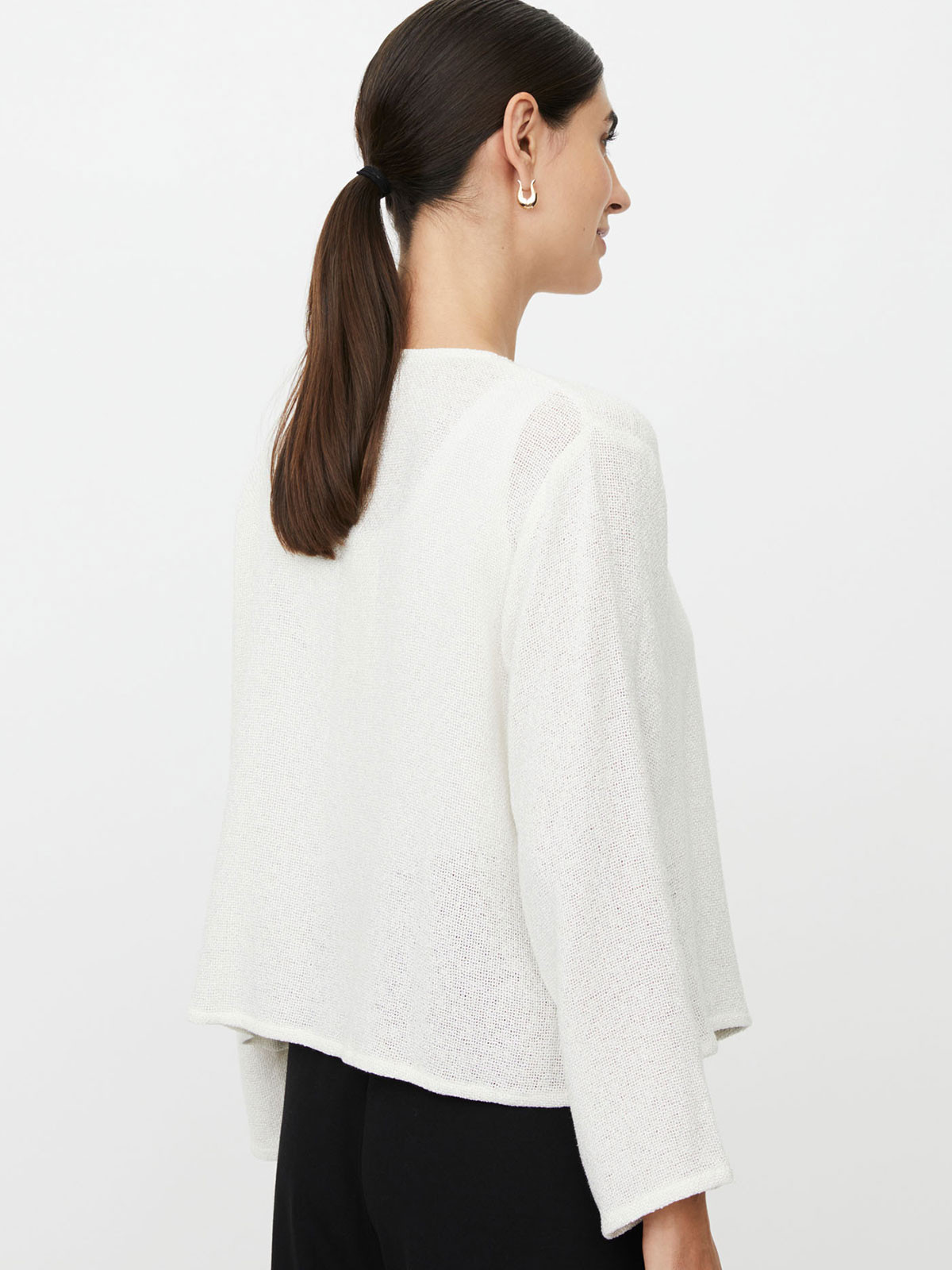 Stickad kort kofta/jacka från Masai. Enkel och lättburen modell utan knäppning, A-linje formad. Vissa klassiker återkommer säsong efter säsong – och den här vackra boucléjackan är en av dem. Den tidlösa och karaktärsfulla bouclén är perfekt för att föra in textur i din outfit. Jackan är designad med långa ärmar och ett enkelt uttryck som passar till allt.