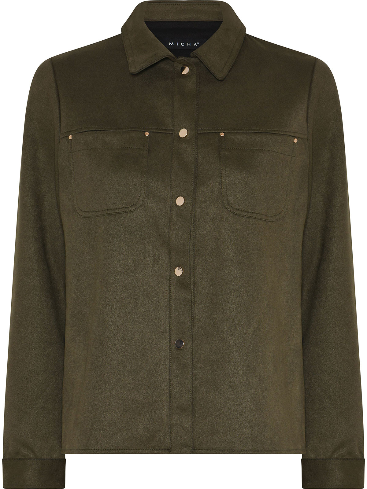 Elegant skjortjacka i mockaimitation från Micha. Modellen är rak med skjortkrage och hellång ärm. Tryckknapparna är av guldfärgad metall och på framsidan finns två bröstfickor. Ofodrad. Perfekt att ha över dina sommarkläder i övergångsperioden till höst. Blir sedan användbar som innejacka på samma sätt som en kavaj.