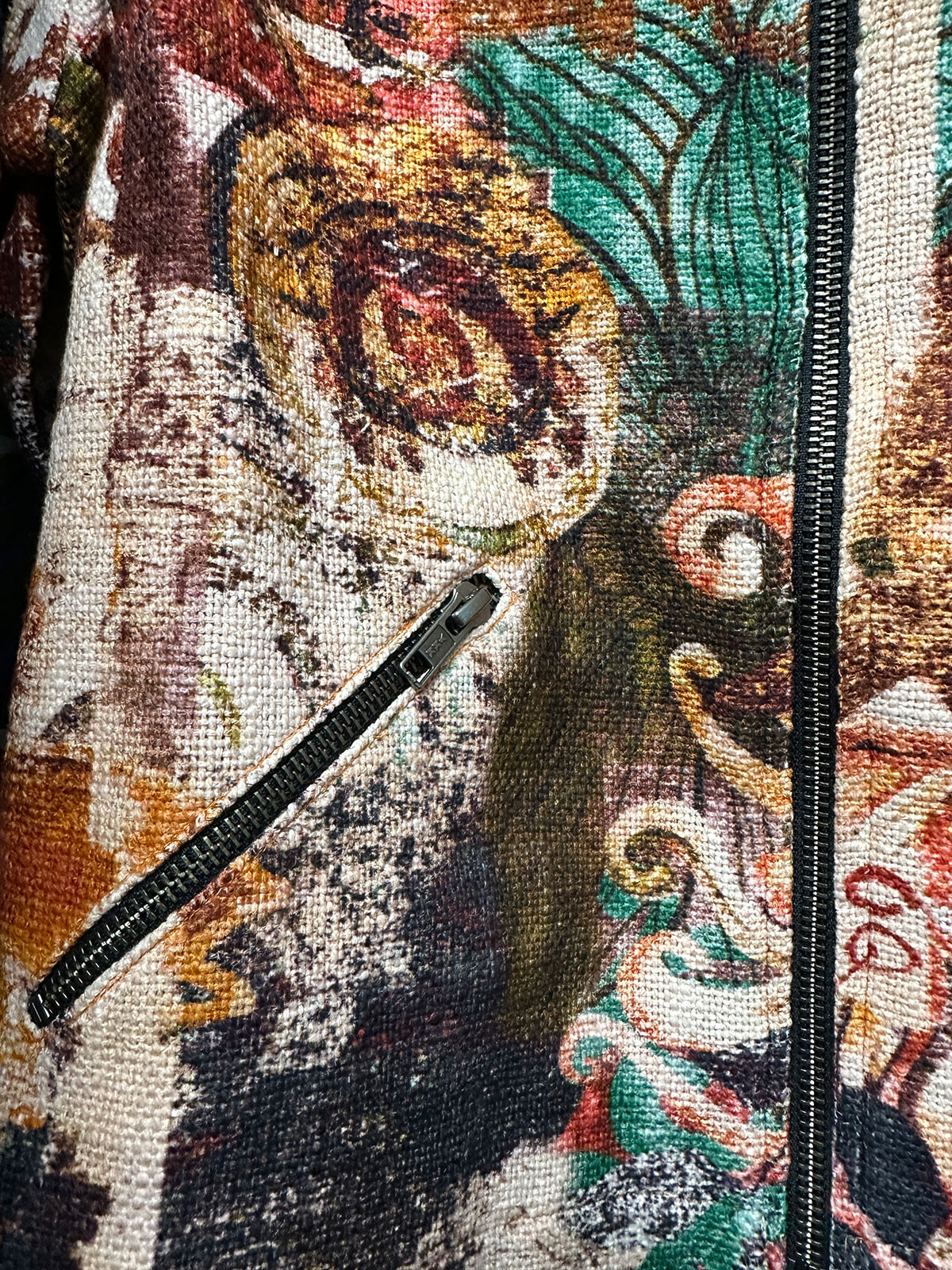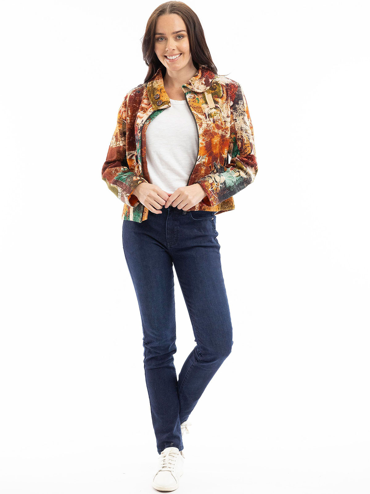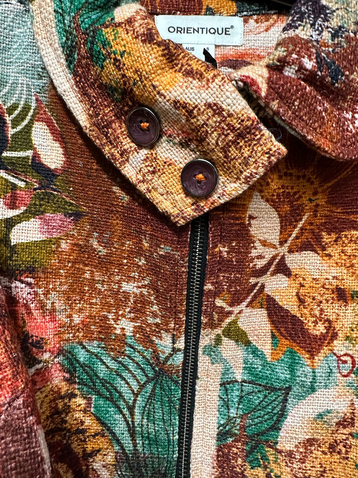 Tuff jacka från Orientique i en grövre struktur och härliga färger. Modellen är rak och har krage med rundade snibbar och dekorknappar. Den stängs med dragkedja och har två snedställda fickor fram som också har dragkedja. Fodrad.