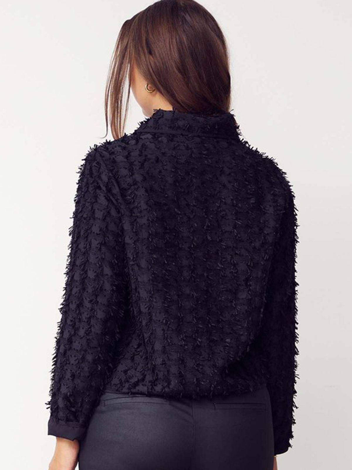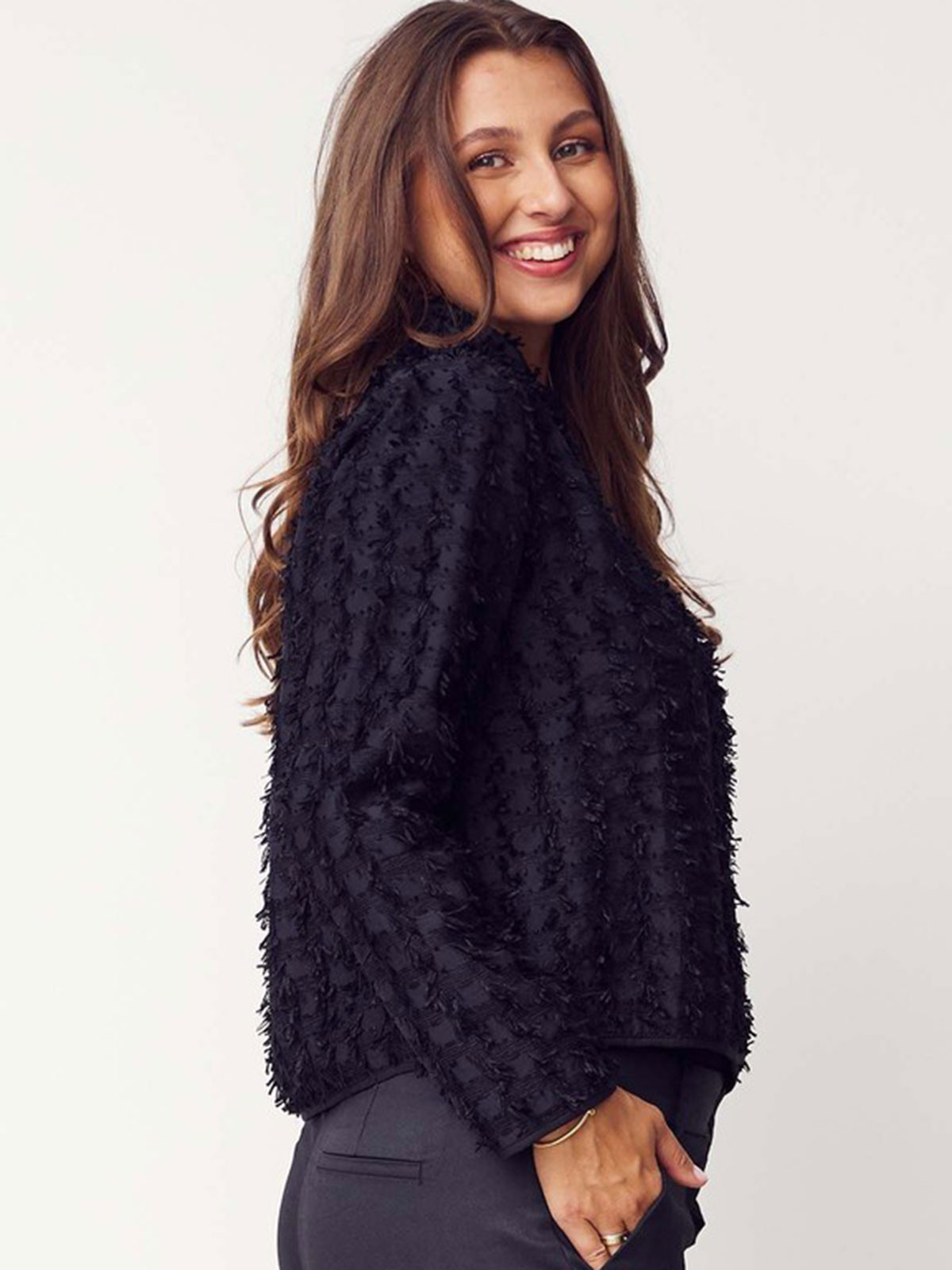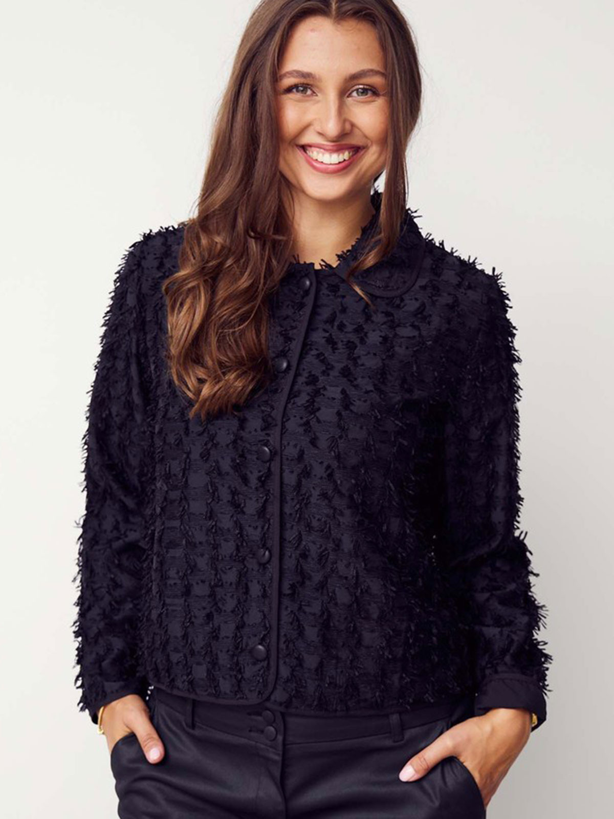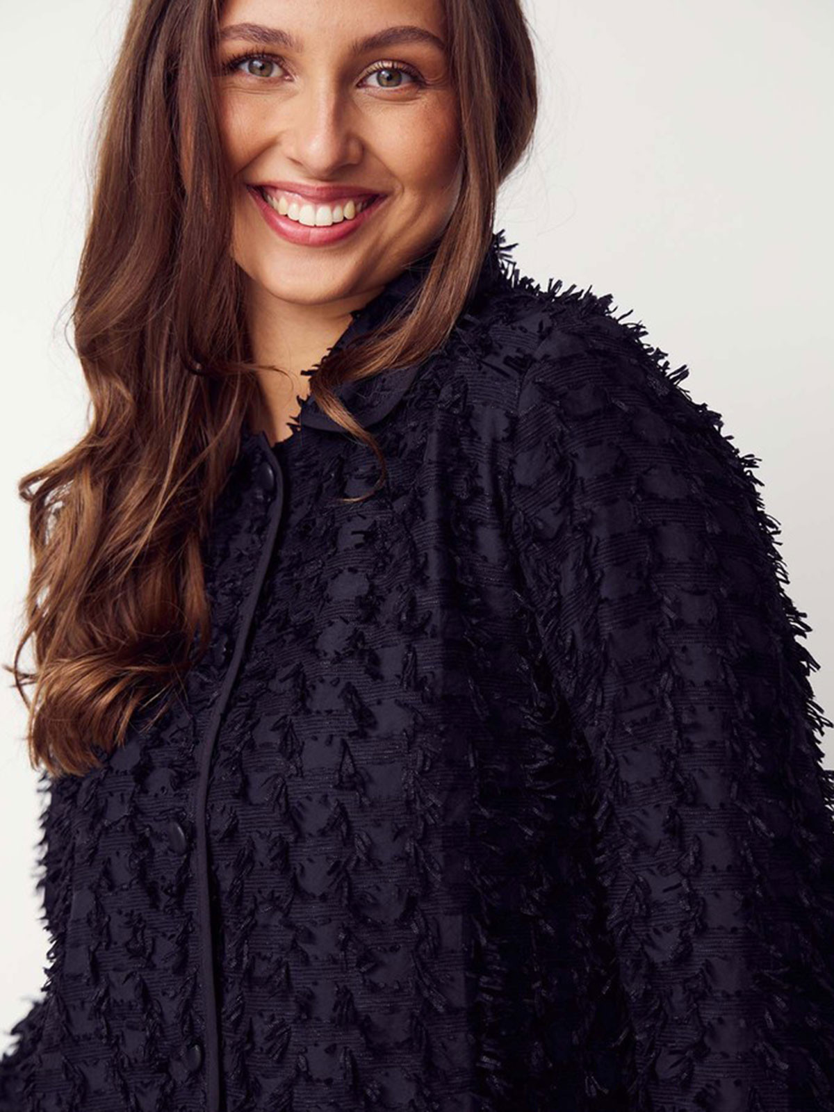 Tuff jacka från Isay med "bandstruktur" som gör ytan levande. Modellen är söt med något överdimensionerad och rundad krage. Ärmen är hellång och avsmalnande. Knäppning hela vägen fram med klädda knappar. Fodrad, inga fickor.
