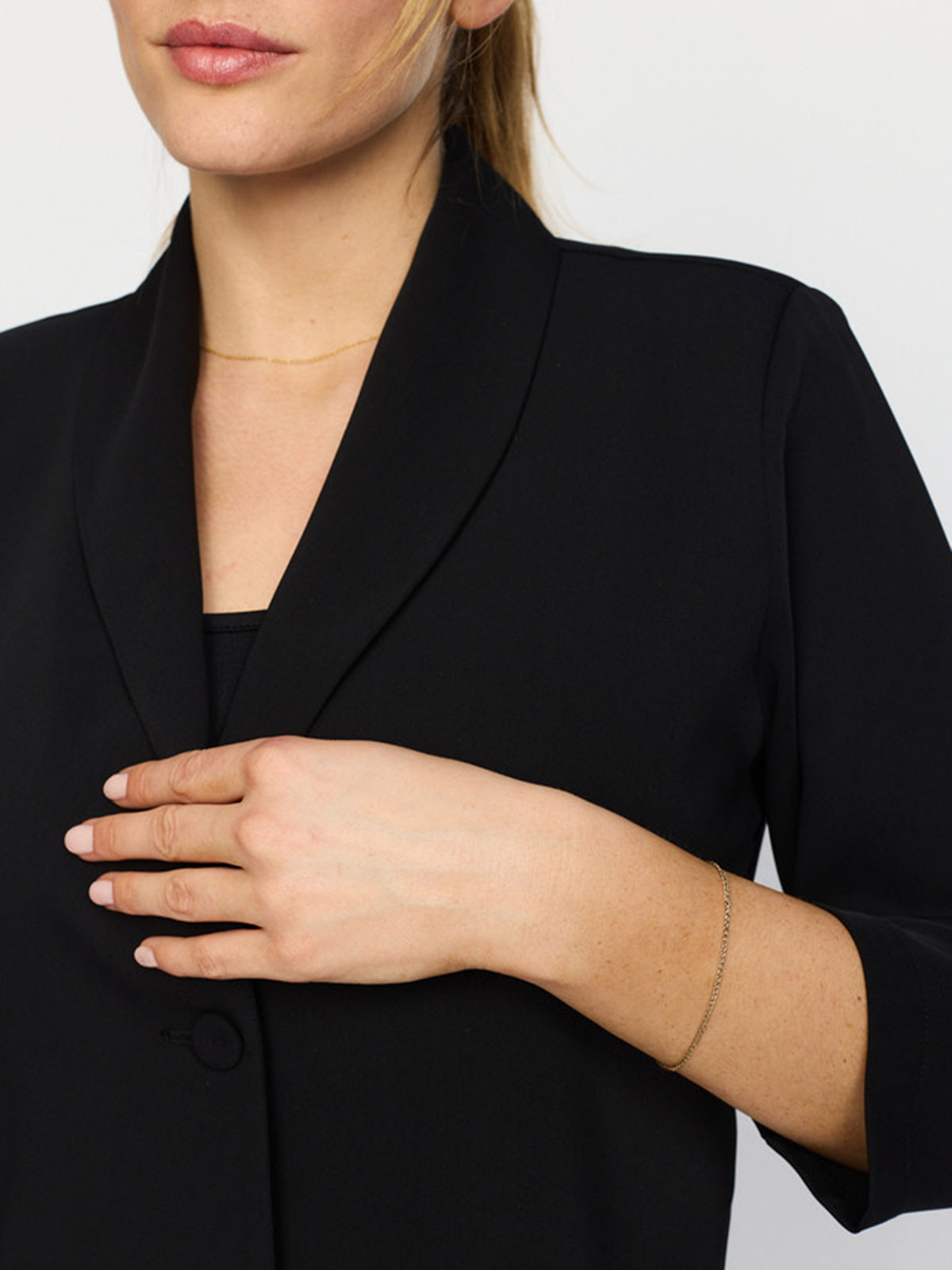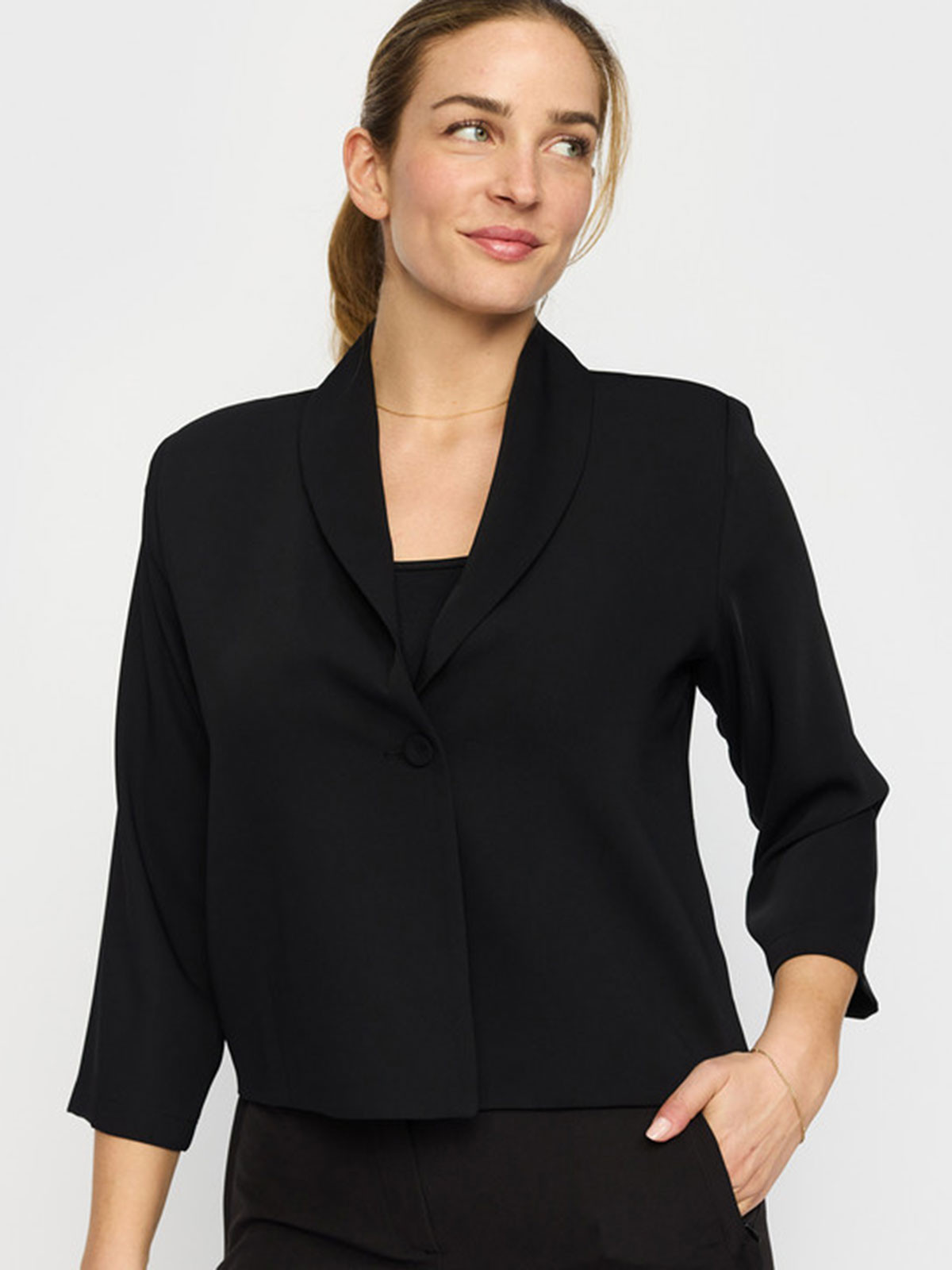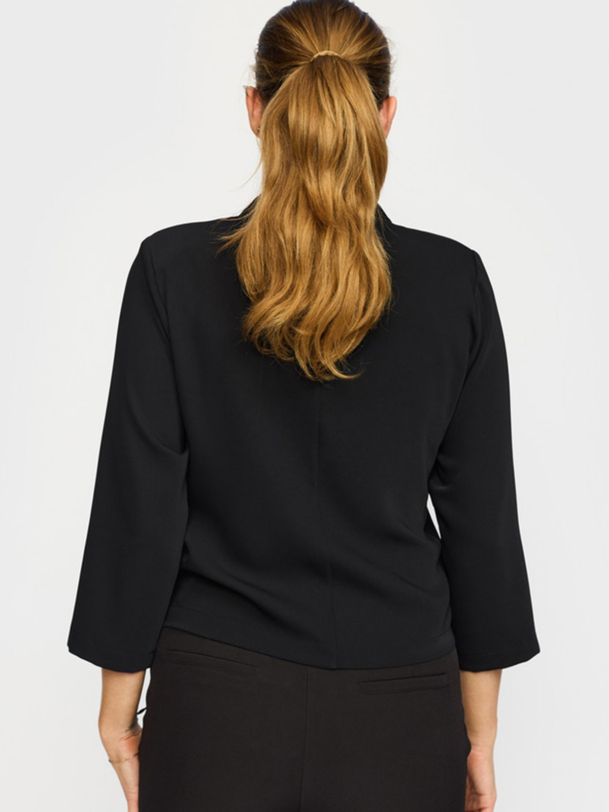 Elegant kort kavaj från 2-BIZ med trekvartslång ärm. Modellen är rak och har ett obrutet kavajslag. Den knäpps med en klädd knapp, är delvis fodrad och axeln är uppbyggd med vaddar. Inga fickor, skrynkelfri.