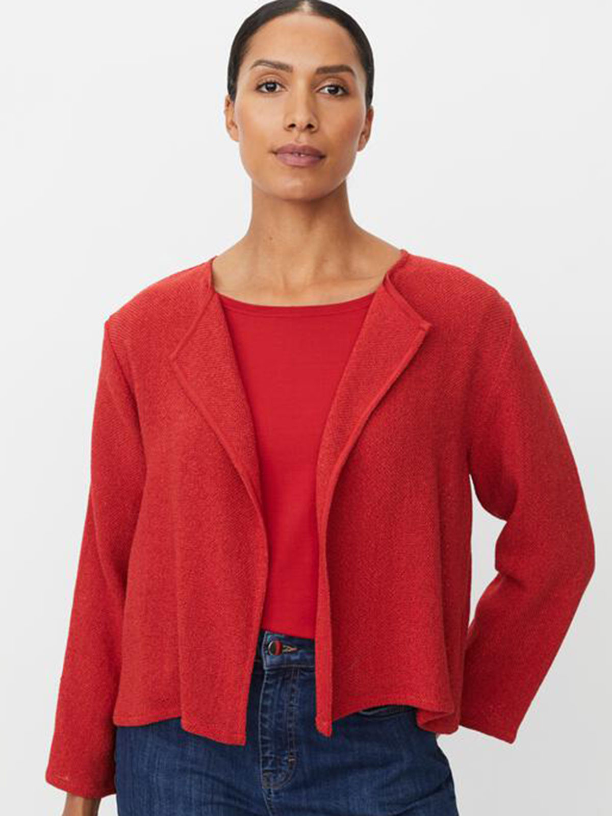 Stickad kort kofta/jacka från Masai. Enkel och lättburen modell utan knäppning, A-linje formad. Vissa klassiker återkommer säsong efter säsong – och den här vackra boucléjackan är en av dem. Den tidlösa och karaktärsfulla bouclén är perfekt för att föra in textur i din outfit. Jackan är designad med långa ärmar och ett enkelt uttryck som passar till allt