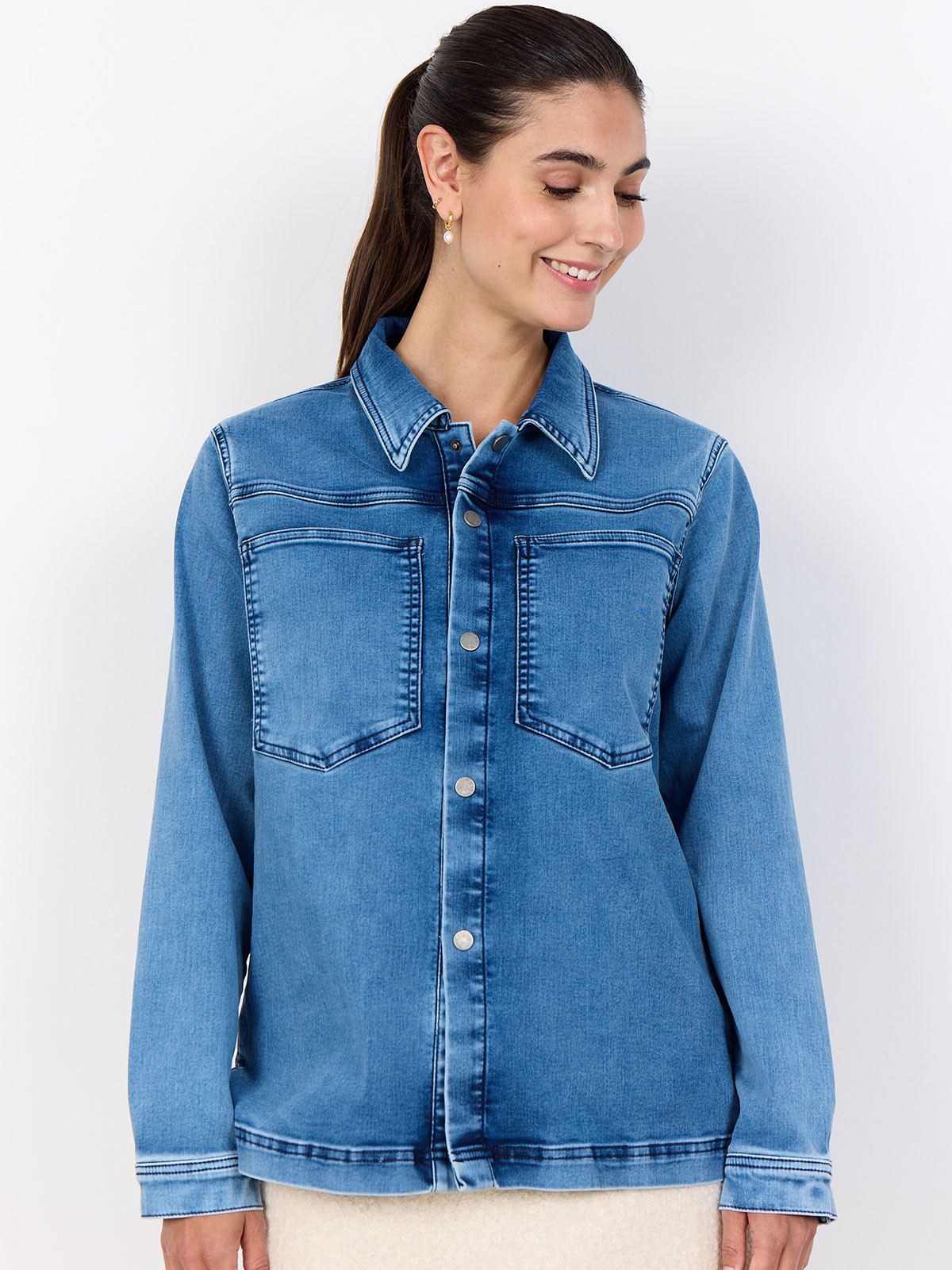 Skön denimjacka, eller storskjorta, från SoyaConcept. Modellen är lång och rak och har klassisk krage och två stora bröstfickor. Ärmen är hellång med manschett och nederkanten rak och något längre bak. Ofodrad, slitsar i sidorna.