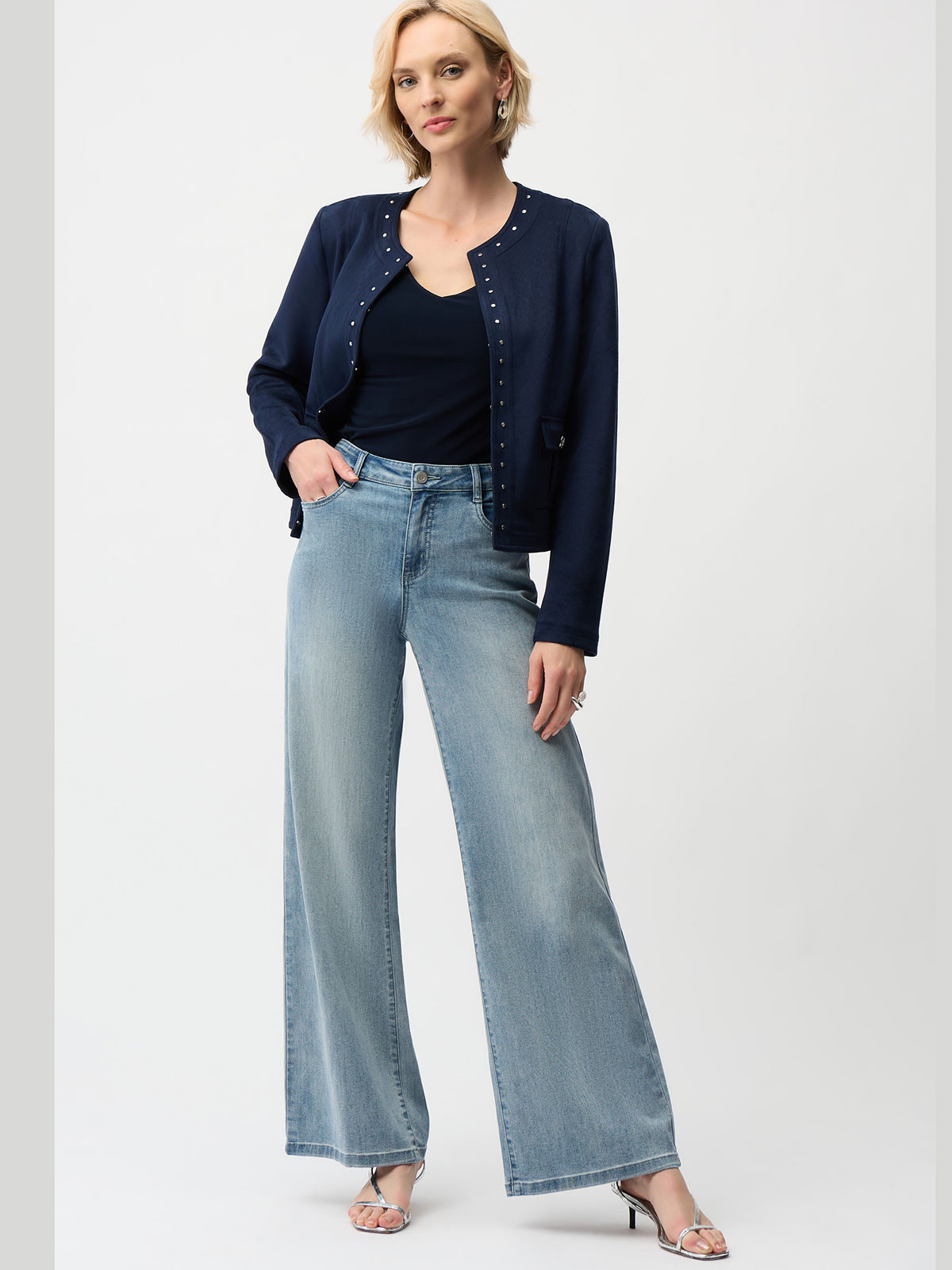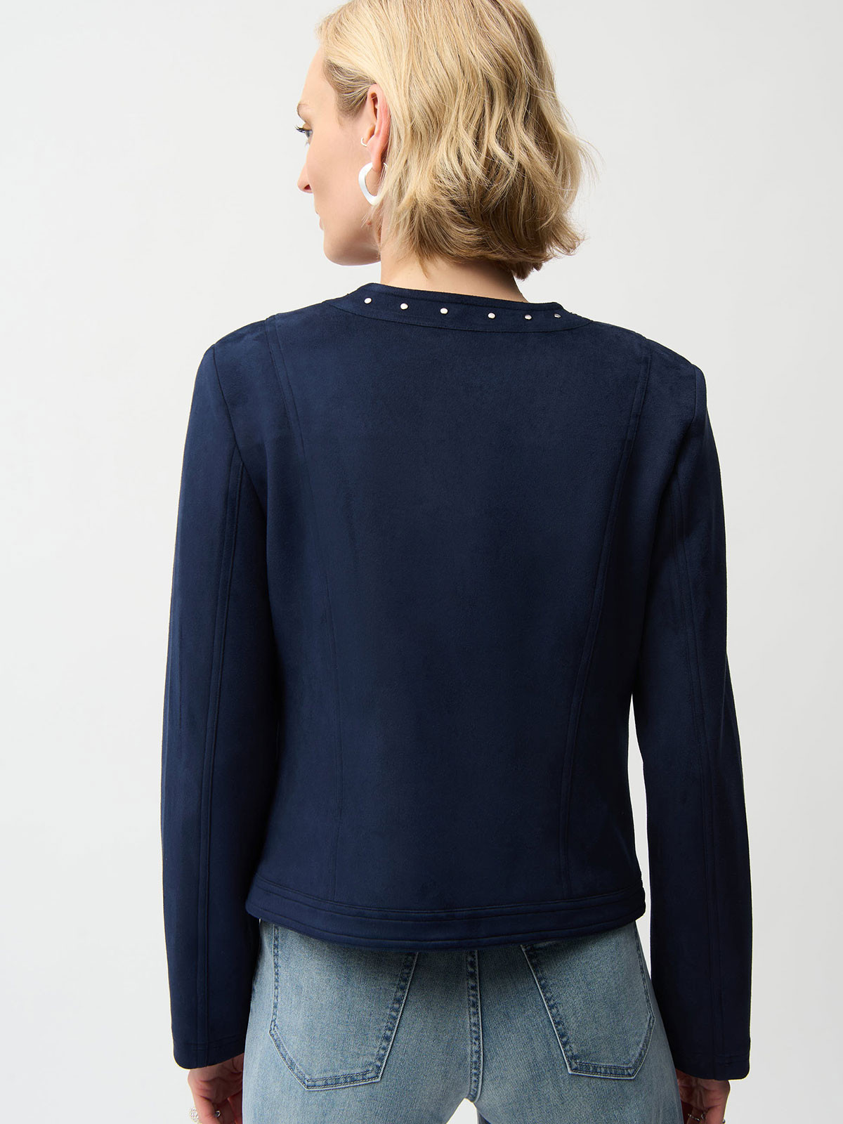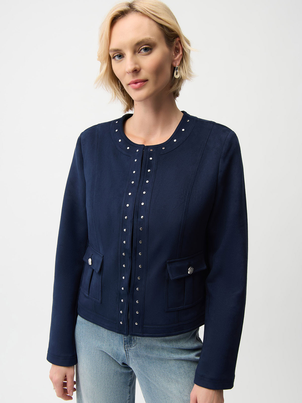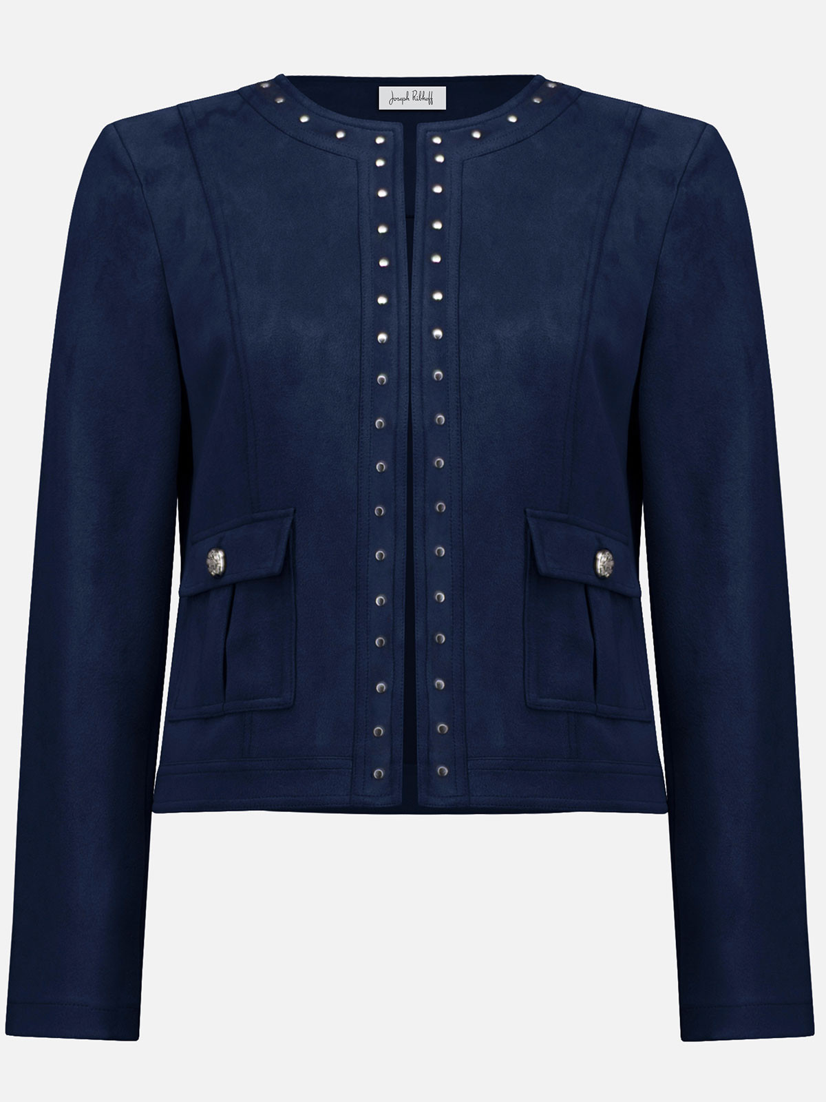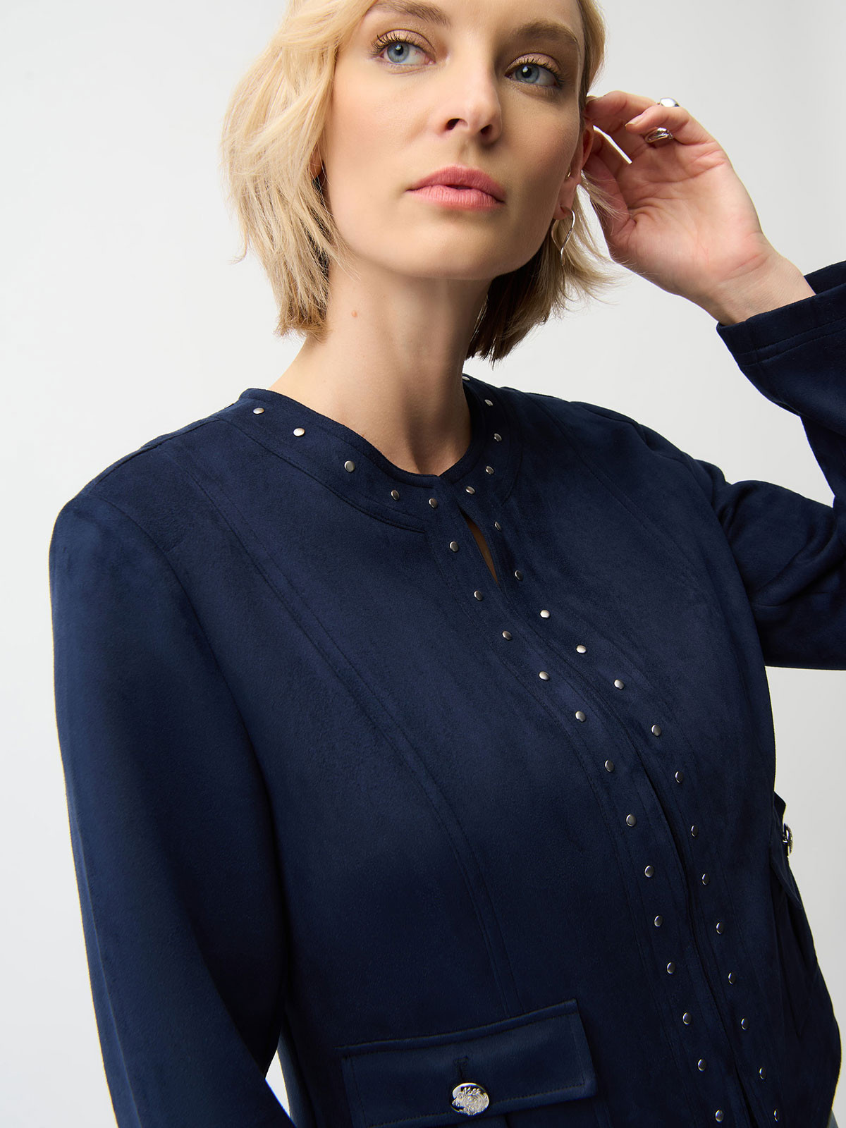 Tuff jacka från Joseph Ribkoff i snygg mockaimitation. Modellen är enkel och rak med rundad hals och hellång ärm. Jackan stängs med dolda hyskor och längs med hals och framkant löper en dekorativ nitrad. På framsidan finns två påsydda fickor med fickolock och dekorativ silverknapp. Jackan är delvis fodrad.