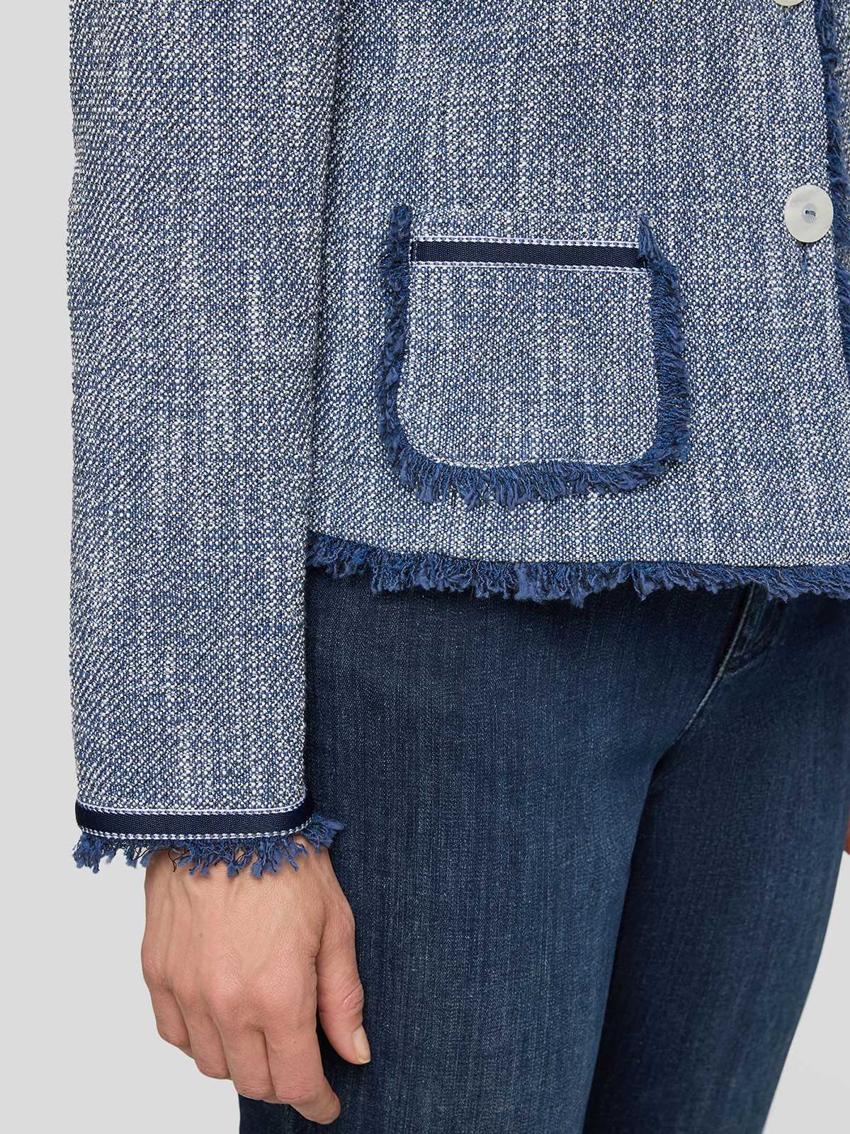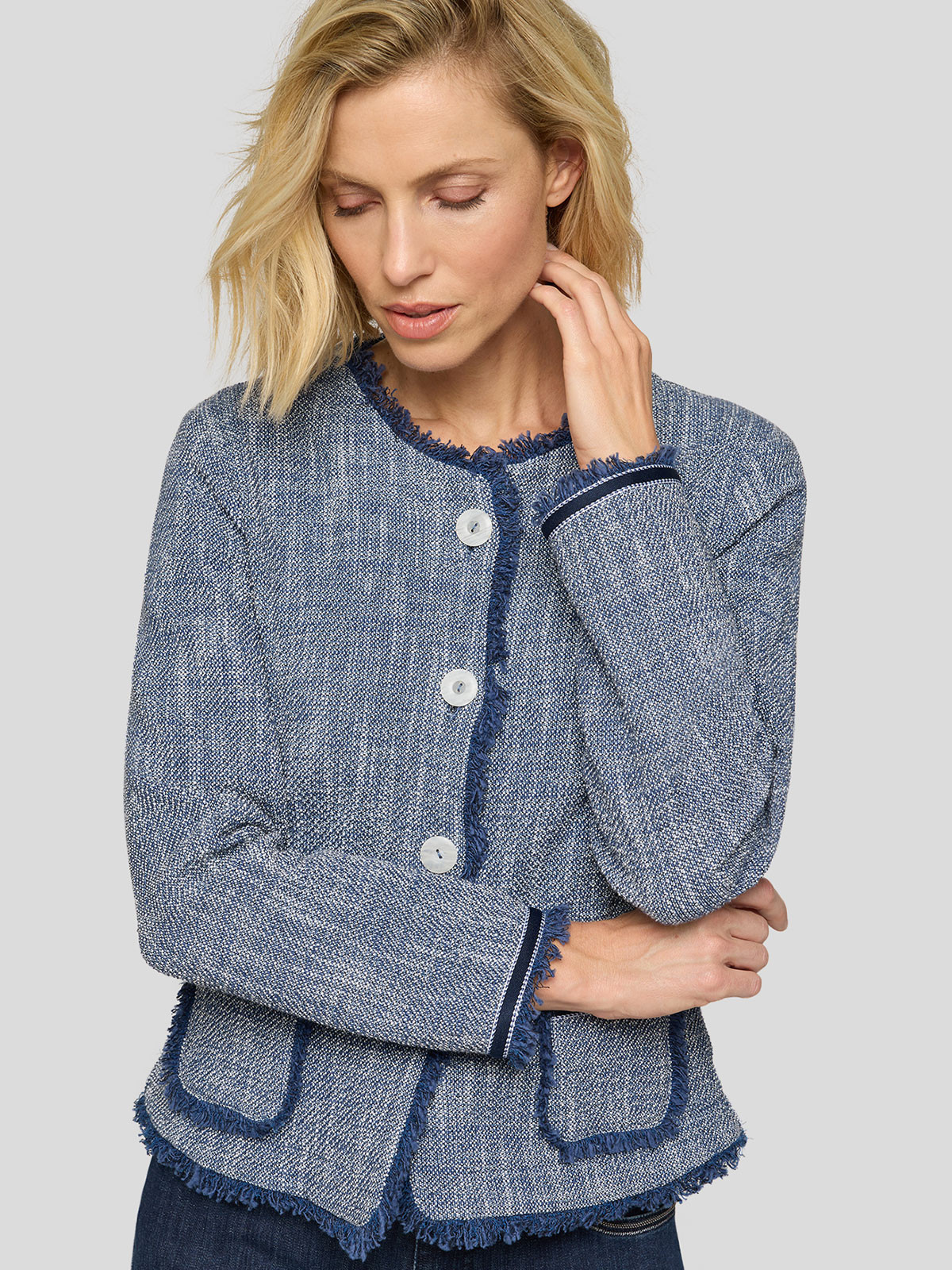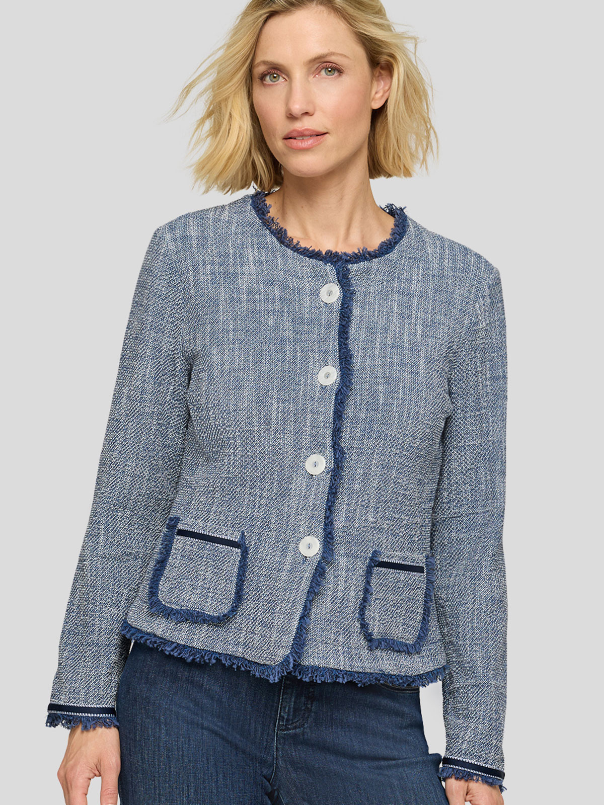 Superfin jacka i lite ruffare struktur från Rabe med fransade kanter. Modellen är lätt figursvängd, har rundad hals och hellång ärm med dekorativt kantband nertill. Två fuskfickor fram och ofodrad. Stängs med melerade knappar.