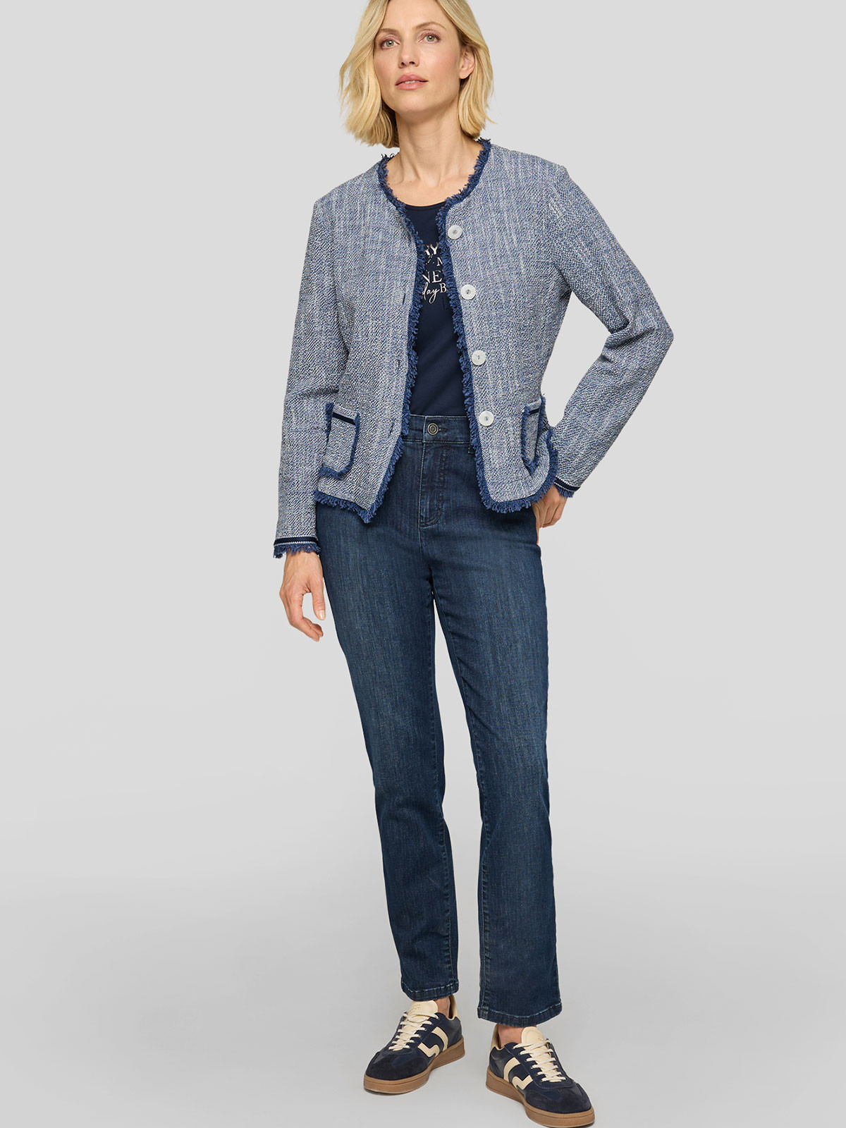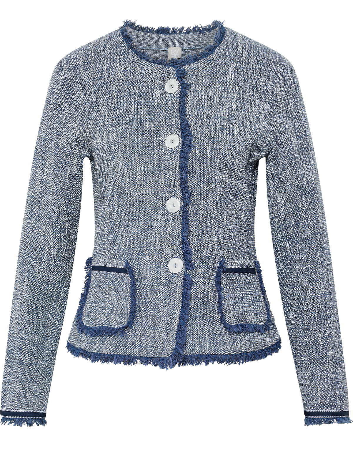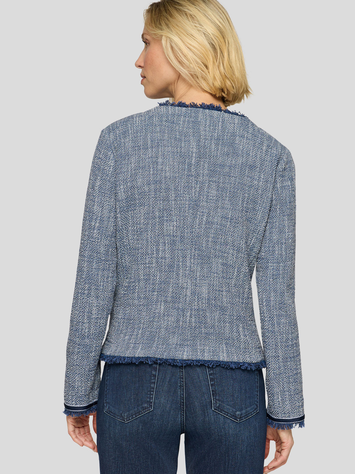 Superfin jacka i lite ruffare struktur från Rabe med fransade kanter. Modellen är lätt figursvängd, har rundad hals och hellång ärm med dekorativt kantband nertill. Två fuskfickor fram och ofodrad. Stängs med melerade knappar.