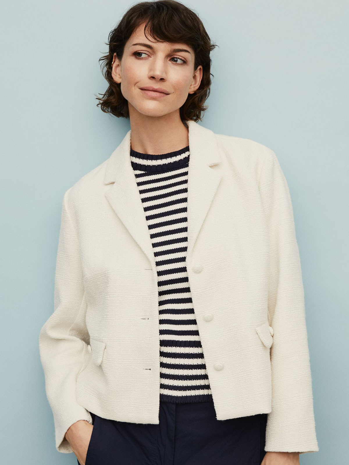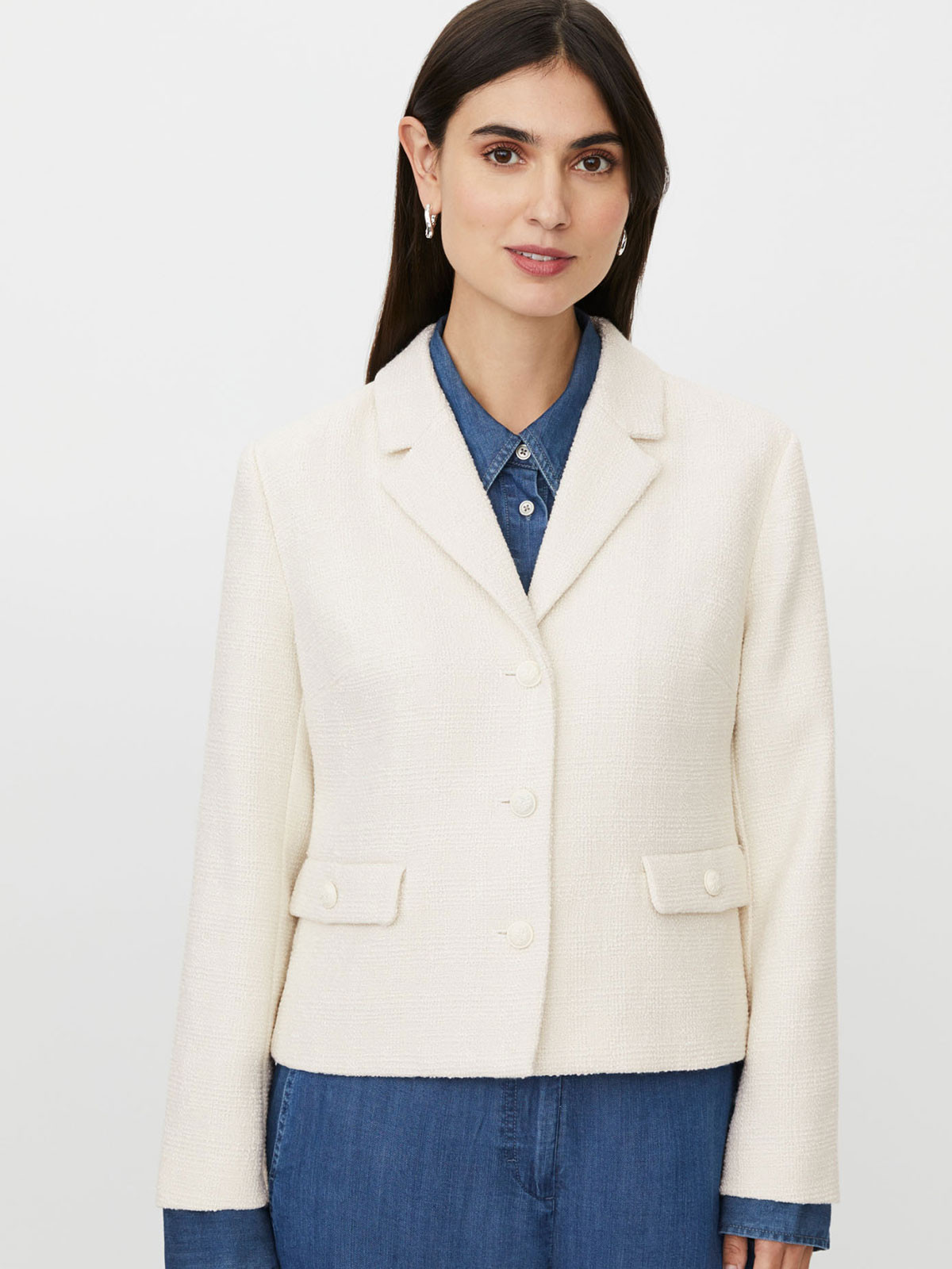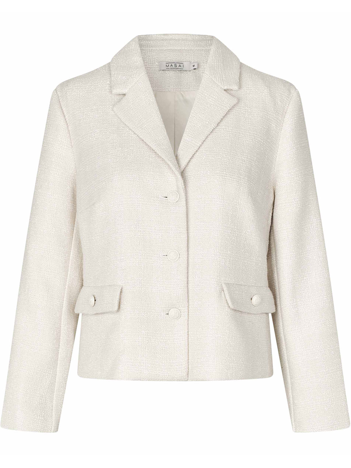 Boucléjacka från Masai i en klassisk modell. Den är lätt figursvängd utan att vara tajt och knäpps med dekorknappar, har två fickor med lock och hellång ärm.