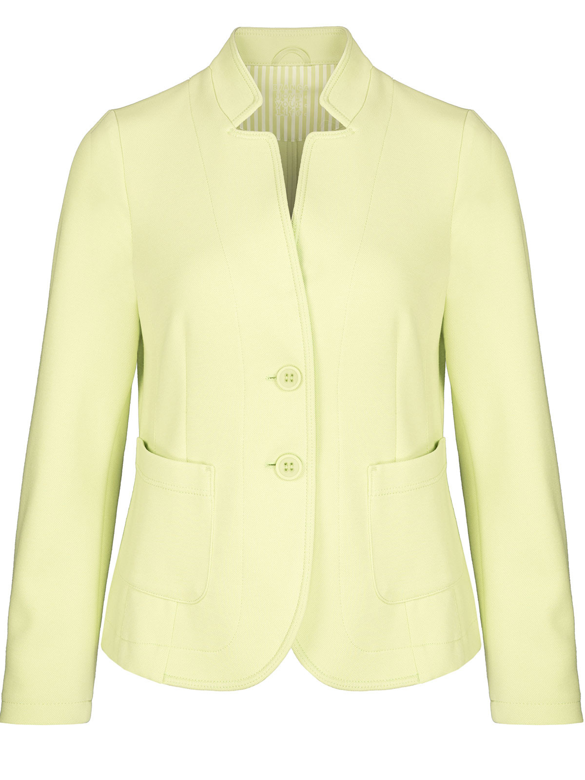 En sportig kavaj från Bianca i en pikéliknande trikå. Modellen är lätt figursydd med hellång ärm, brutet kavajslag och två påsydda fickor fram. Kavajen är ofodrad och knäpps med två knappar.