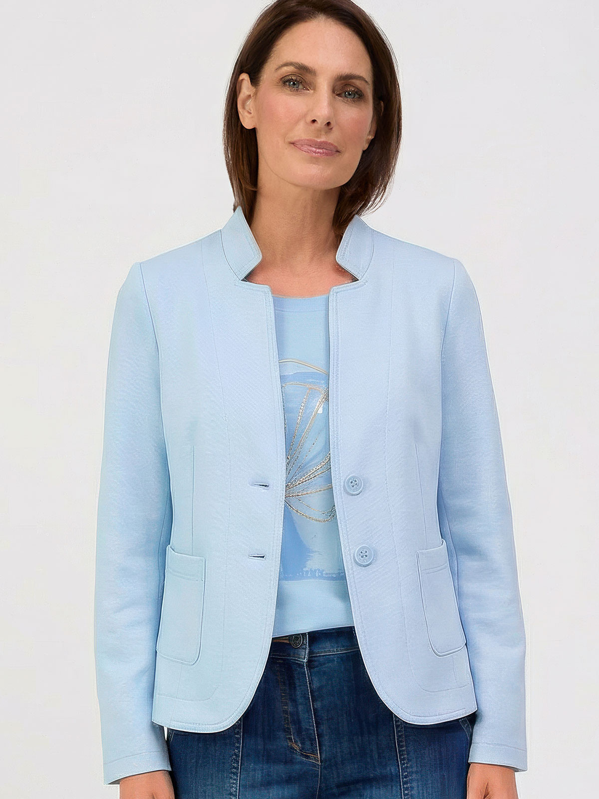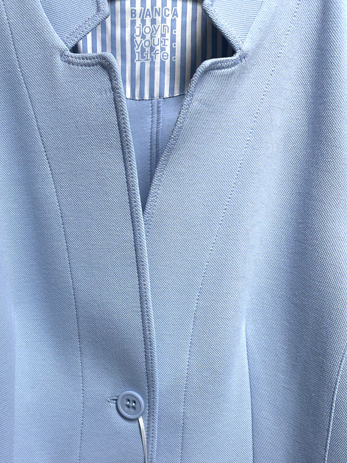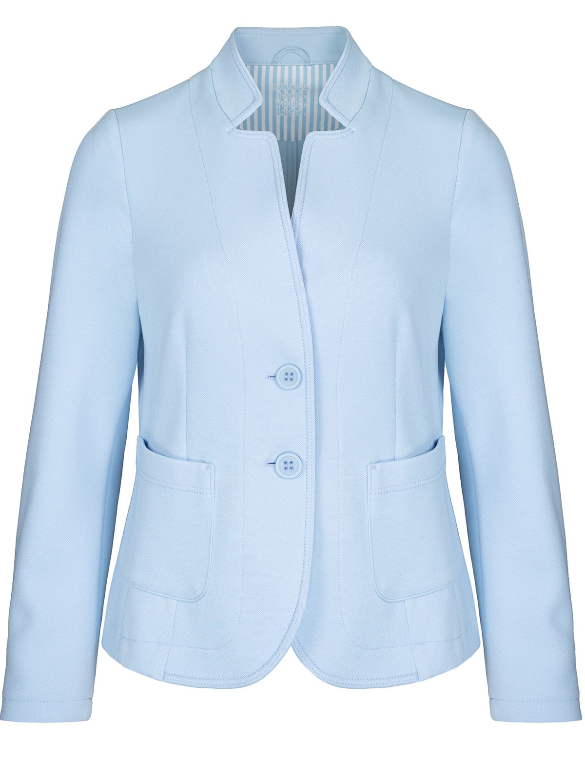 En sportig kavaj från Bianca i en pikéliknande trikå. Modellen är lätt figursydd med hellång ärm, brutet kavajslag och två påsydda fickor fram. Kavajen är ofodrad och knäpps med två knappar.