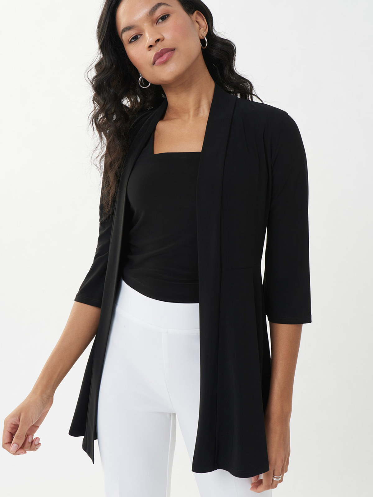 Fin och tunn jacka att sätta till många olika toppar från Joseph Ribkoff. Sjalkrage och utan knäppning. Lätt insvängd i midjan för en fin siluett. Ett toppenplagg att sätta över både toppar och klänning för att känna sig klädd. Finns byxor och kjol i samma kvalitet.