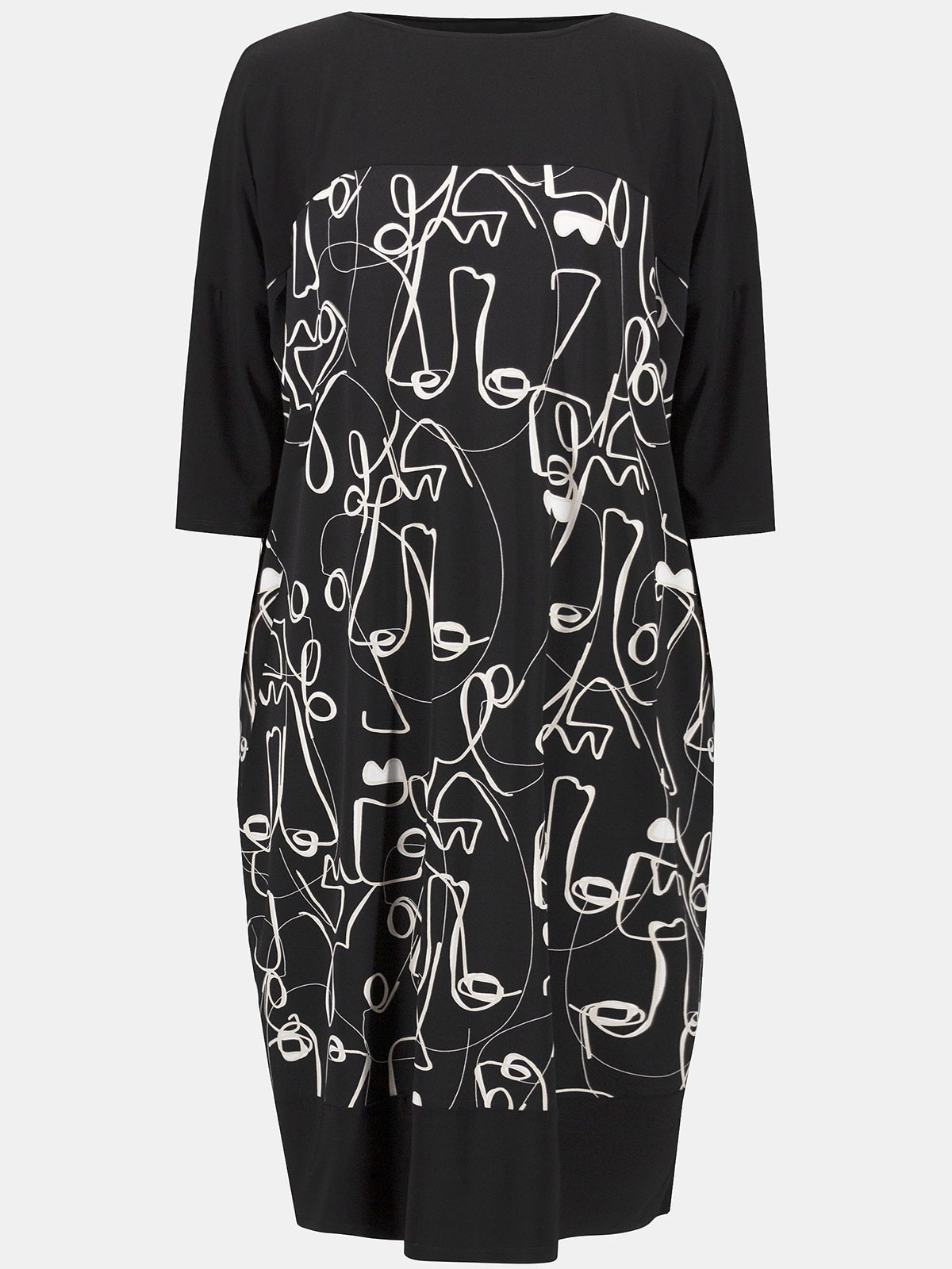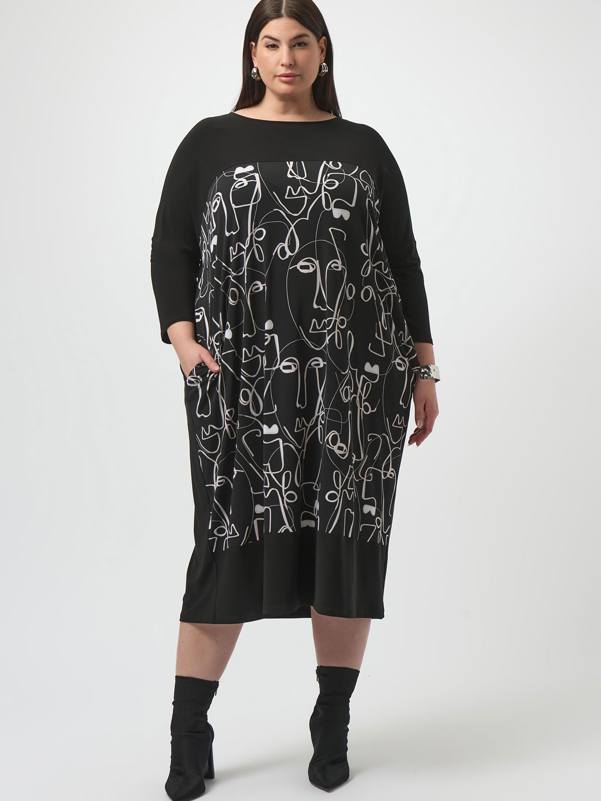 Snygg och skön trikåklänning från Joseph Ribkoff med cremefärgad illustration. Modellen är vid och generös med båtringad hals. Ärmen är av trekvartsläng och smalare som kontrast till den vida siluetten. Klänningen är skrynkelfri och har fickor i sidsömmarna!