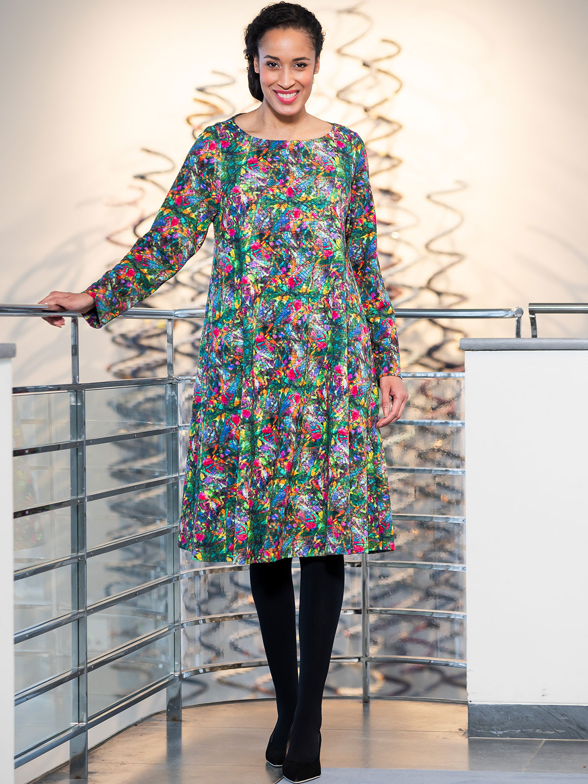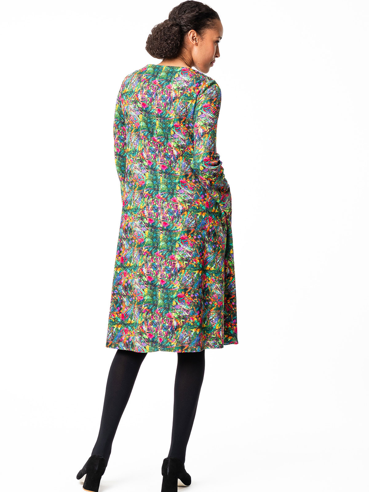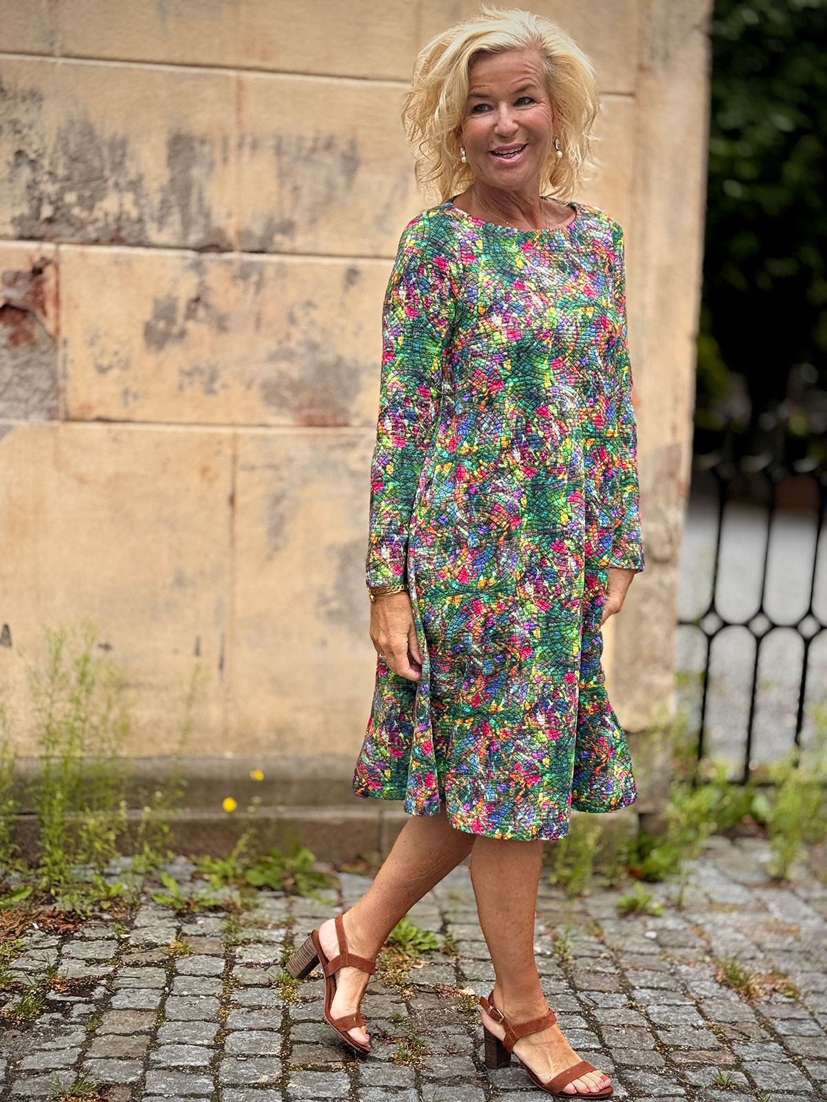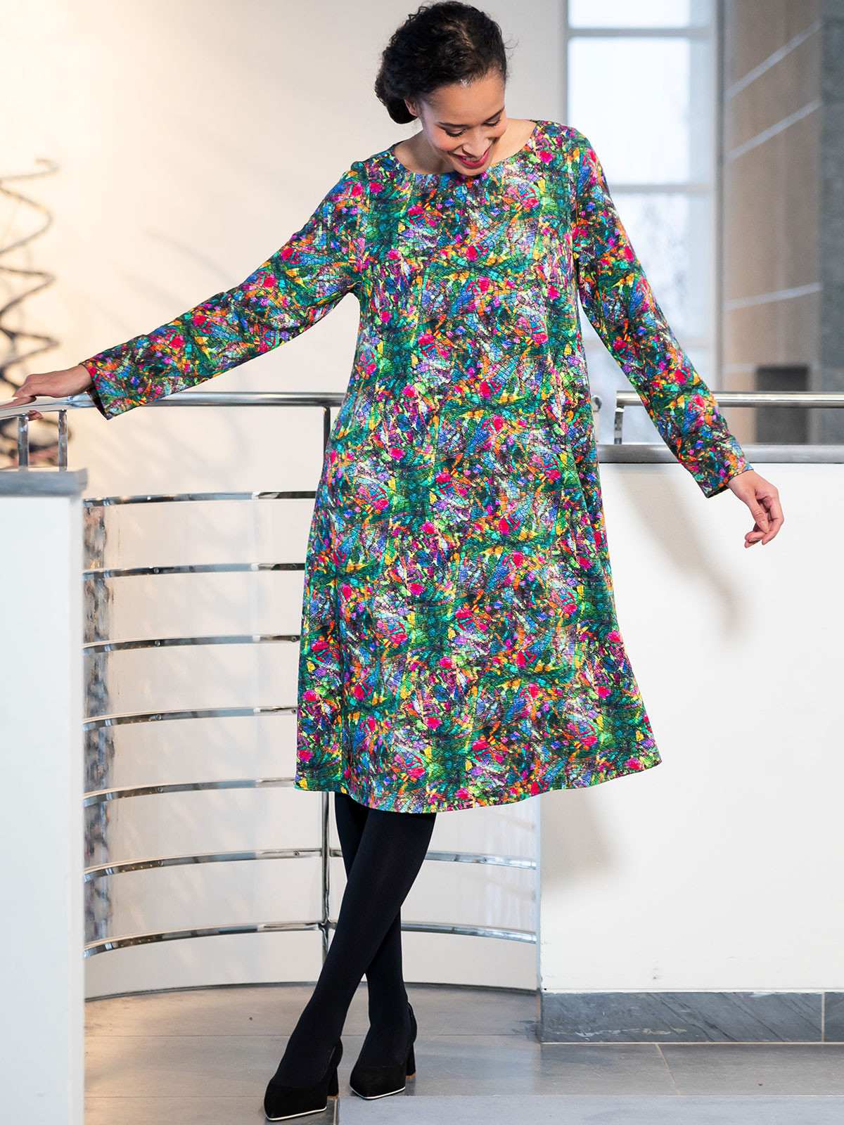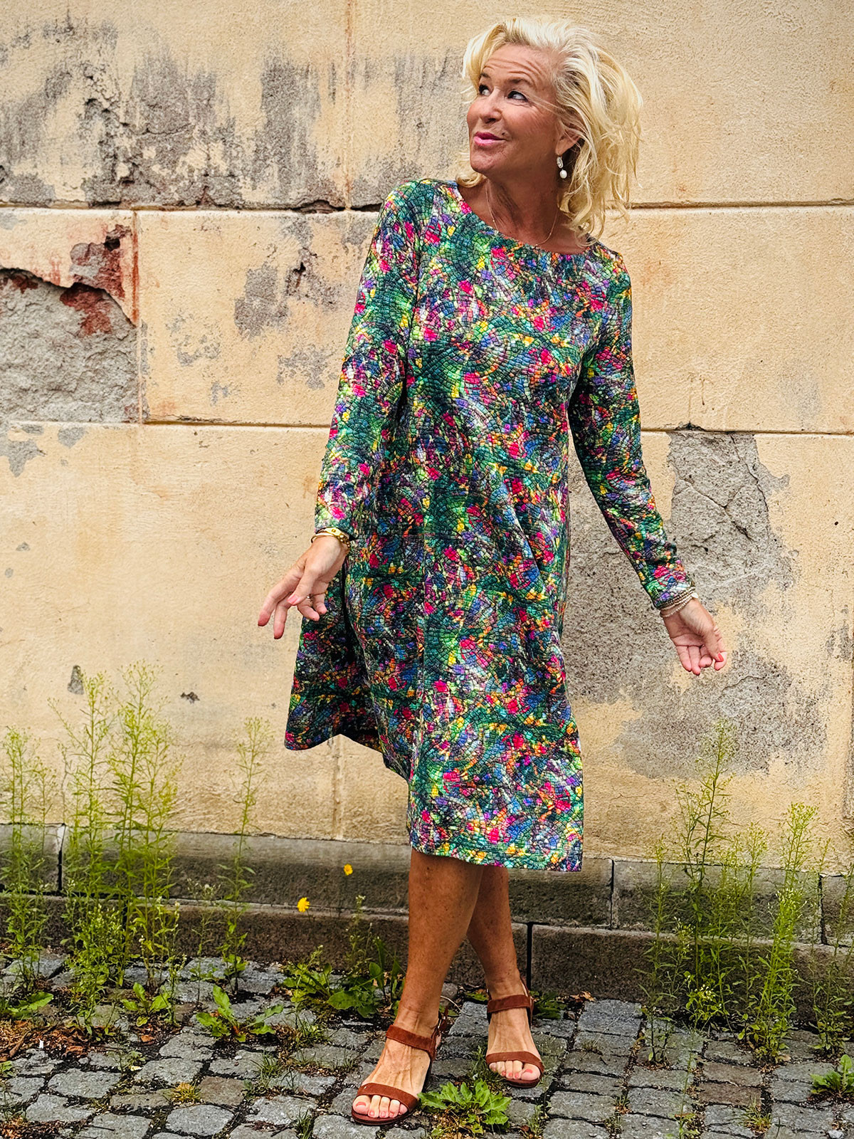 Skön och elegant klänning från Aino i viskostrikå. Modellen är A-linjeformad och har båtringad hals. Ärmen är av trekvartslängd och i sidsömmarna finns det fickor.
