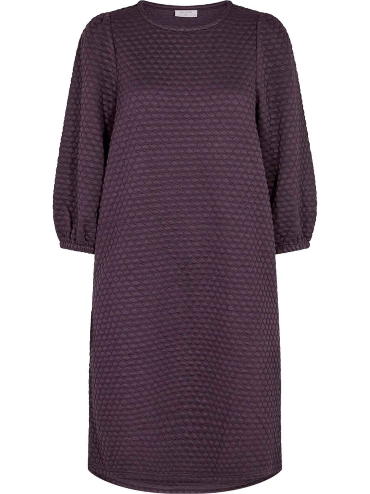 Snygg klänning från FreQuent med en bubblig och stretchig tygtextur. Modellen är rak med rundringad hals, ärmen har puff och är av trekvartslängd med en avsmalnande resår i nederkant. Dolda fickor i sidsömmarna.