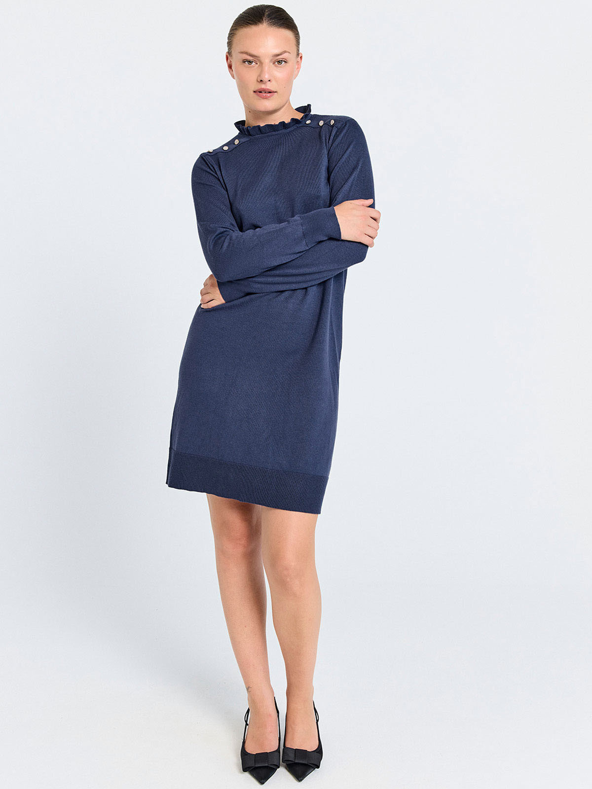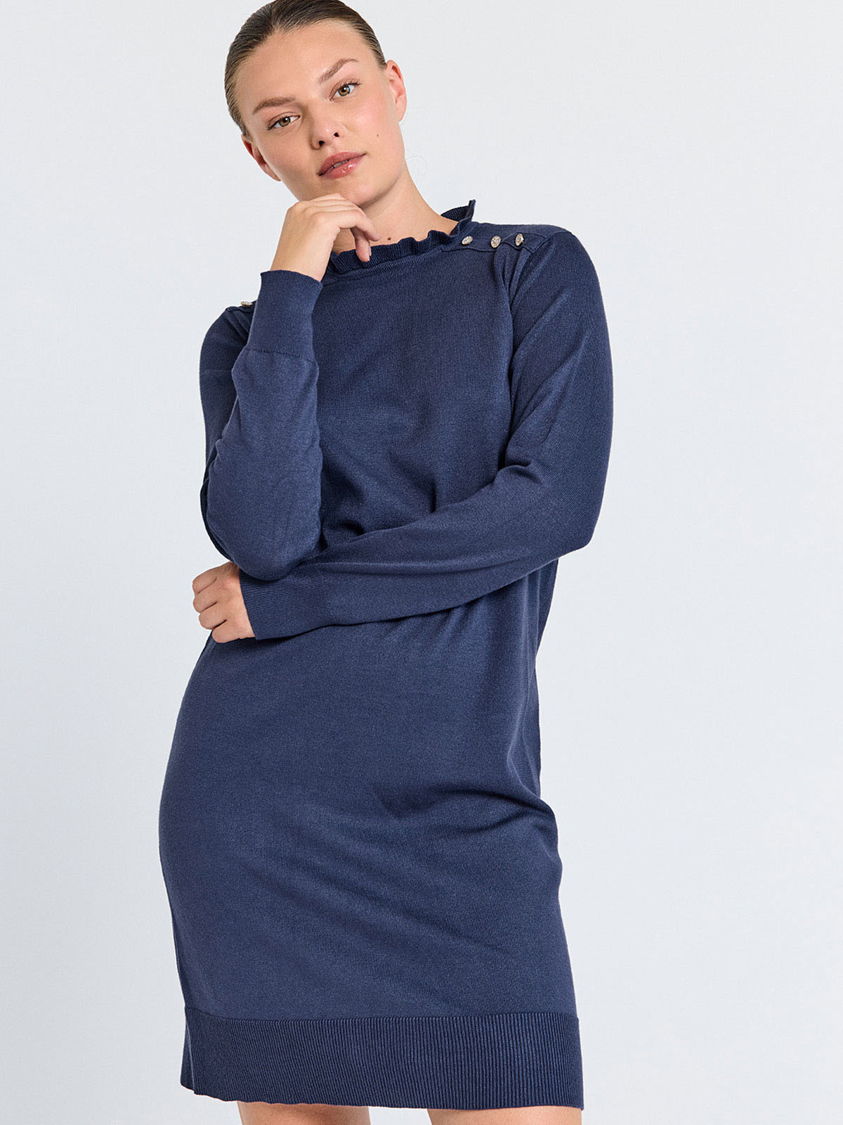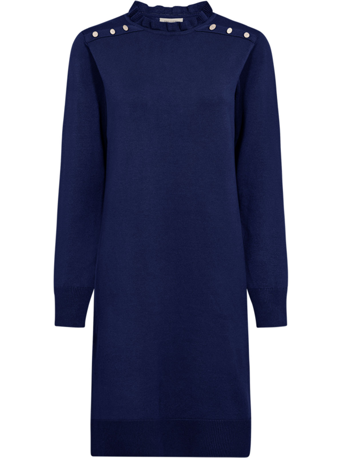 Finstickad klänning från från FreeQuent med dekorativa strassknappar längs axeln. Modellen är klassisk och rak, med volangmudd i den rundade halslinningen. Den hellånga ärmen har muddavslut, liksom klänningen. Inga sprund eller fickor.