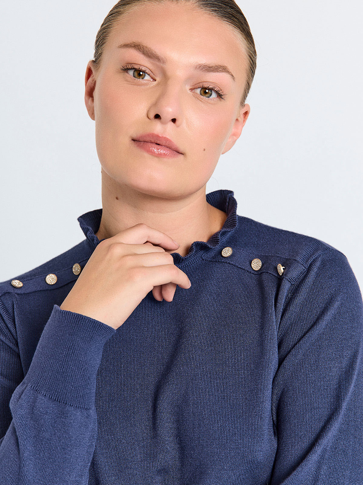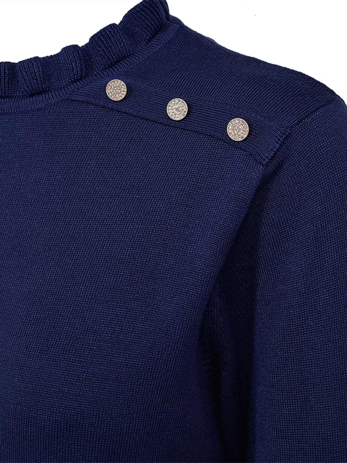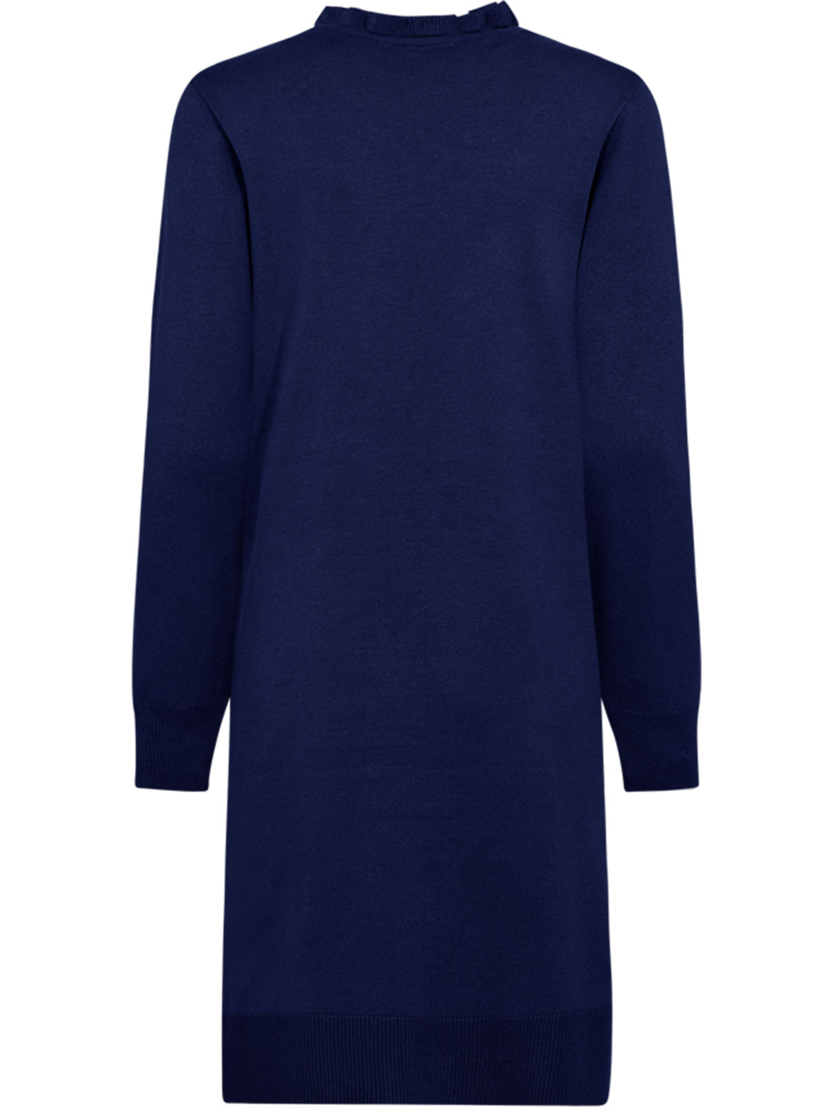 Finstickad klänning från från FreeQuent med dekorativa strassknappar längs axeln. Modellen är klassisk och rak, med volangmudd i den rundade halslinningen. Den hellånga ärmen har muddavslut, liksom klänningen. Inga sprund eller fickor.
