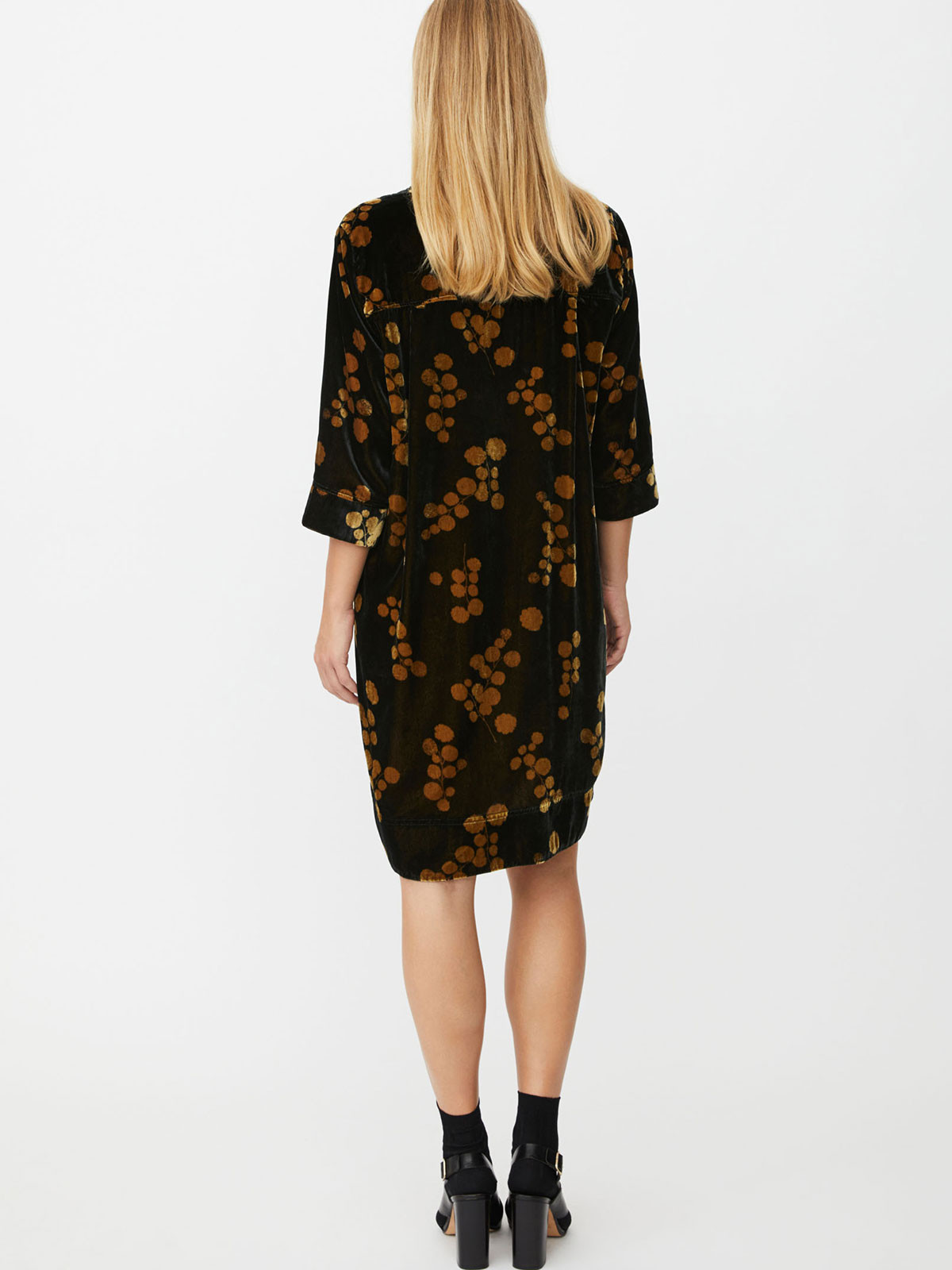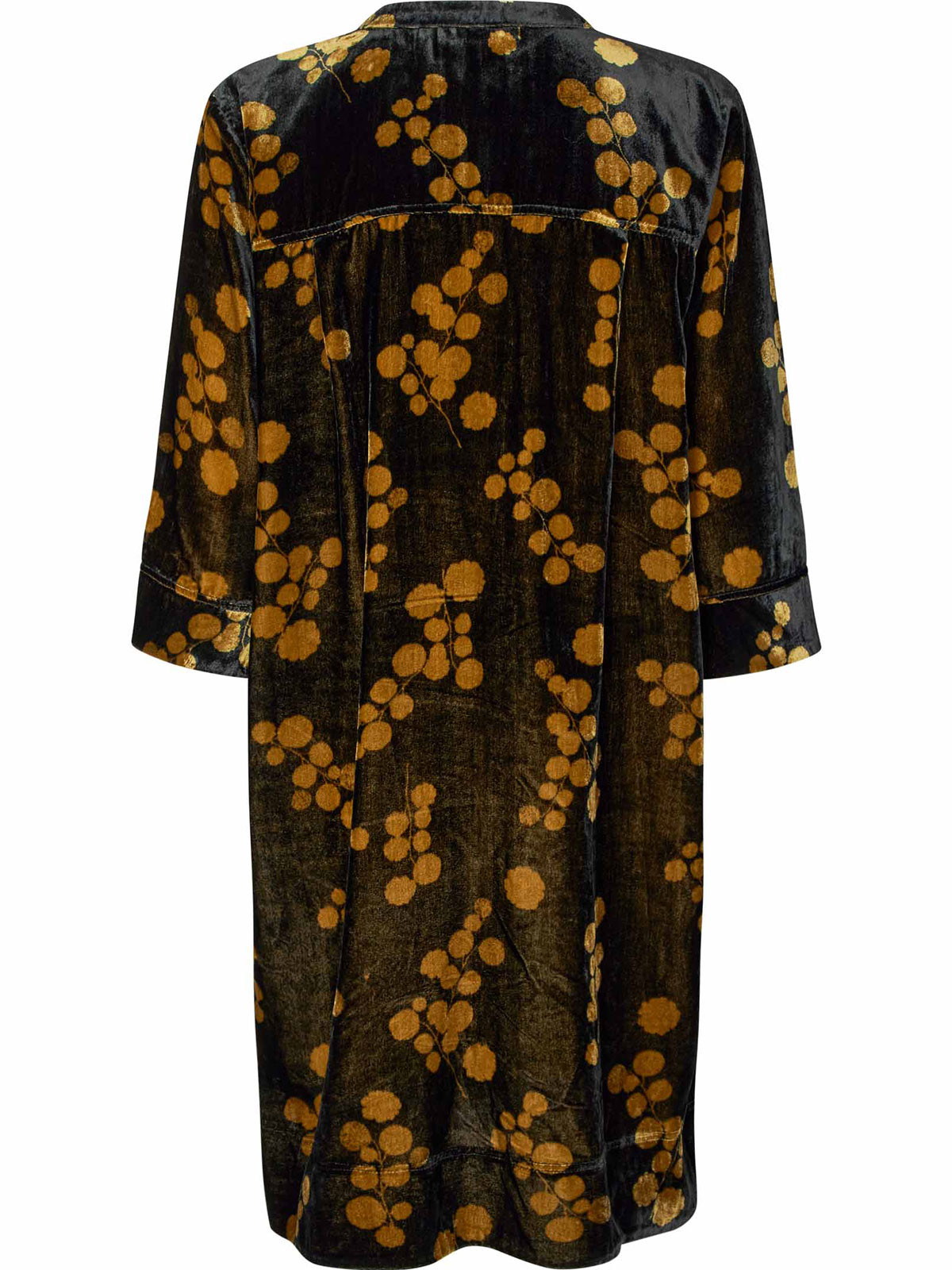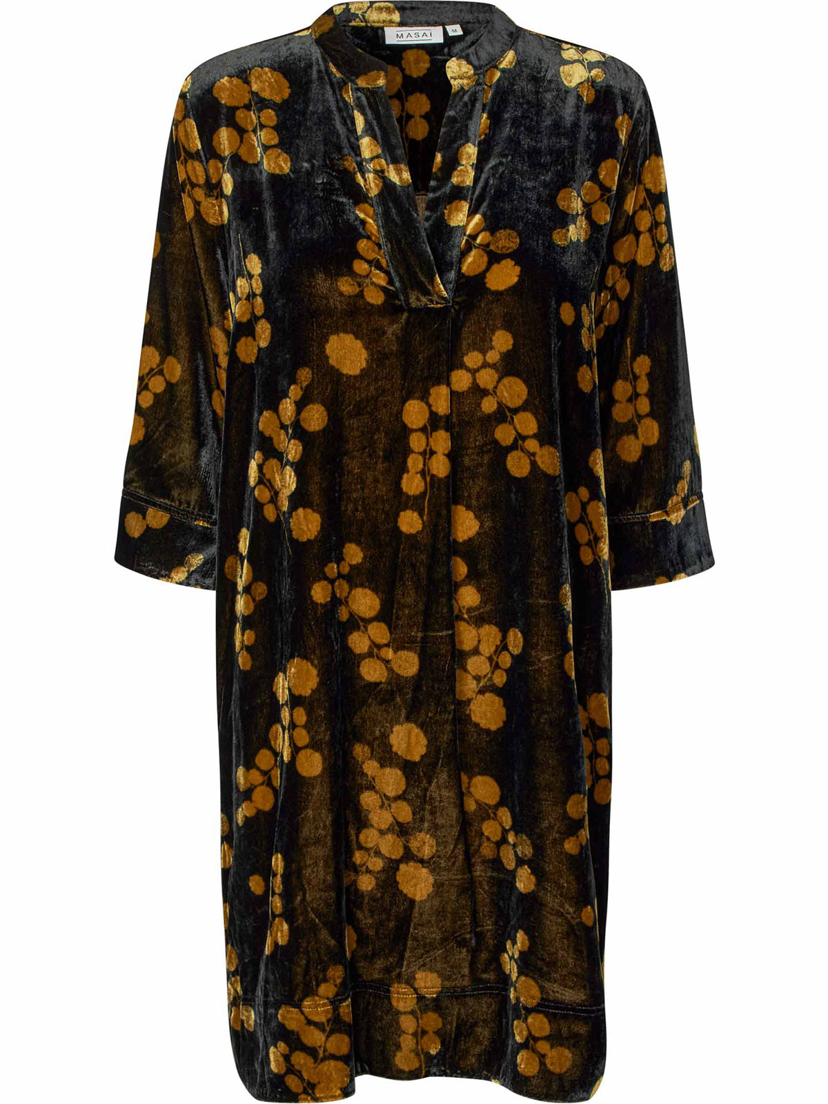 Ljuvlig sammetsklänning från Masai i en vid härlig modell. Klänningen har rundad hals med V-formad öppning fram. Ärmen är trekvartslång och nederdelen är läött rundad och längre bak.