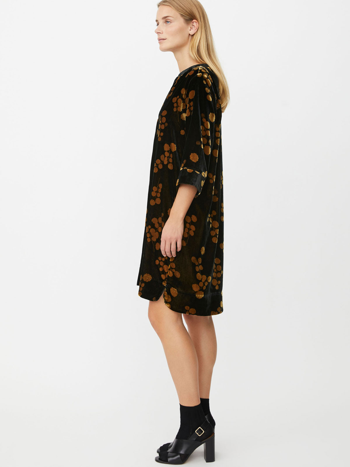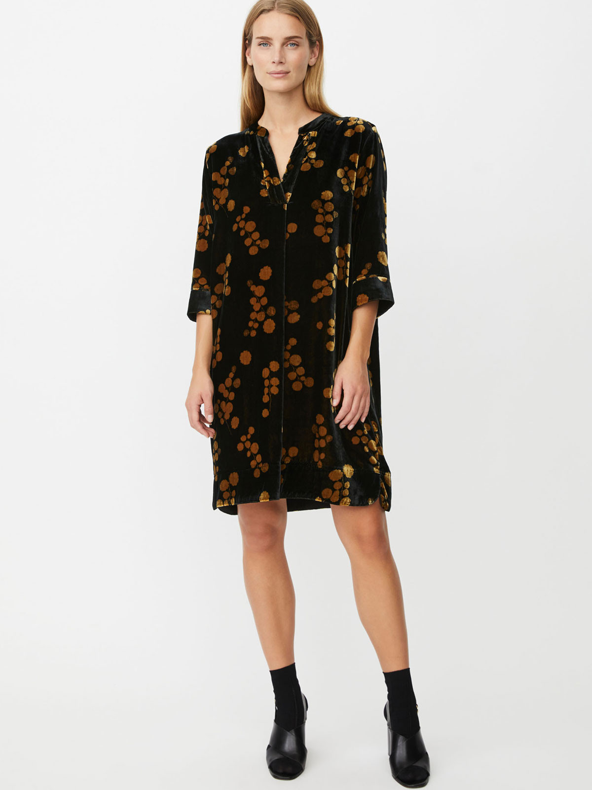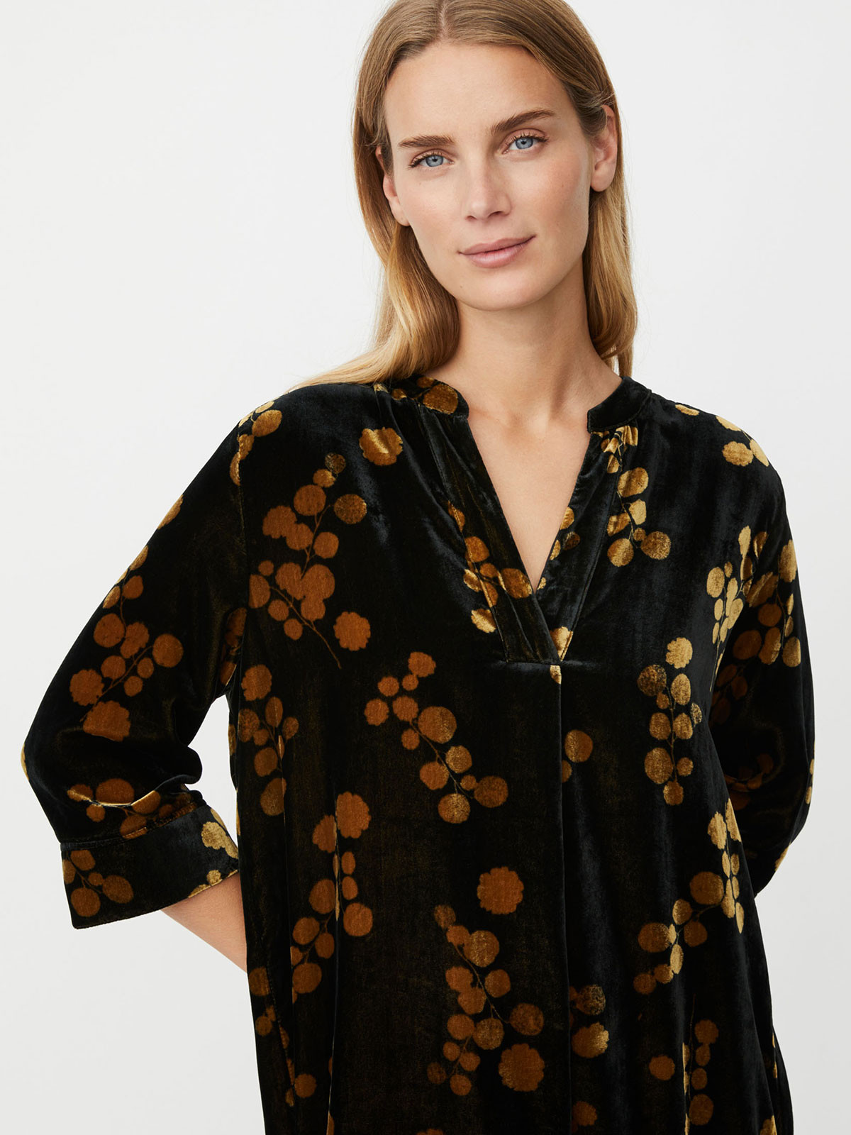 Ljuvlig sammetsklänning från Masai i en vid härlig modell. Klänningen har rundad hals med V-formad öppning fram. Ärmen är trekvartslång och nederdelen är läött rundad och längre bak.