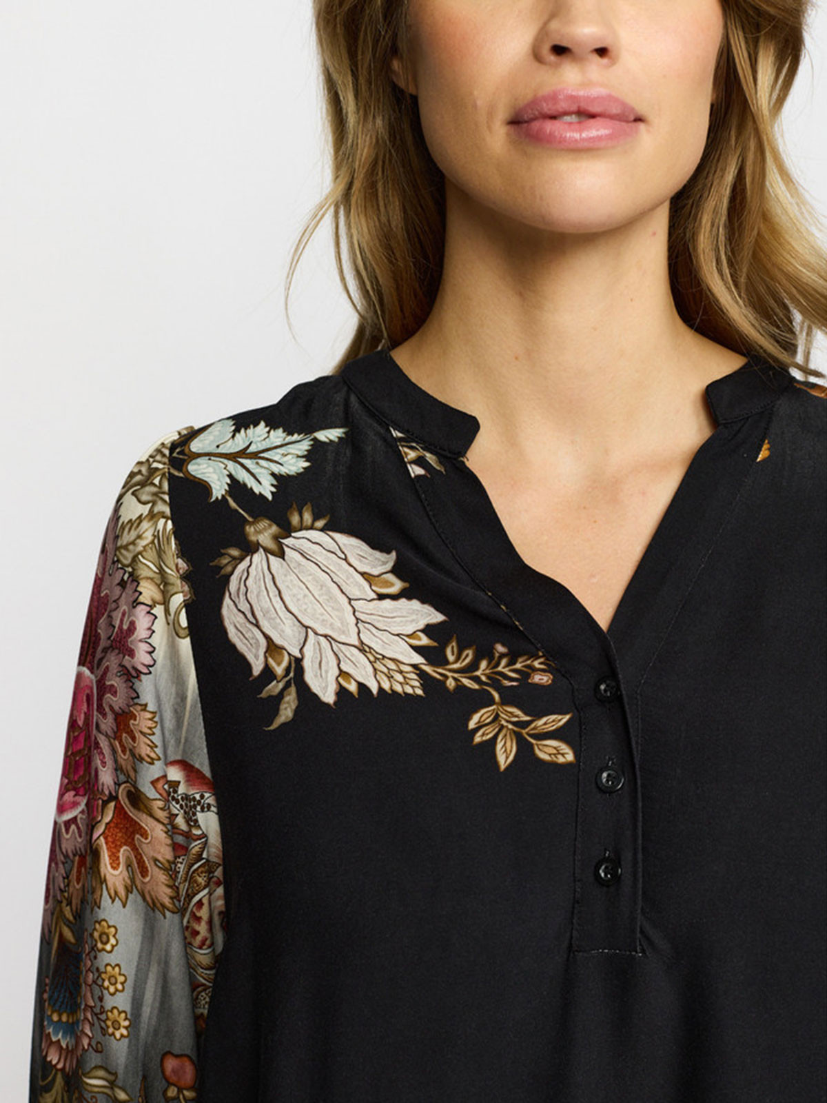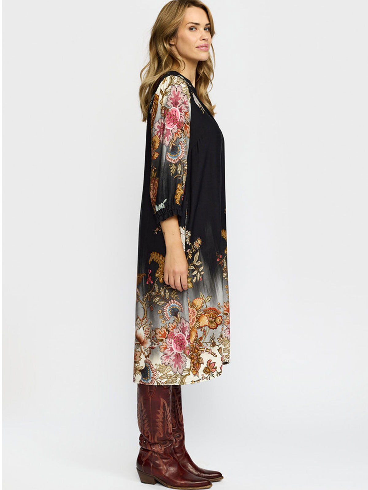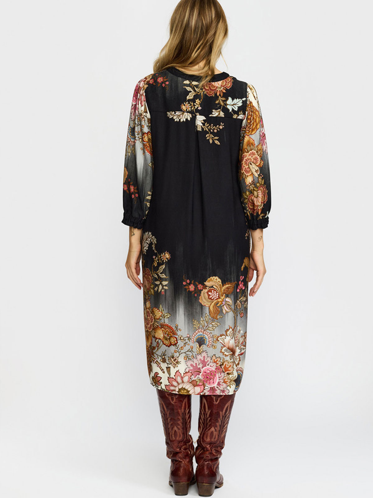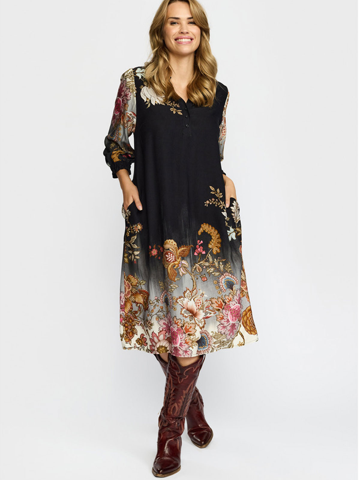 Vackert mönstrad klänning från 2-BIZ i en avslappnad stil. Modellen har rundad hals med V-formad öppning som justeras med tre knappar. Ärmen har liten puff, är trekvartslång och har en bred resår i nederkant. Dolda fickor i sidsömmarna och helt rak nederkant. Ingen slitz eller sprund.