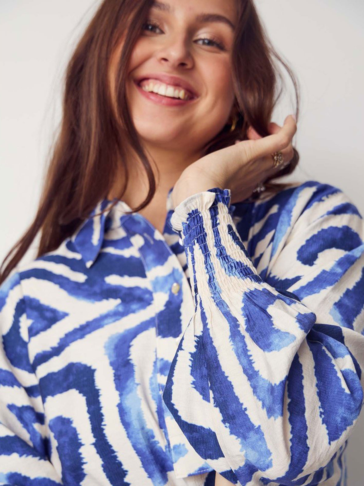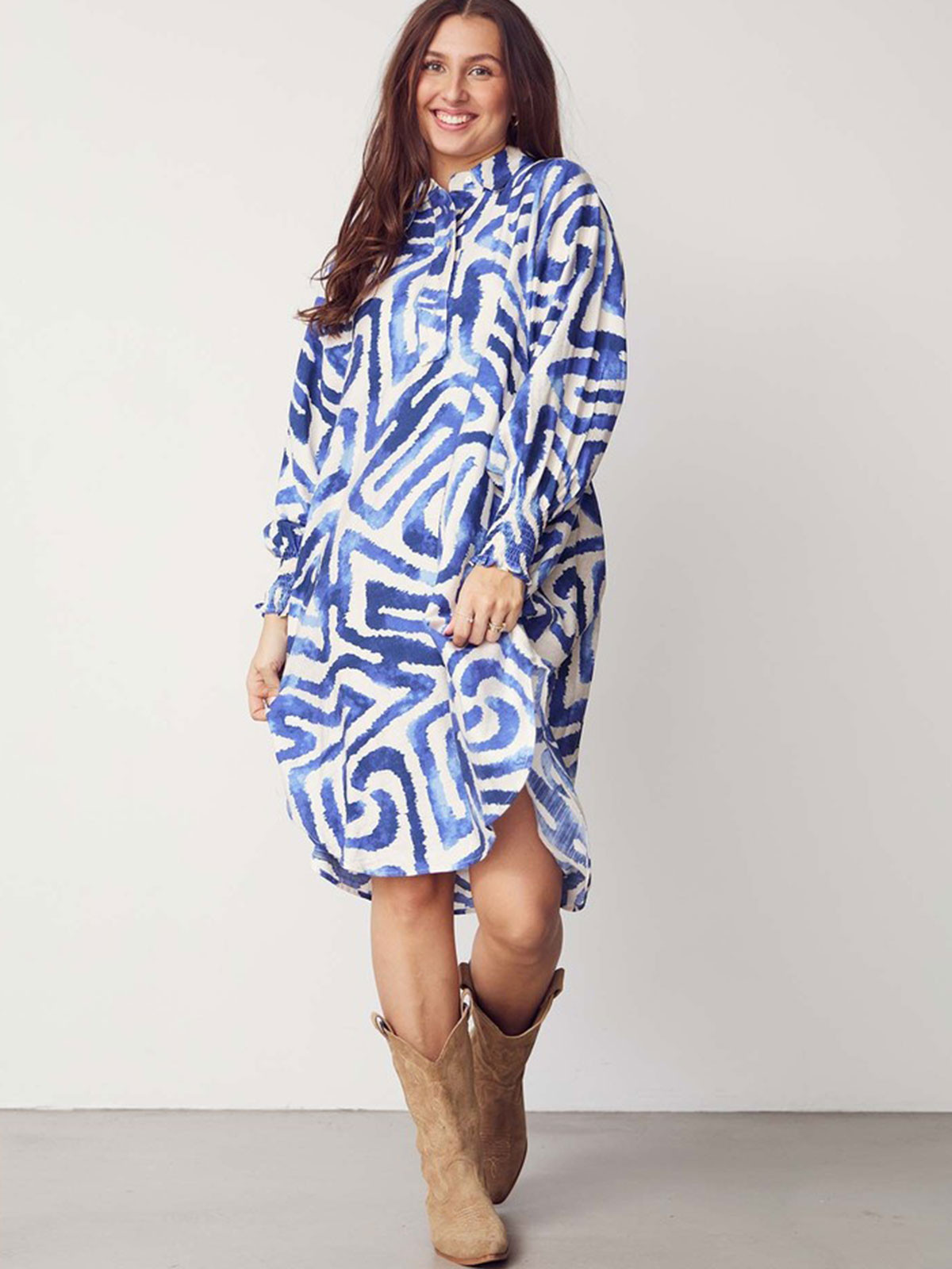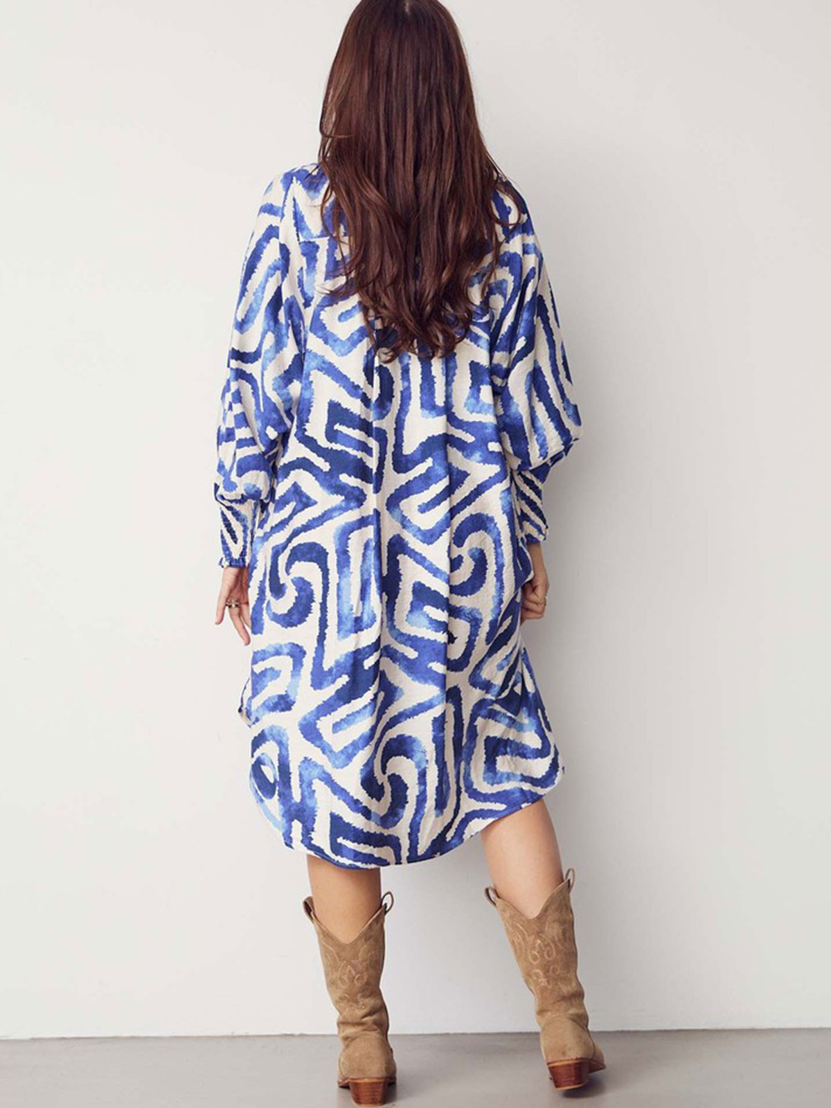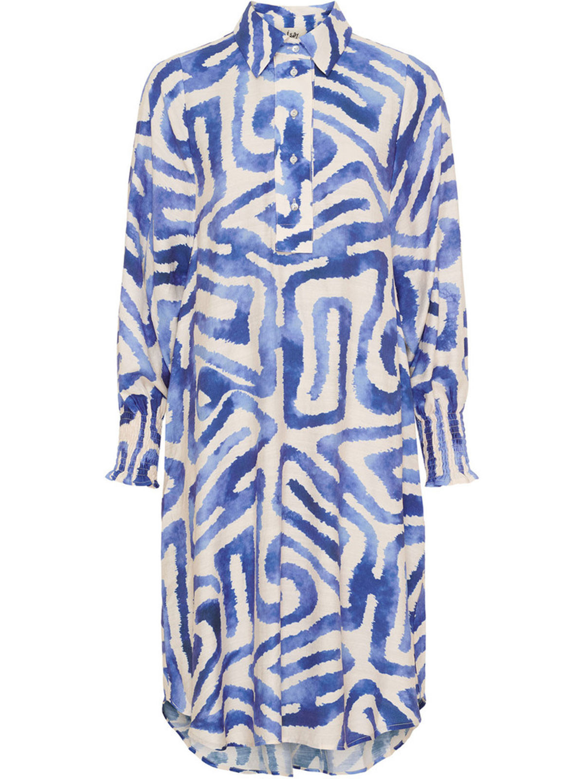 Härlig klänning från Isay i ett fint grafiskt mönster i blått. Modellen har skjortkrage och knäppning ner till midjan. Ärmen är hellång och vid och avslutas med bred smock. Klänningen är vid och rak med dolda fickor i sidsömmarna. Nederkanten är mjukt rundad och längre bak.