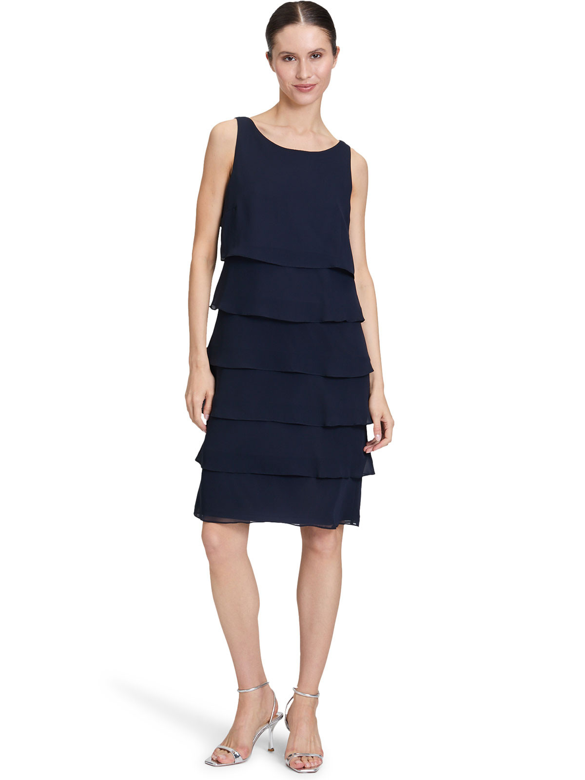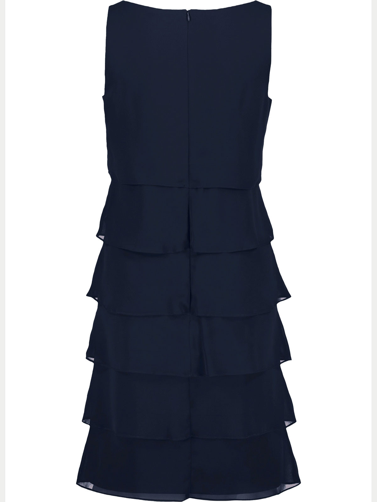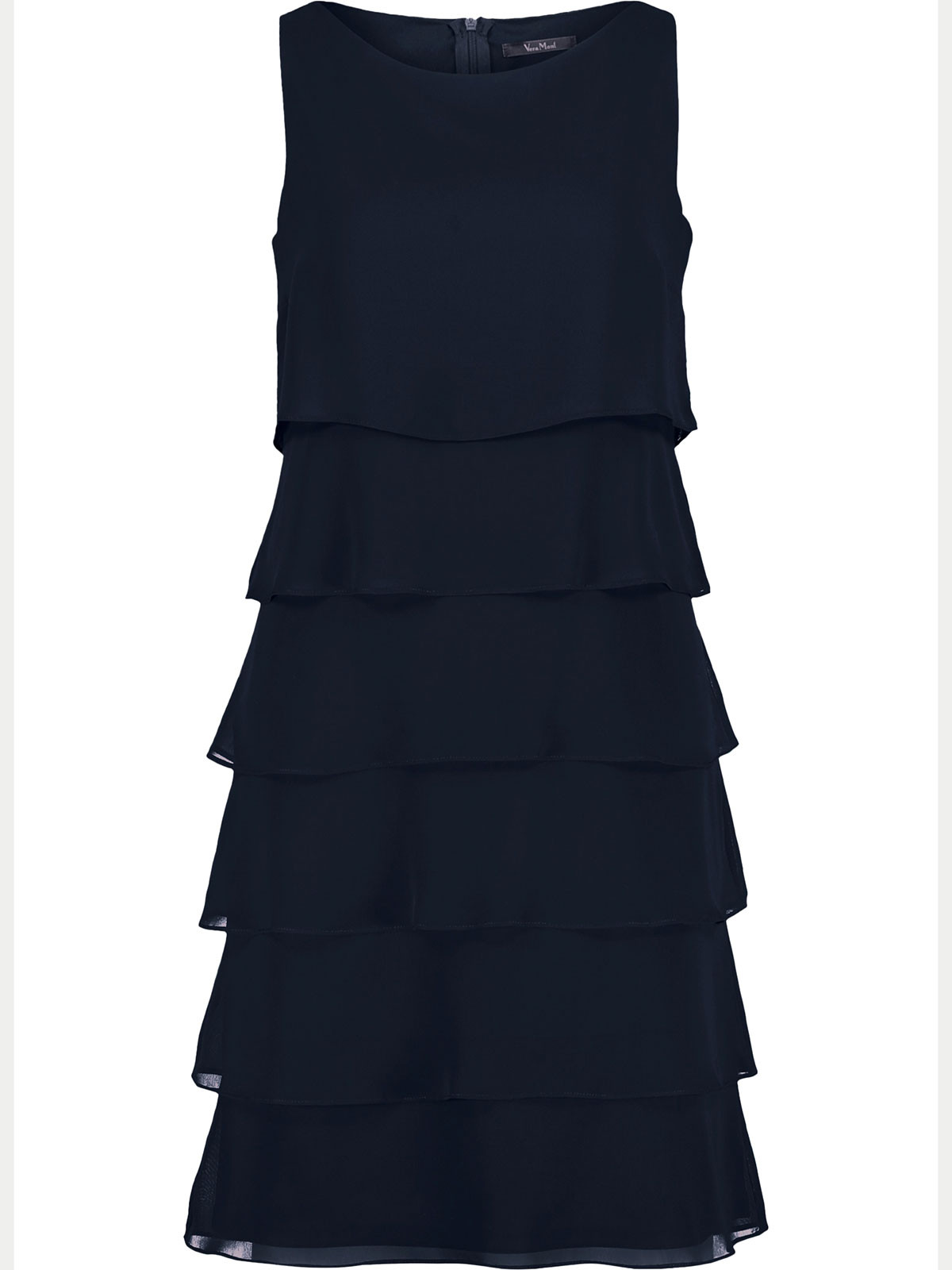 Vacker ärmlös klänning i en marinblå färg från Vera Mont. Modellen är rak och har mjukt rundad hals. Från midjan och neråt är det tunna tyget lagt i volanger som sveper fint när du rör dig. Hela klänningen är fodrad, inga fickor. Den stängs med ett dolt blixtlås bak i nacken.