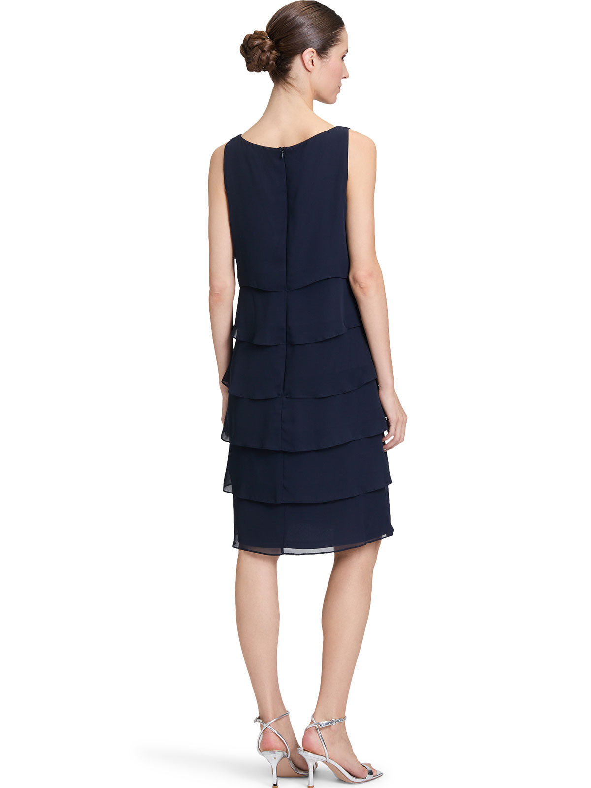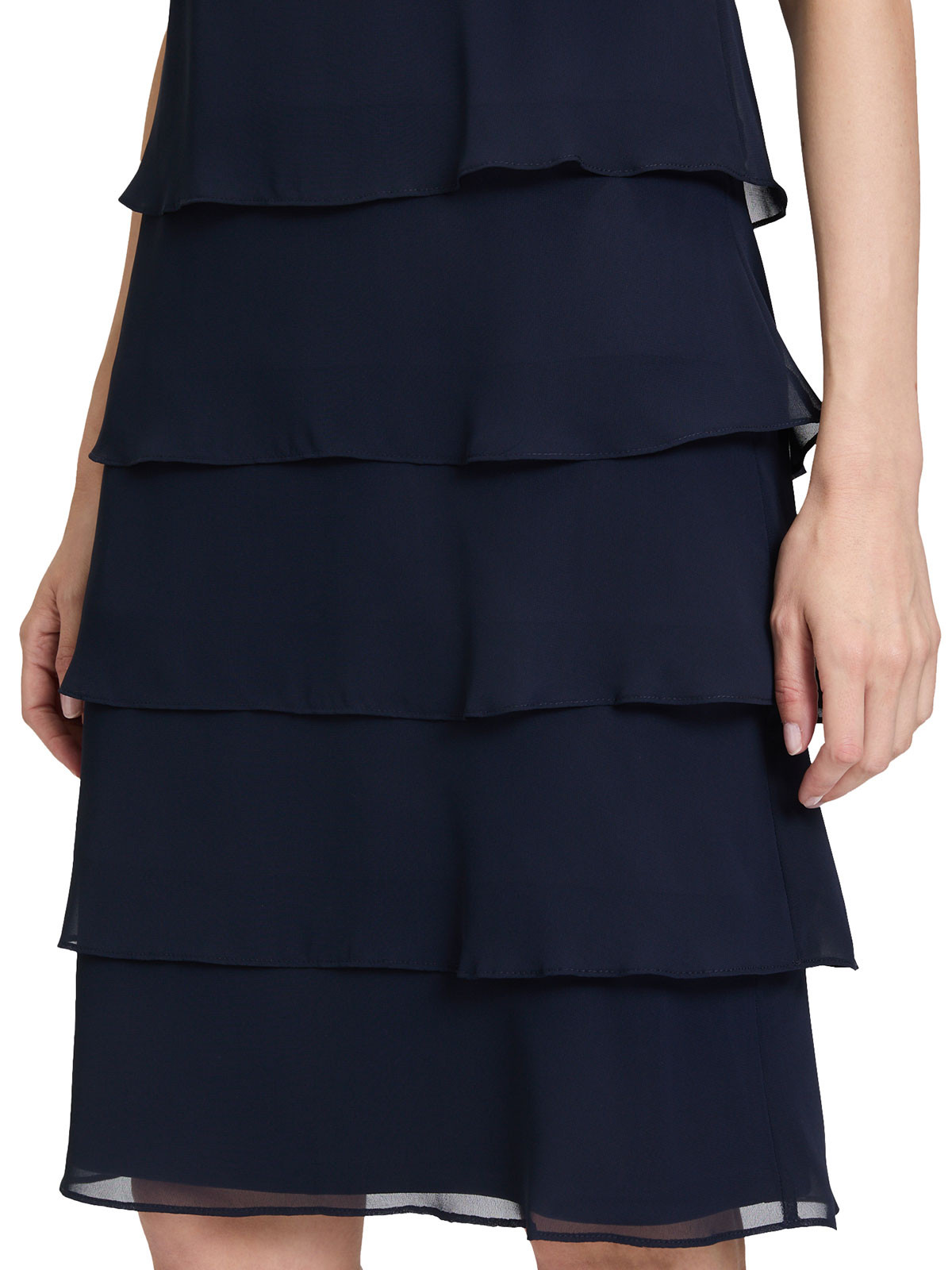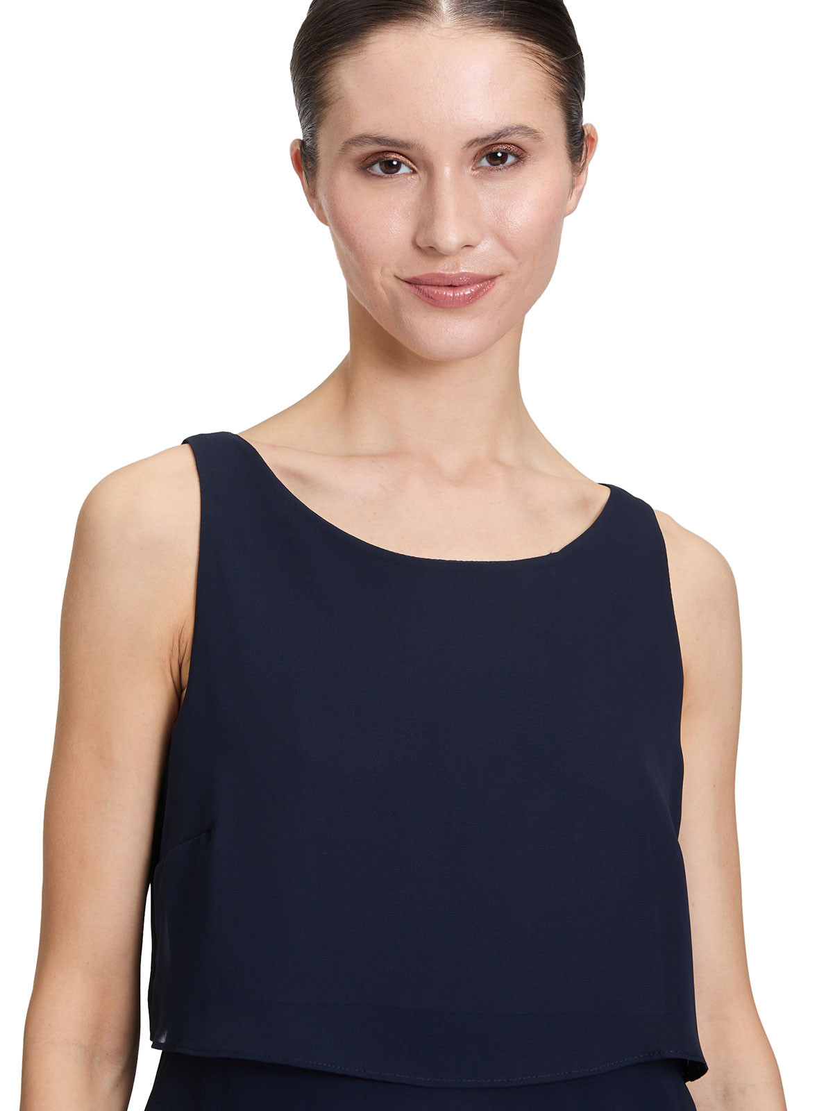 Vacker ärmlös klänning i en marinblå färg från Vera Mont. Modellen är rak och har mjukt rundad hals. Från midjan och neråt är det tunna tyget lagt i volanger som sveper fint när du rör dig. Hela klänningen är fodrad, inga fickor. Den stängs med ett dolt blixtlås bak i nacken.