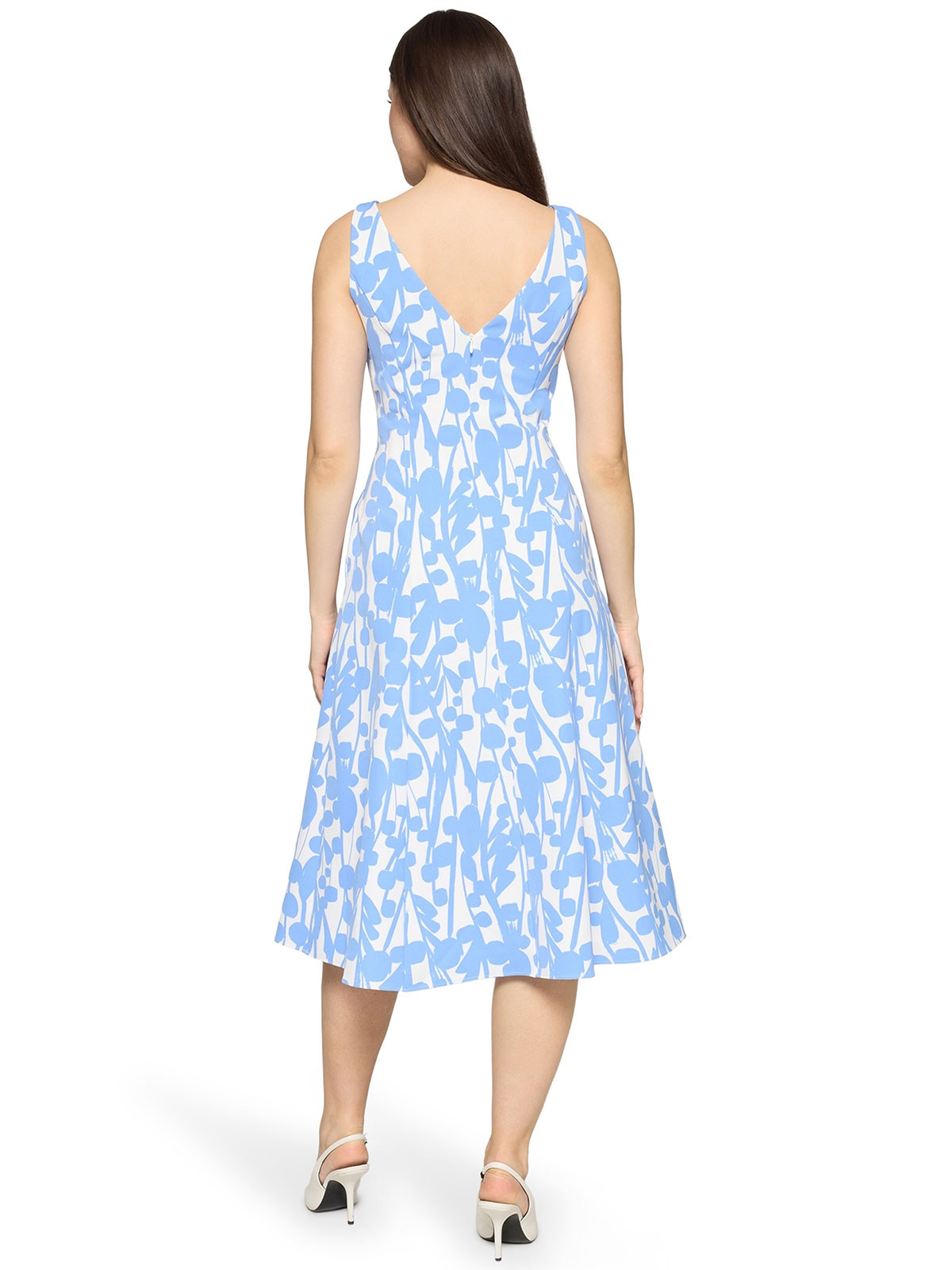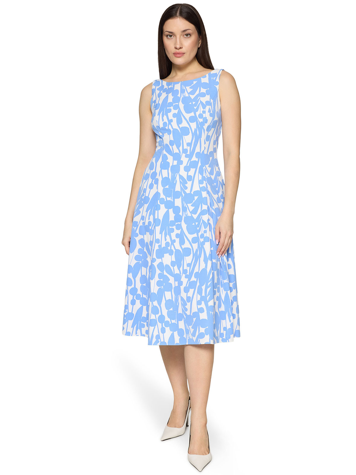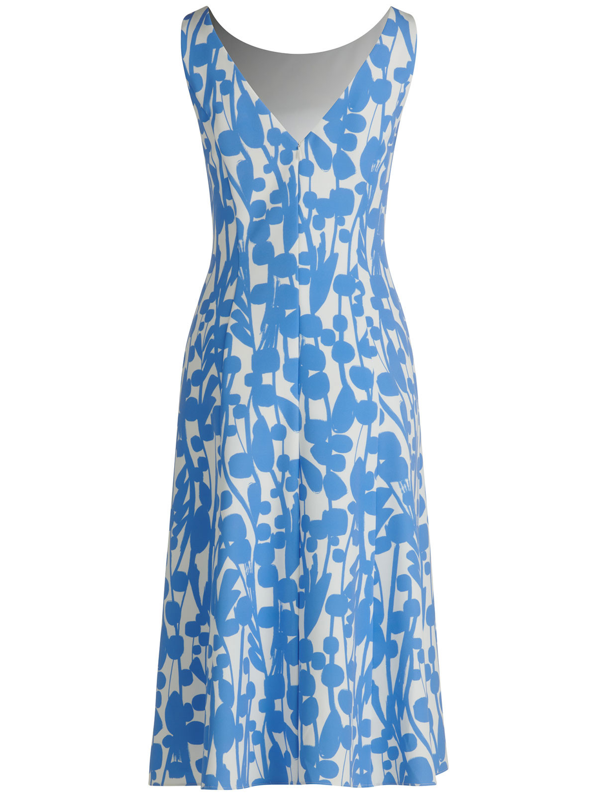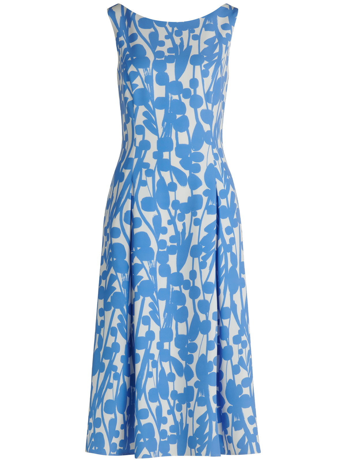 En vacker knälång klänning från Vera Mont. Modellen är formsydd upptill och har rundad hals och V-formad baksida. Den är ärmlös och från midjan klockar kjolen ut sig i en vidare form. Dolda fickor i sidsömmarna, fodrad och dold dragkedja på ryggen.