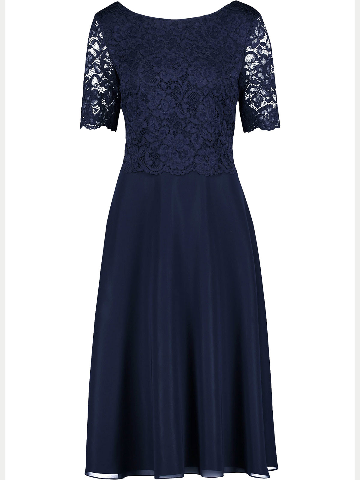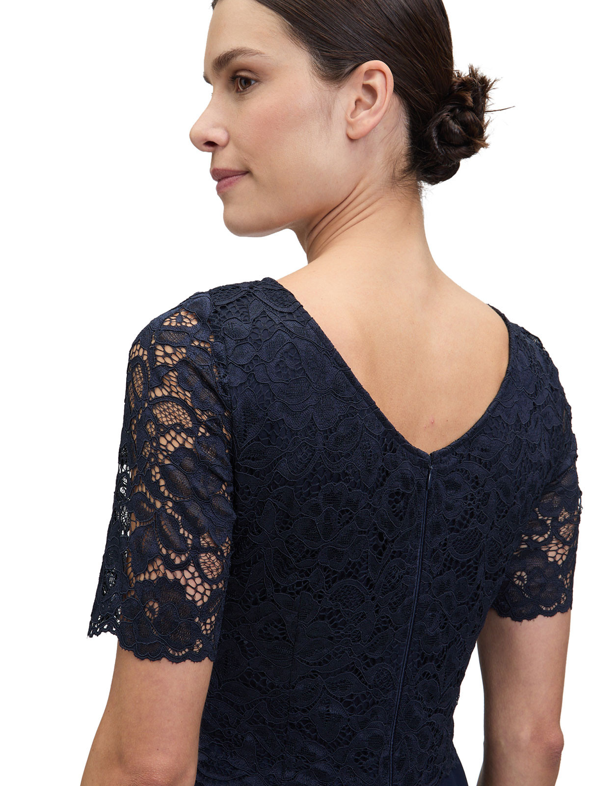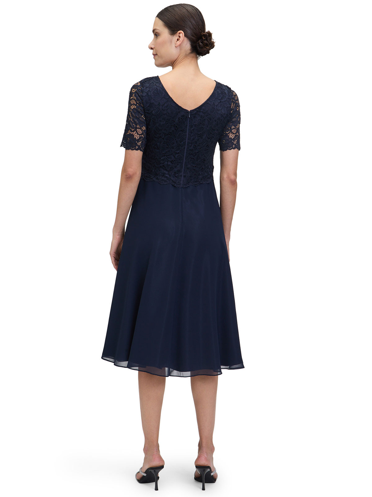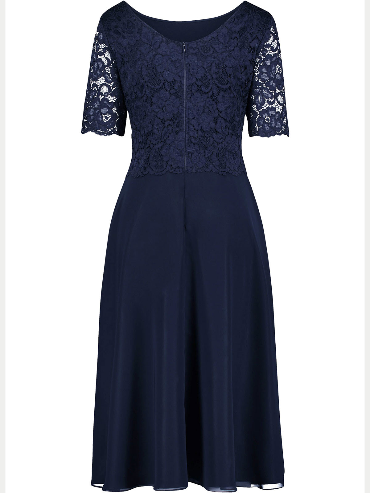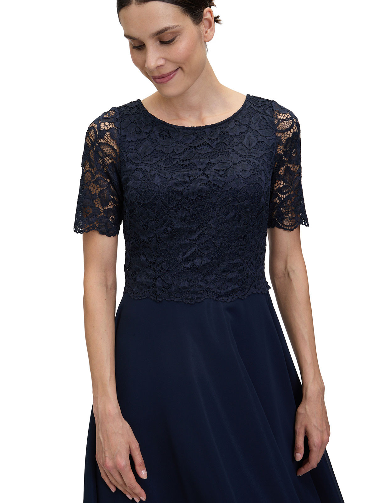 Vacker klänning från Vera Mont med spets på överdelen och chiffongkjol. Den vackra överdelen har båtringad hals som går över i en mjukt V-ringad baksida. Klänningen är fodrad med ett blankt och mjukt trikåtyg som förhindrar genomlys över byst och kjol. Den korta vida ärmen har genomlys under spetsen. Livet har en fast linning innan kjolen breder ut sig i en klockad form. Klänningen stängs på baksidan med en dold dragkedja.