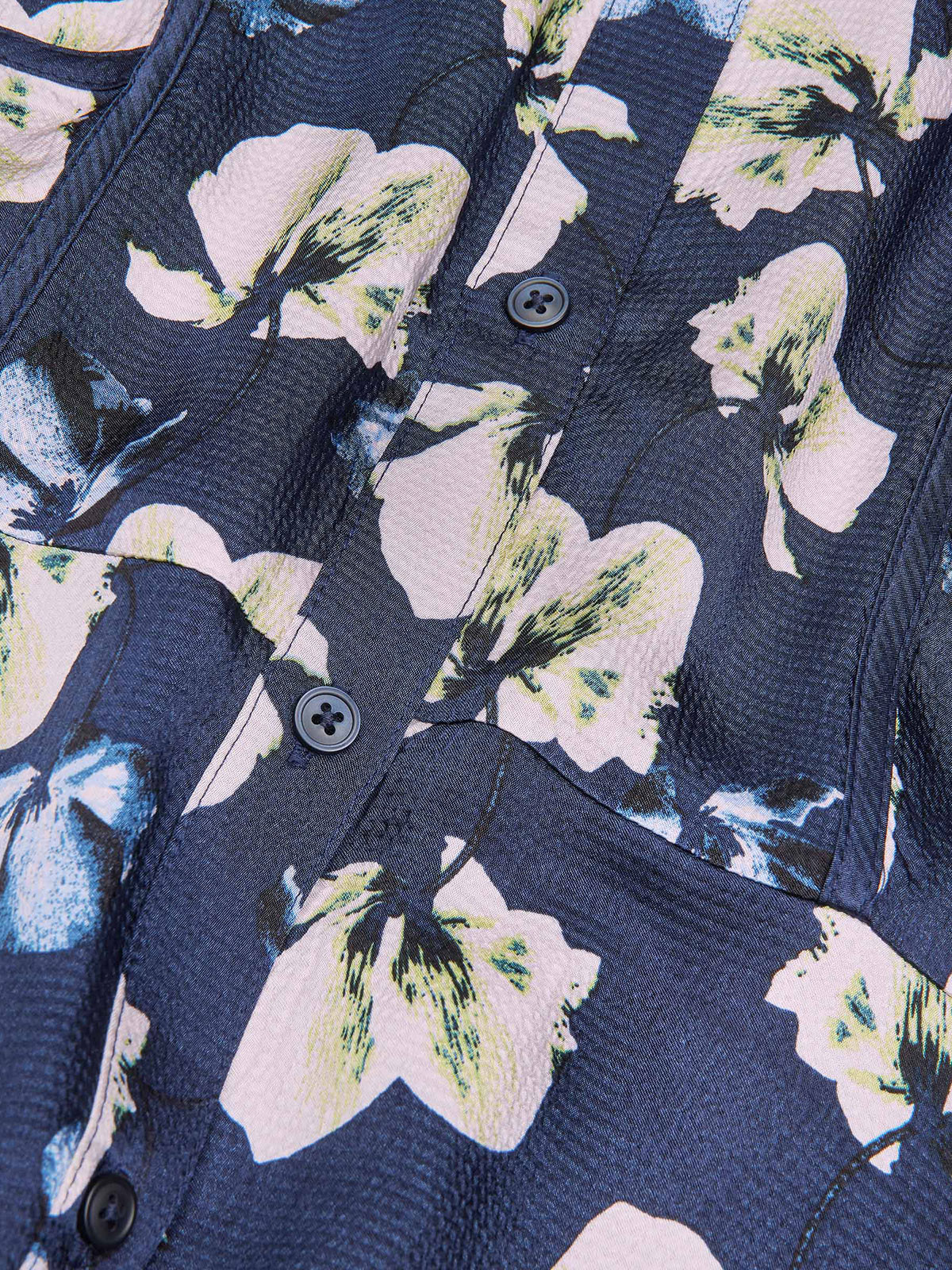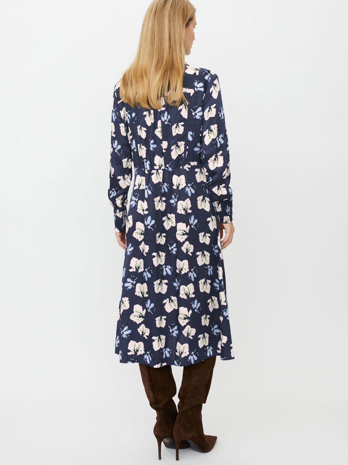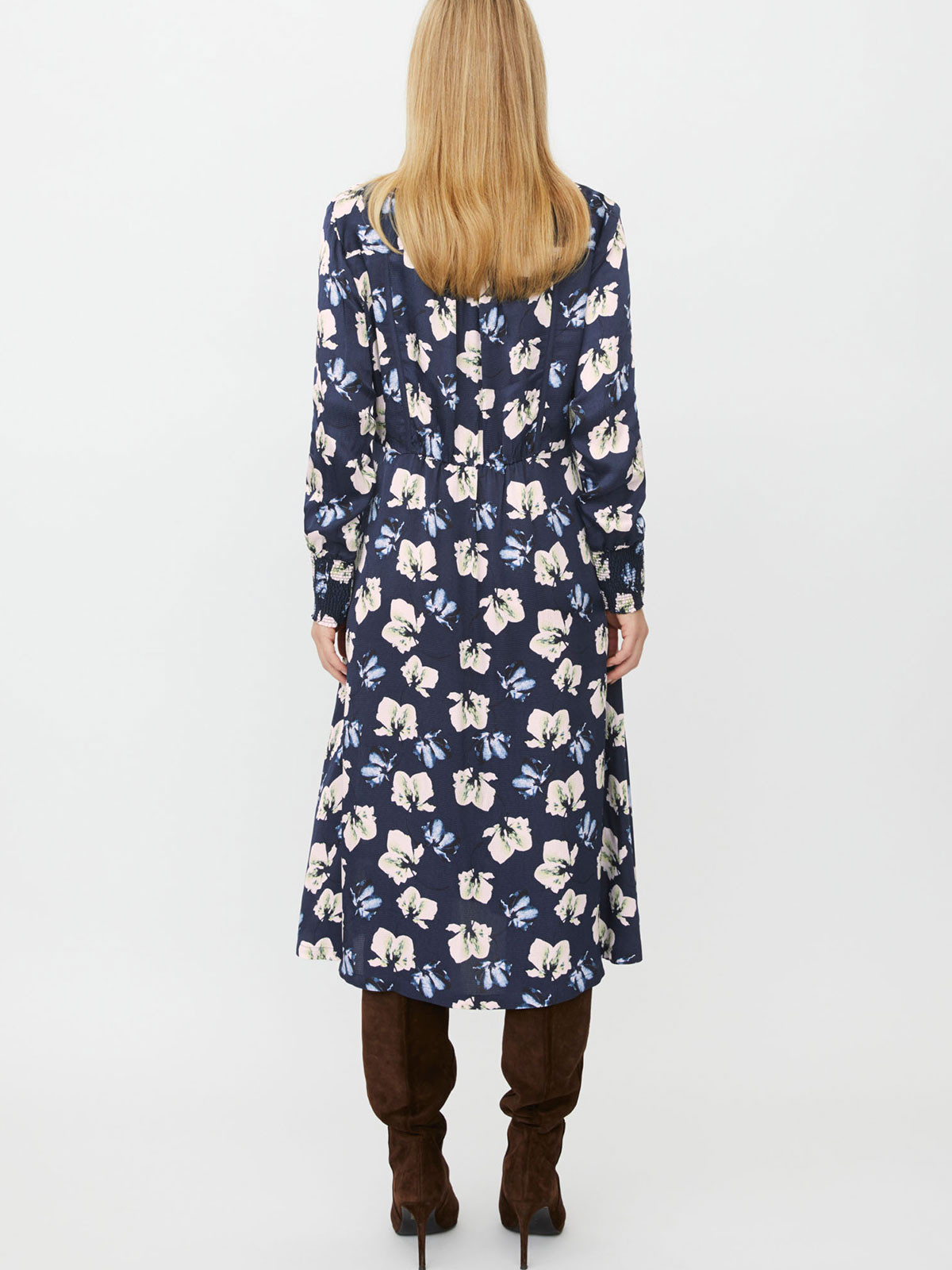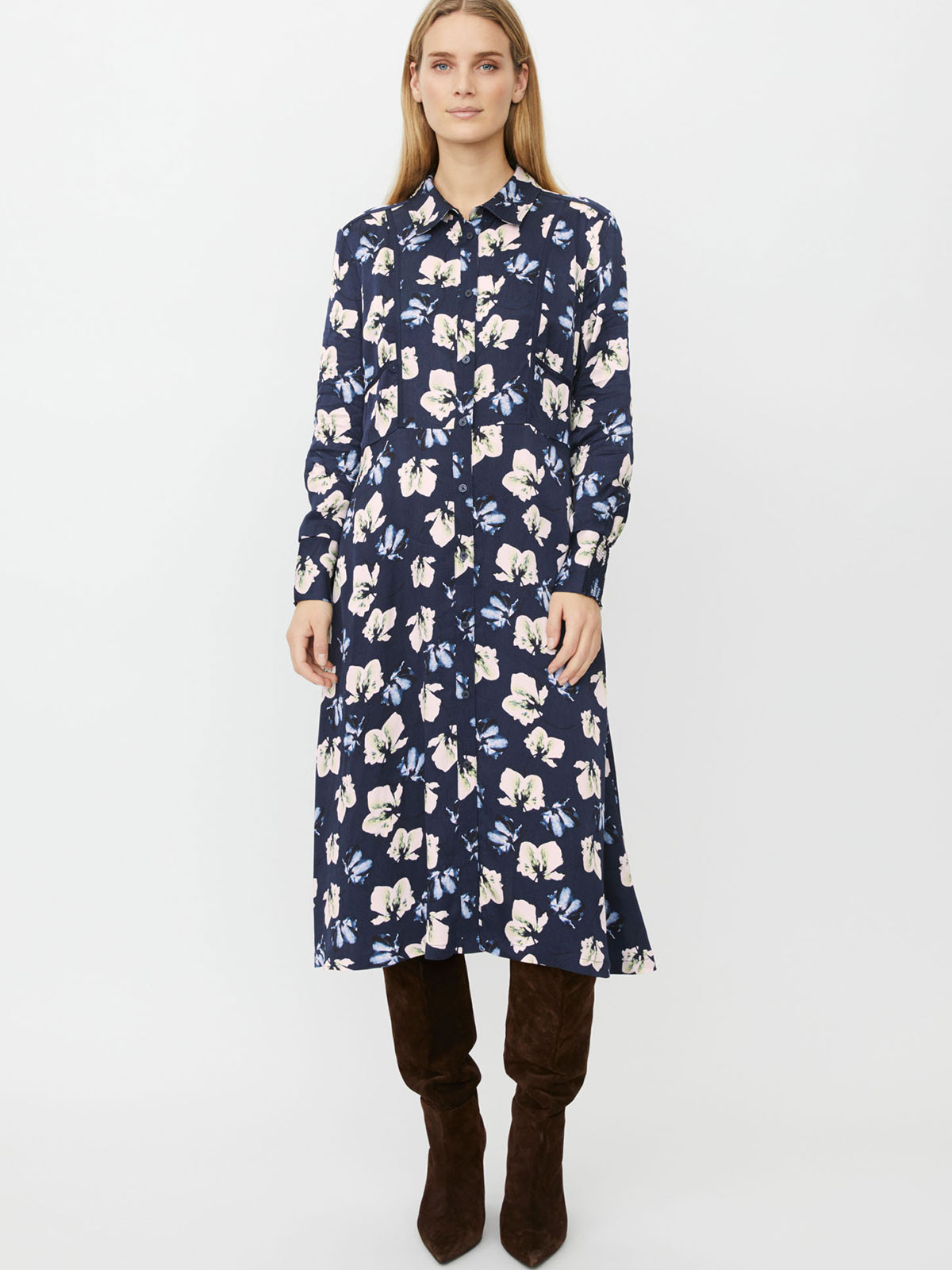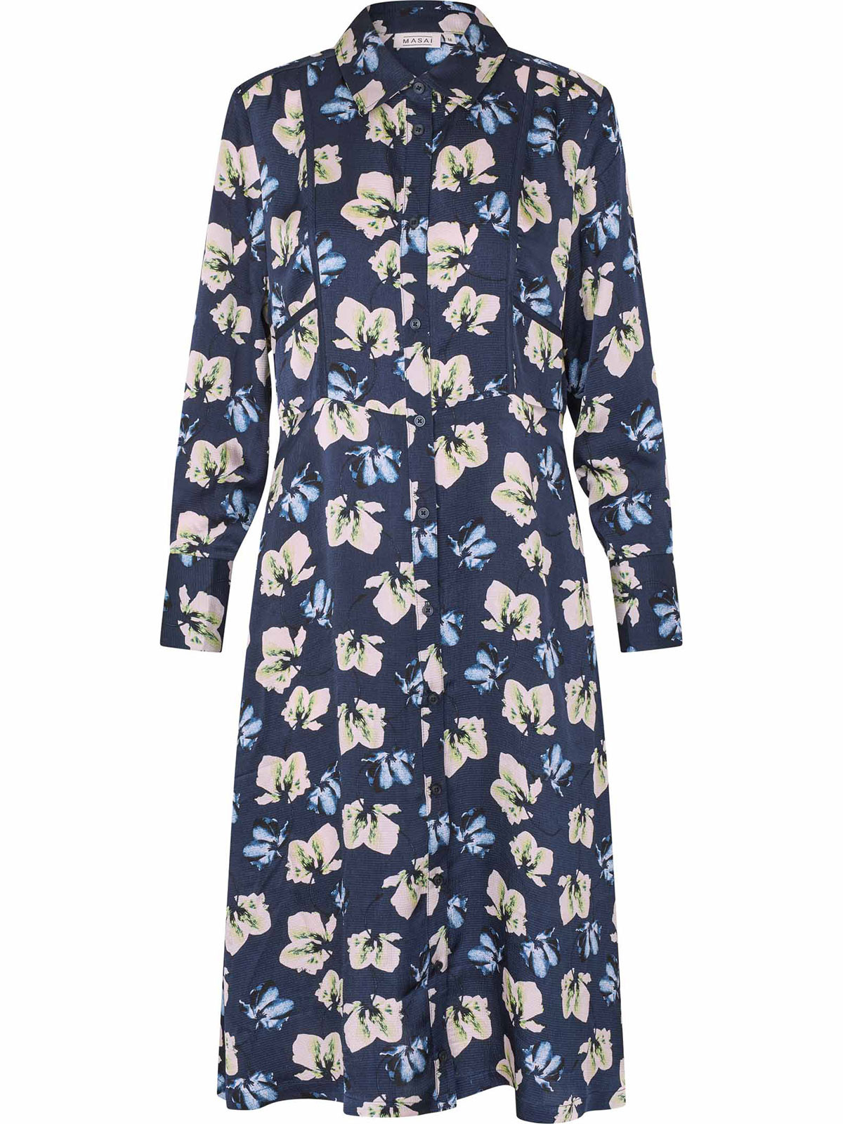 En längre klänning från Masai i ett fint blommönster på marin botten. Modellen är vid, har knappar hela vägen, och har fina kantband framtill på överdelen. Halsen har krage och den hellånga ärmen är vid och avslutas med en smockkant på baksidan. Kjolen breder ut sig i en A-linje och nederkanten är rak. Dolda fickor i sidsömmarna.
