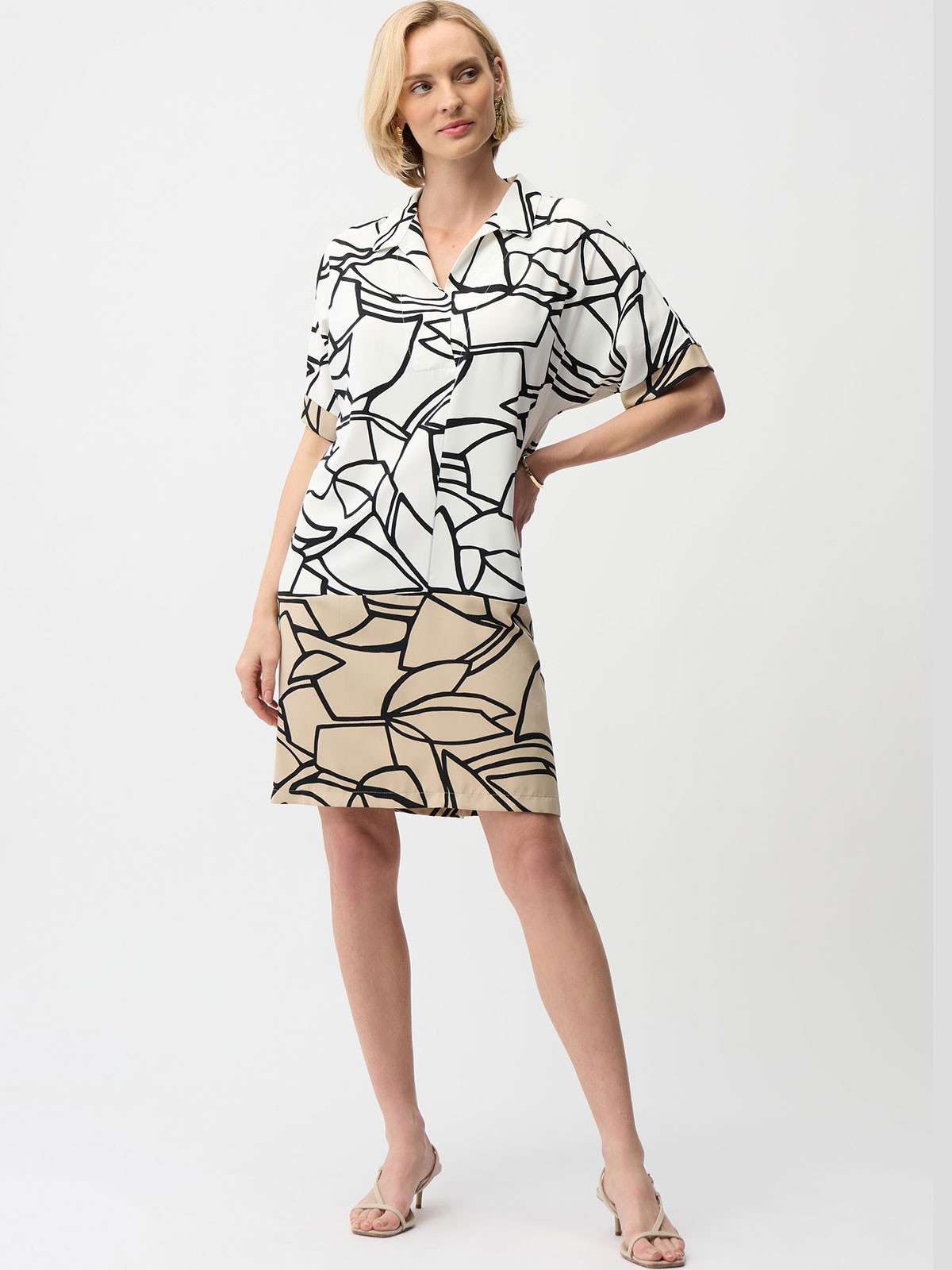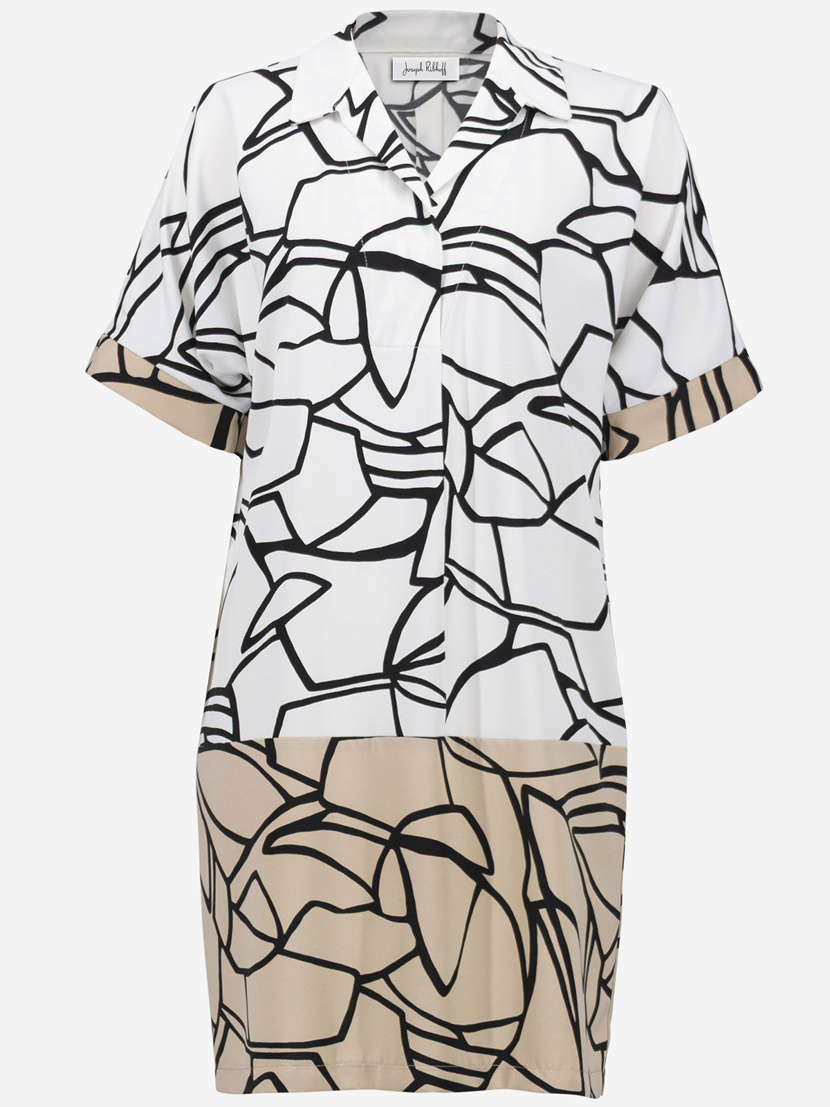 Elegant klänning från Joseph Ribkoff med grafiskt mönster. Modellen är vid och rak, har krage och V-formad öppning som kan justeras med en tryckknapp. Ärmen är kort med en kontrasterande kant. Inga fickor, ofodrad.