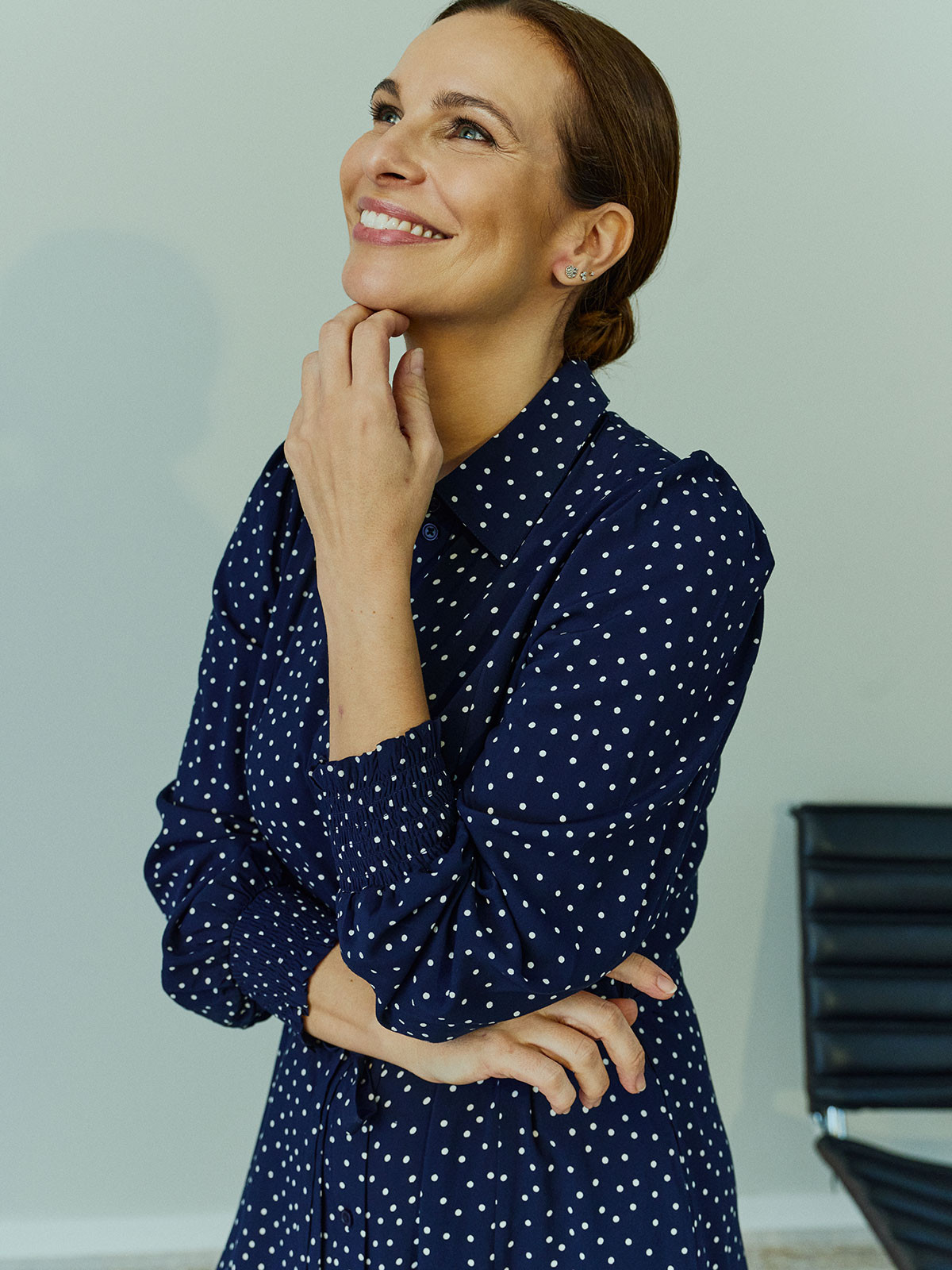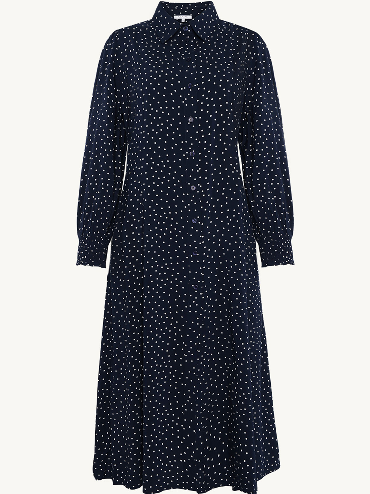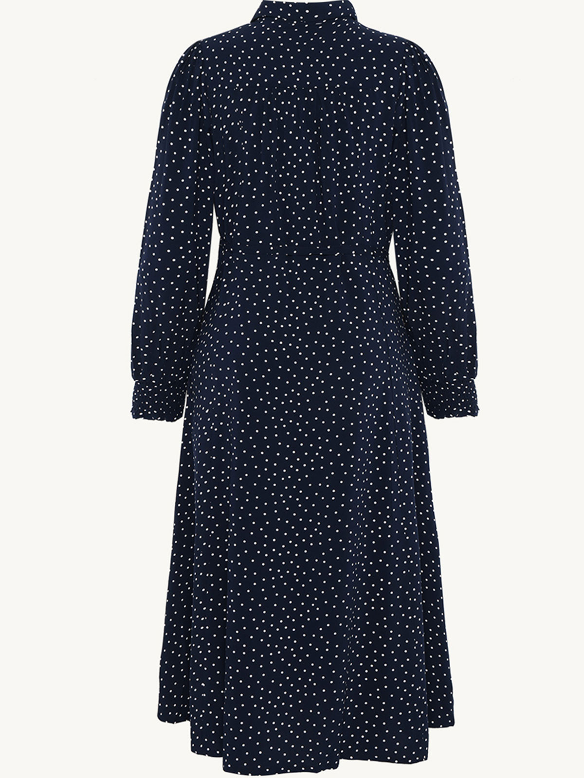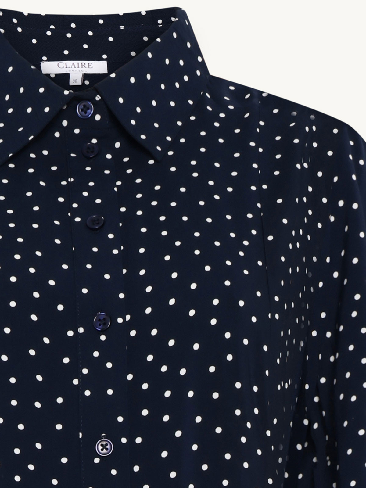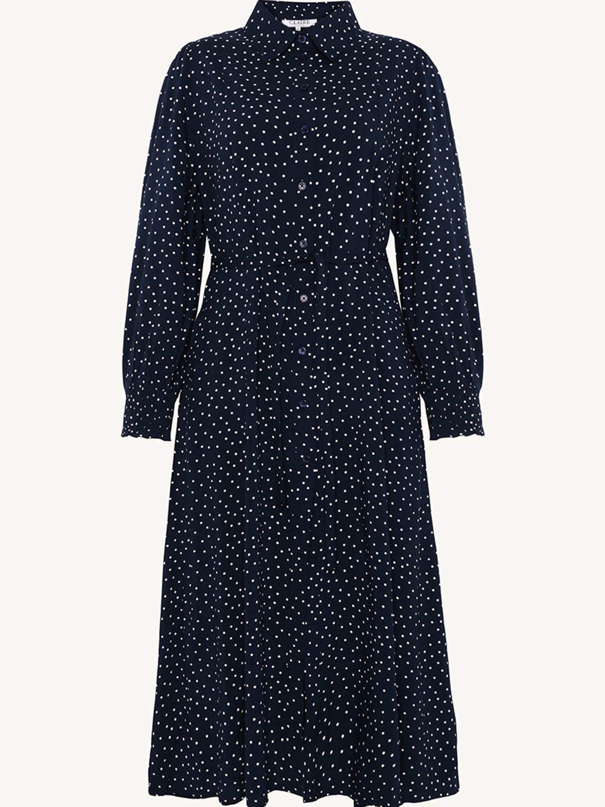 Underbar viskosklänning från Claire Woman i ett marinblått tyg med vita små prickar. Modellen är lätt A-linjeformad och har knapprad hela vägen fram. Det innebär att du kan bära den på tre sätt. Öppen som en kappa, stängd och hängandes rak eller knuten i midjan med det tillhörande tunna tygskärpet. Ärmen har puff och är hellång med smock i nederkant. I sidsömmarna finns det dolda fickor. Skjortkrage.