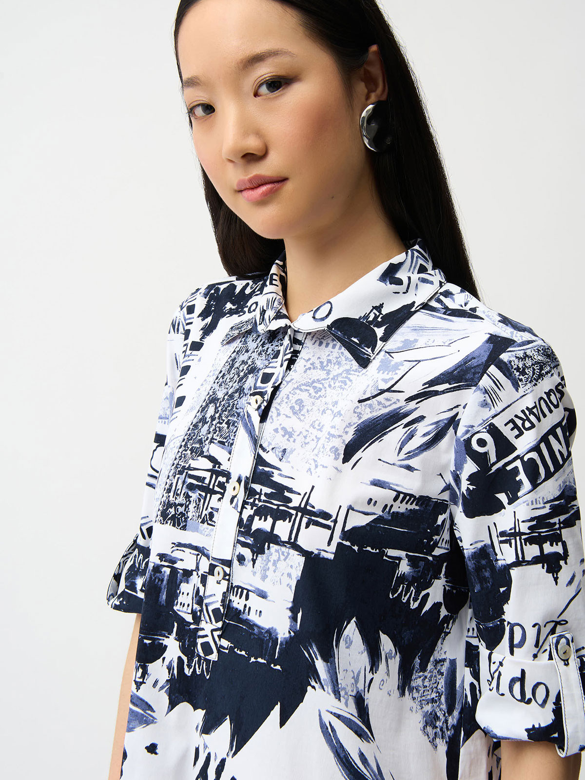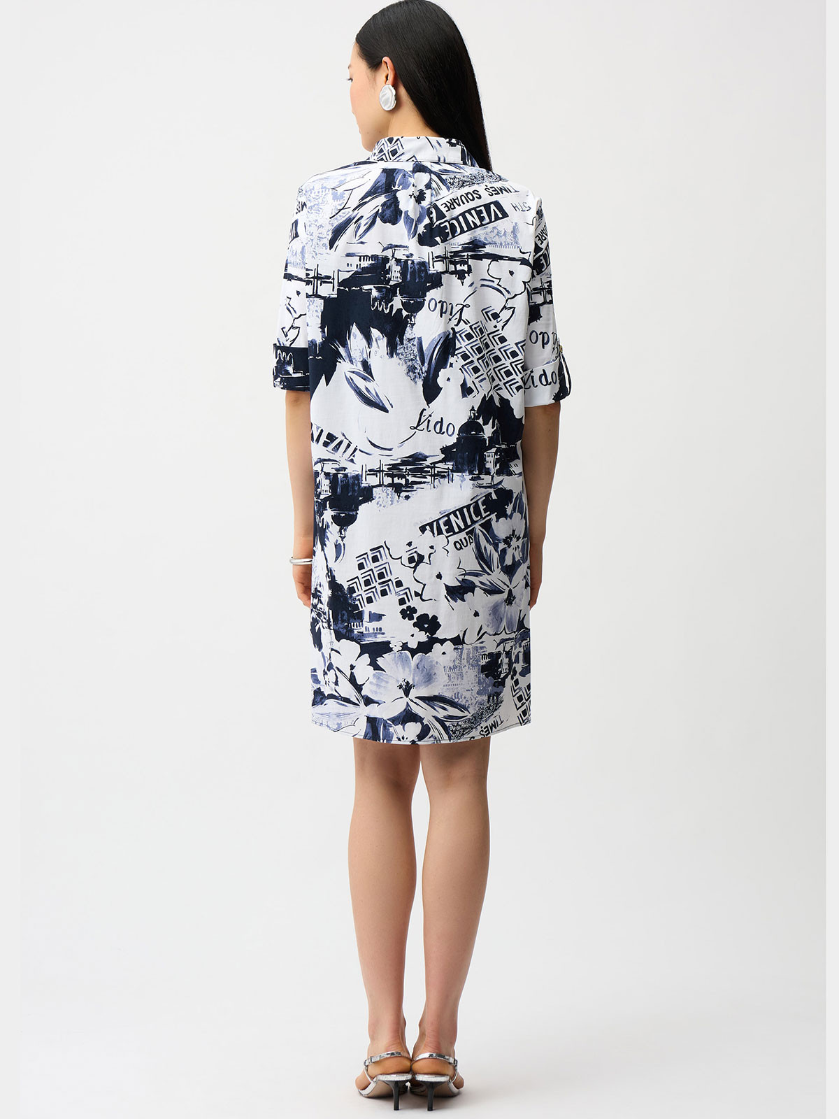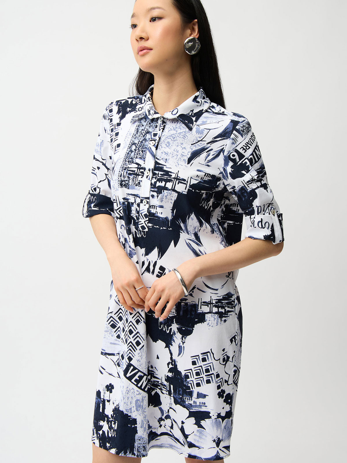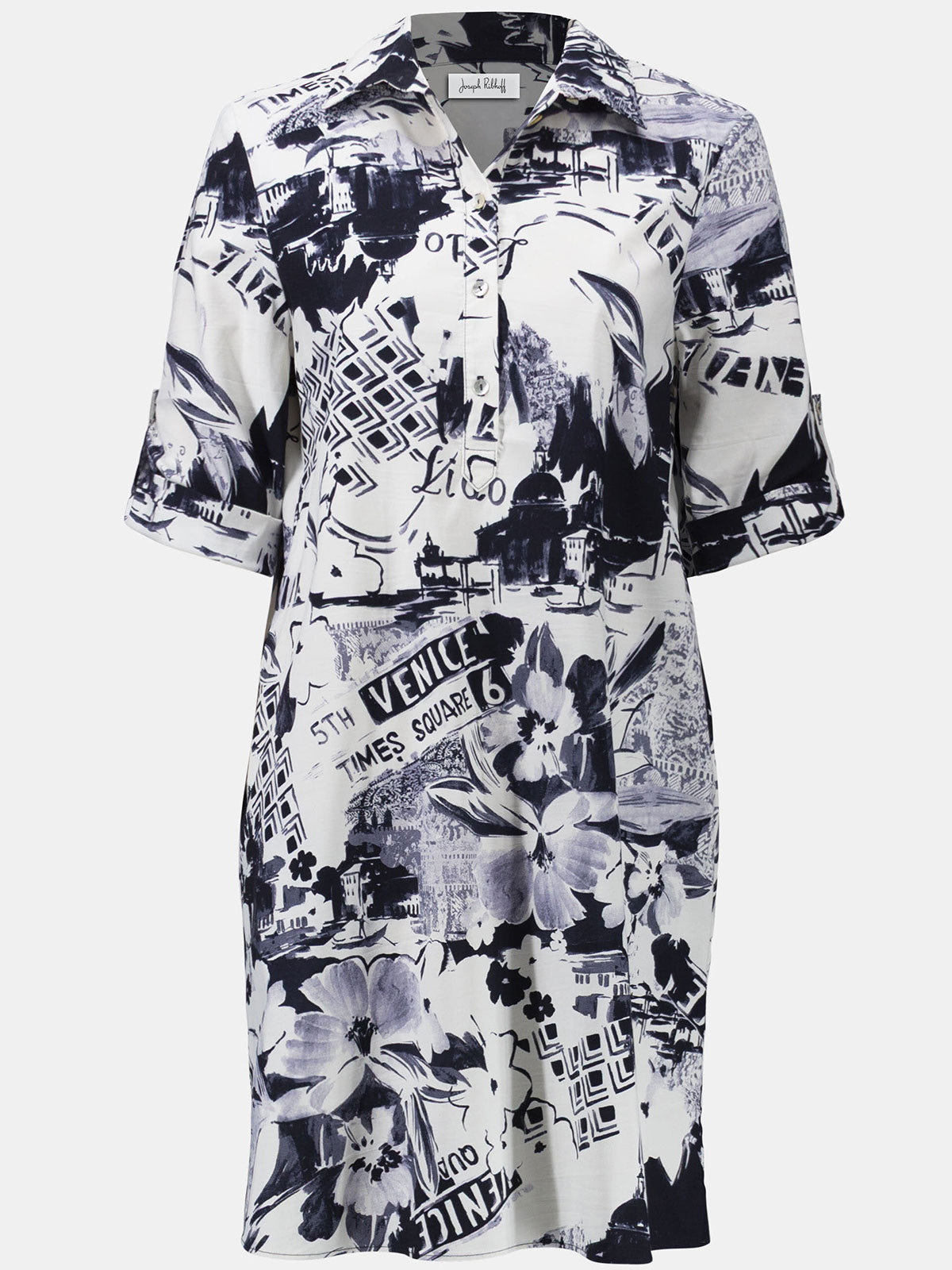 Elegant klänning från Joseph Ribkoff i ett fint marint mönster på vit botten. Modellen har lätt A-linje, skjortkrage och knäppning halvvägs. Ärmen är halvlång med uppvik och slejf. Inga fickor, rak nederkant.