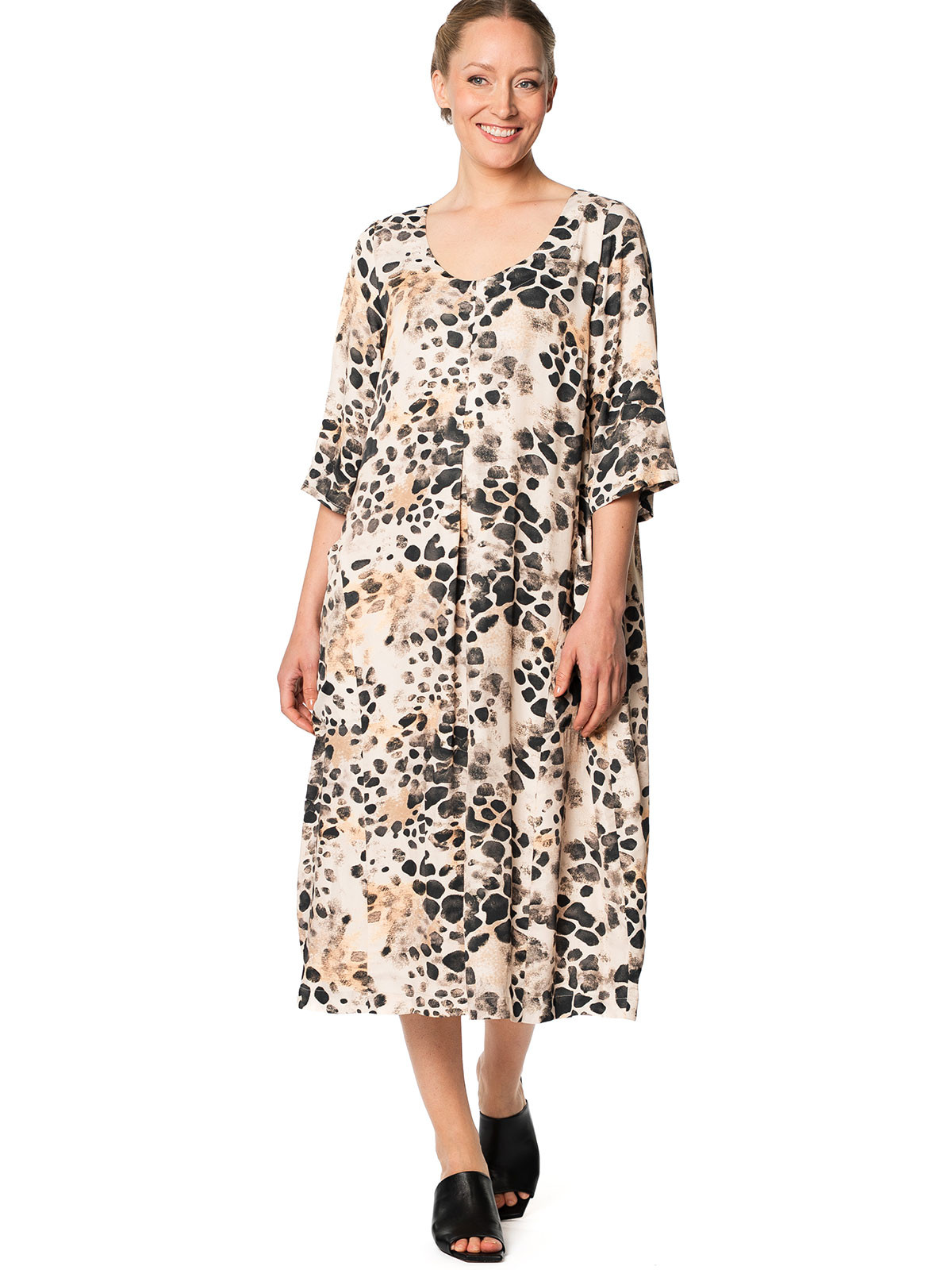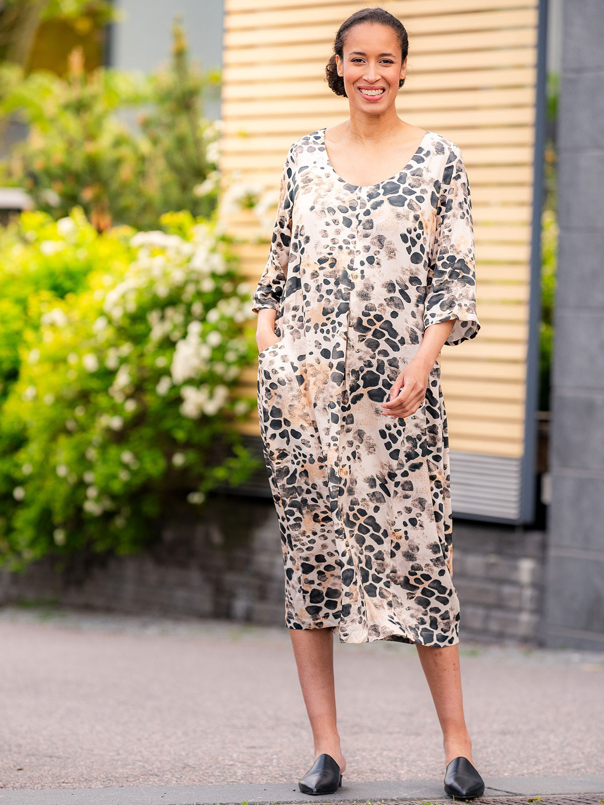 Härlig klänning från Aino i ett vävt viskostyg. Modellen är A-linjeformad och har rundad hals och halvlång ärm. Det finns fickor på sidorna och kjolen breder ut sig i en fin form.