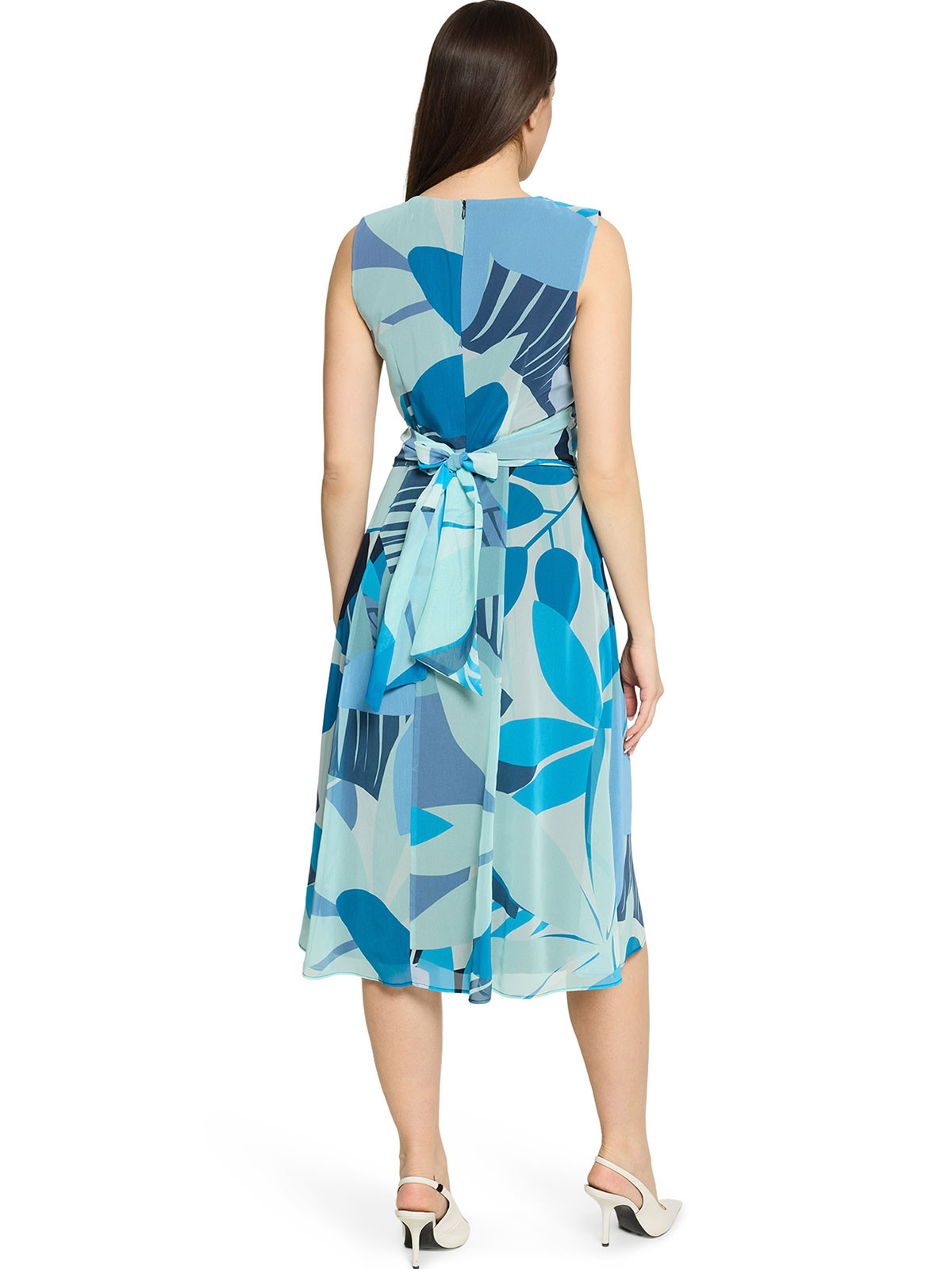En vacker klänning från Betty Barclay i ett transperent och mönstrat tyg. Modellen är nätt upptill och breder ut sig i en vid A-linje. Runt midjan finns ett draperat tygskärp som knyts bak i ryggen. Klänningen är fodrad hela vägen. Inga fickor eller slitsar. Stängs med dold dragkedja i ryggen.
