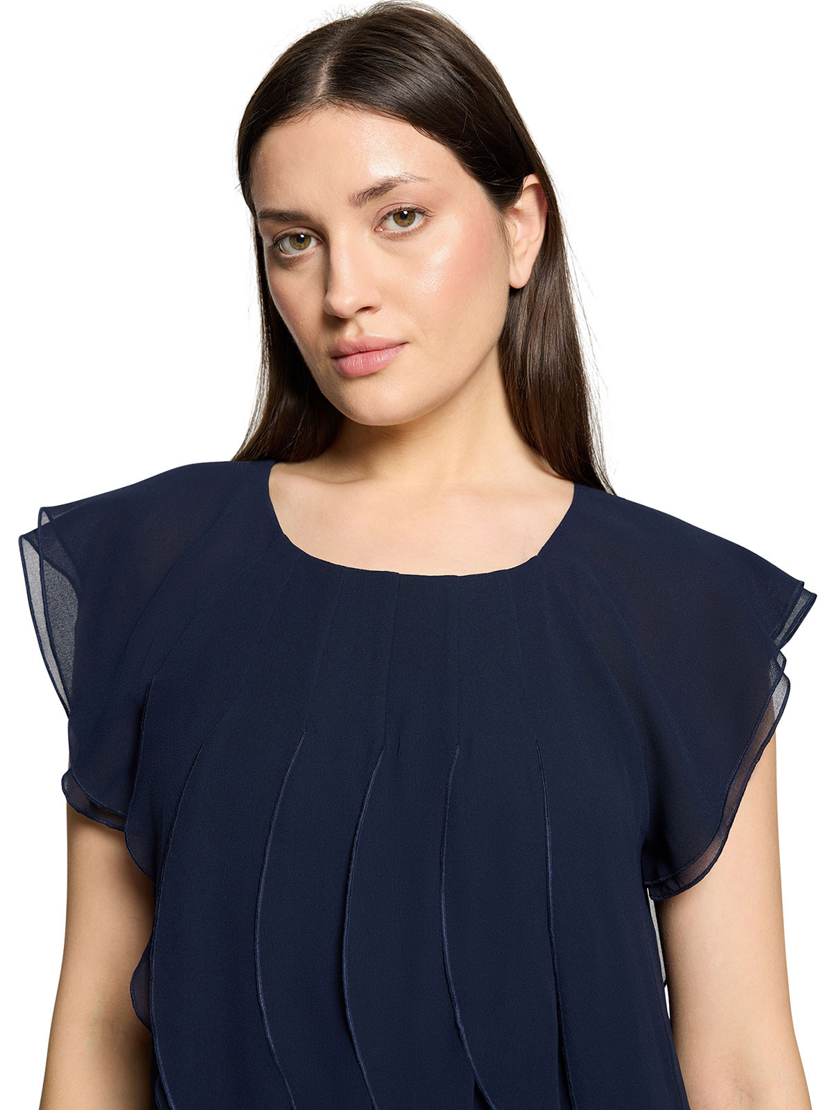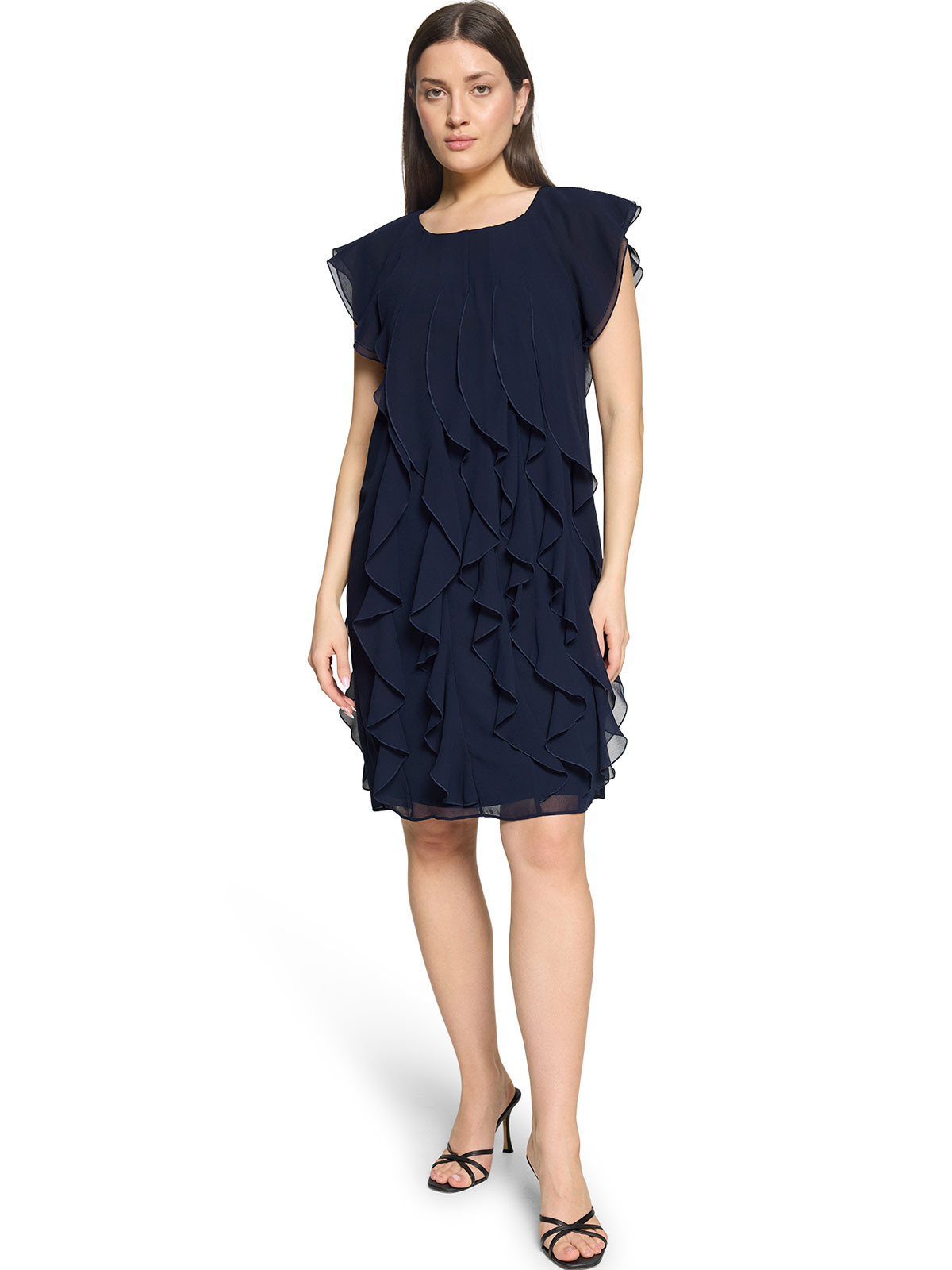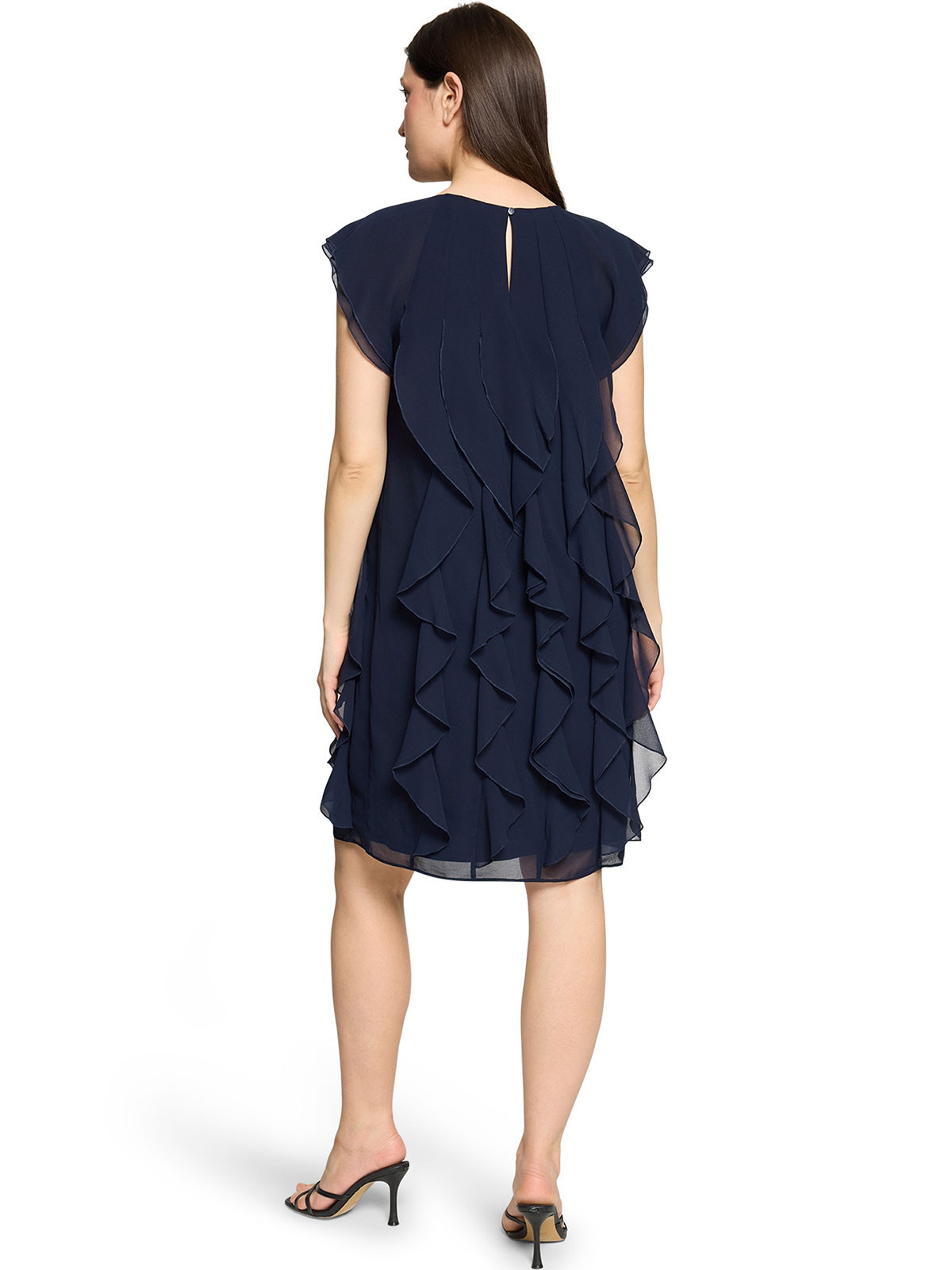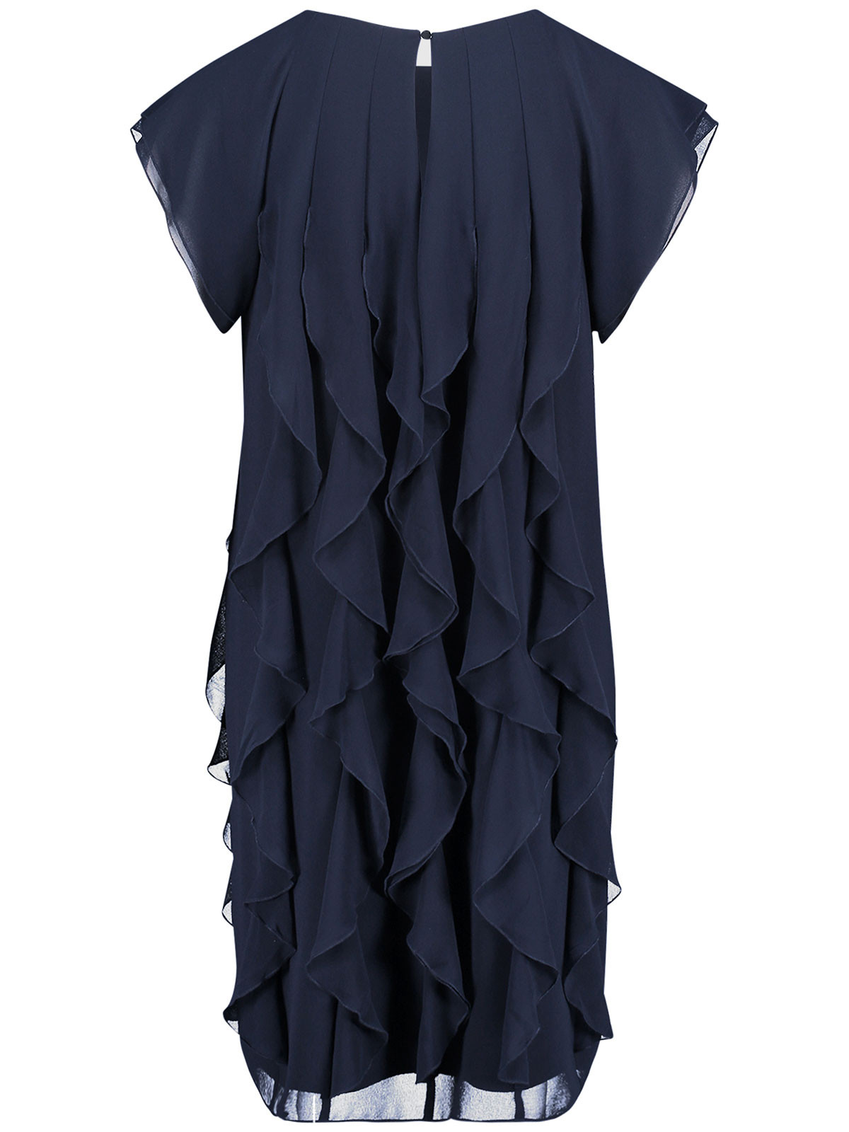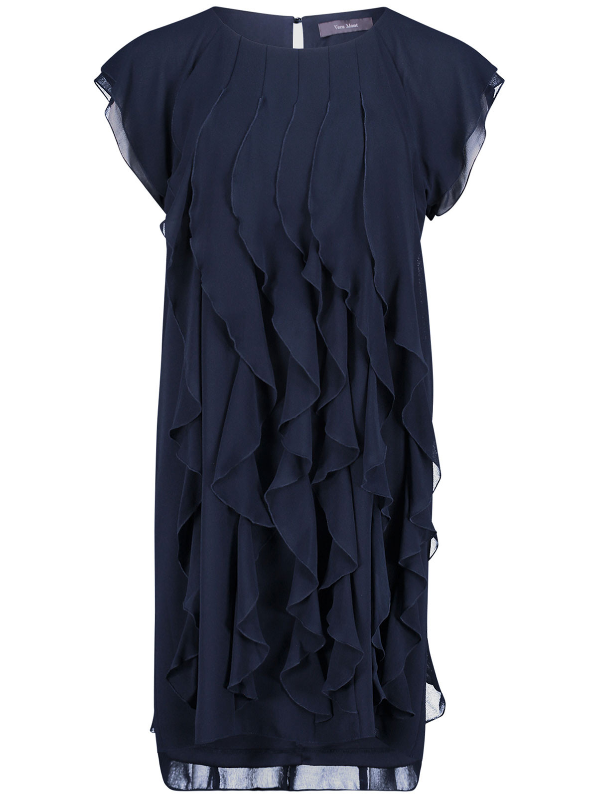 En alldeles ljuvlig chiffongklänning från Vera Mont. Modellen är rak med påsydda, vertikala volanger som ger en svepande effekt. Halsen är rundad och ärmen kort. Den stängs i nacken med en knapp. Klänningen är fodrad med en mjuk trikåklänning som gör den jätteskön att bära. Inga fickor.