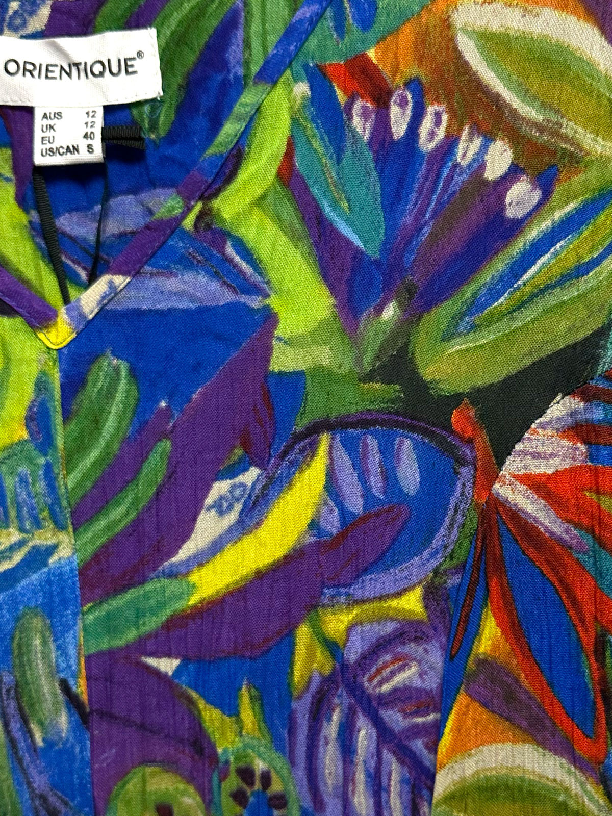 Knälång klänning i krinklad rayon från australienska Orientique. Modellen har kort ärm och en kjol som breder ut sig. Det här är den perfekta klänningen att ta med på resa då den efter tvätt och tork, om man vill behålla den krinklade effekten, vrider och snurrar ihop klänningen igen. Då återgår den till sin krinklade struktur.