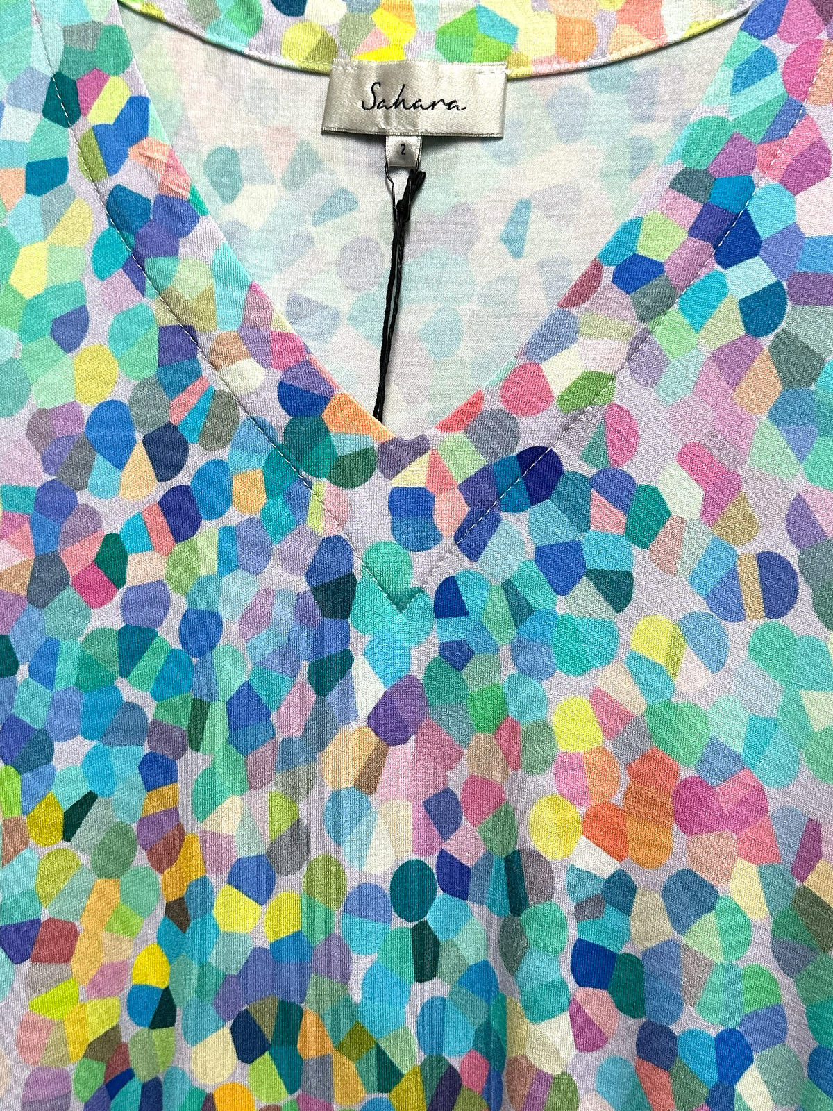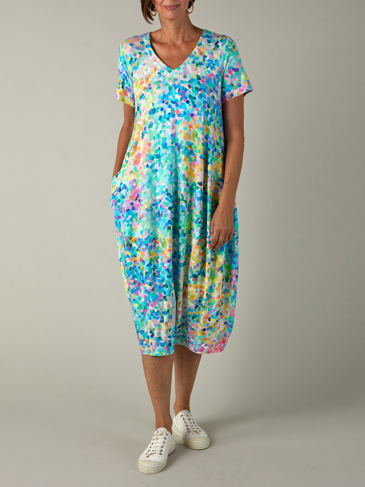 Härlig klänning från Sahara i mjuk viskostrikå. Modellen är vid och generös med en tulpanformad kjol. Halsen är V-ringad och ärmen kort. I sisdsömmarna finns det fickor.