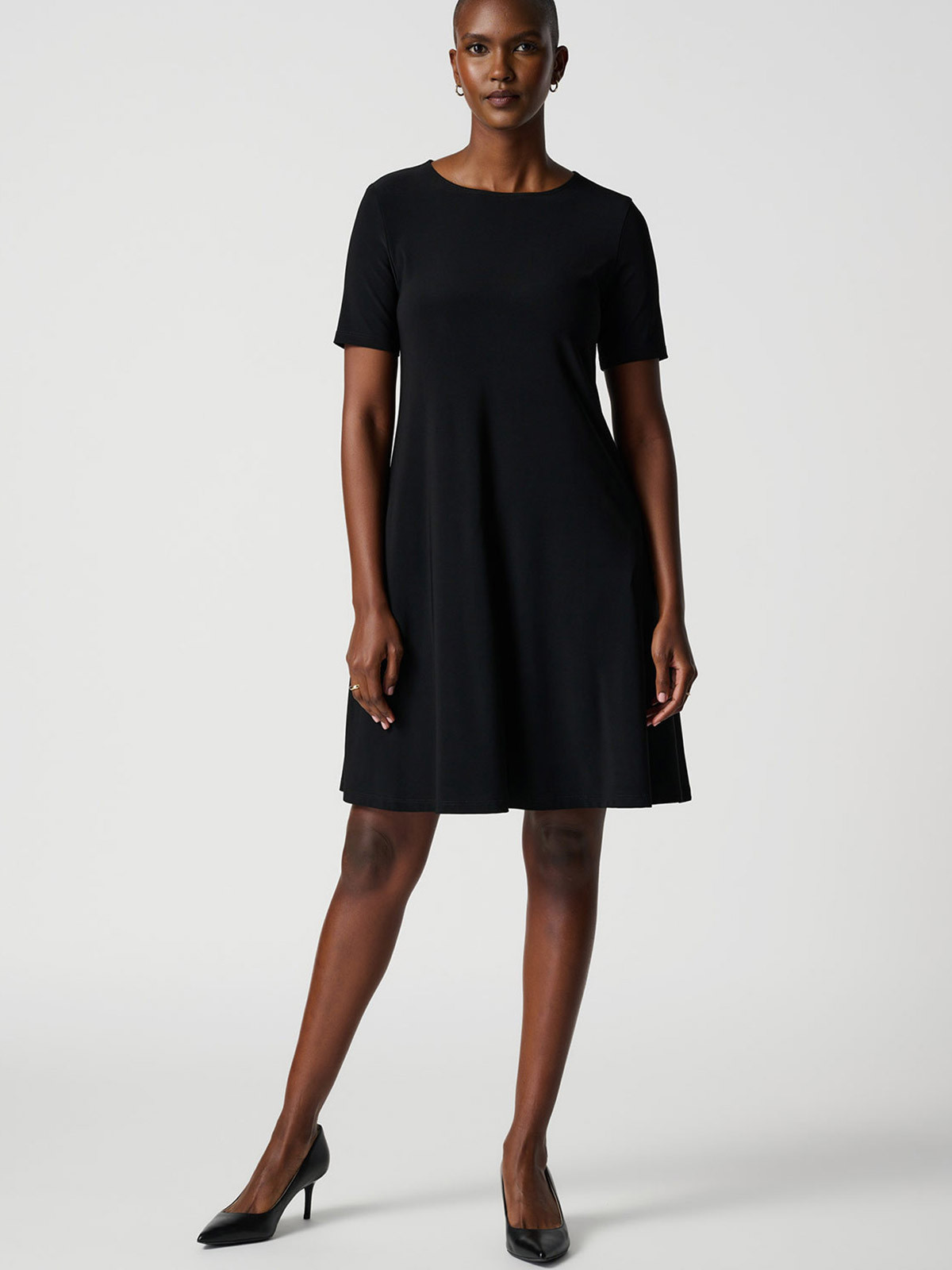 En snygg klänning från Joseph Ribkoff i härlig trikå med lyster. Klänningens modell är A-linjeformad och klädsam för de flesta figurer.