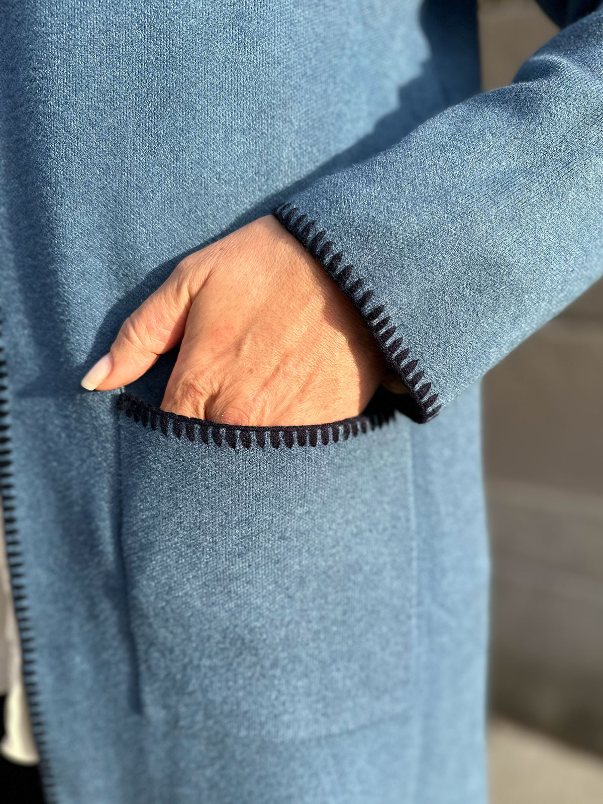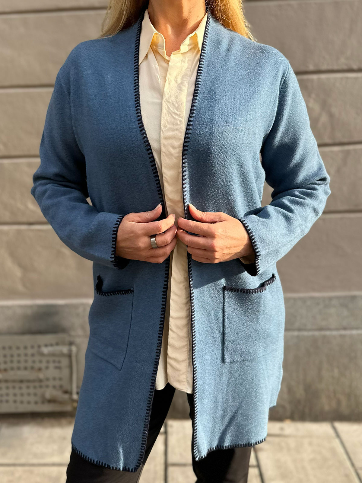 En mjuk och skön långkofta från Marienllo med kontrasterande sömmar i kanterna. Modellen är rak och har sjalkrage. Ingen knäppning och på framsidan finns två påsydda fickor.