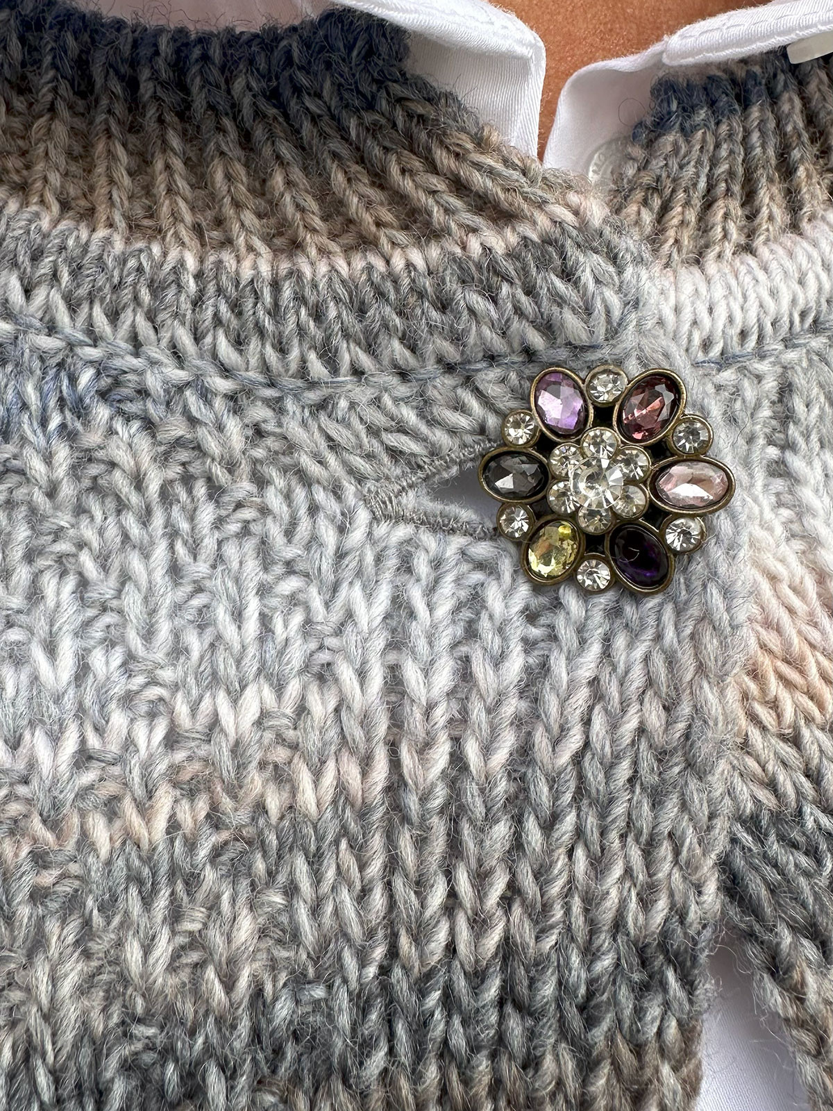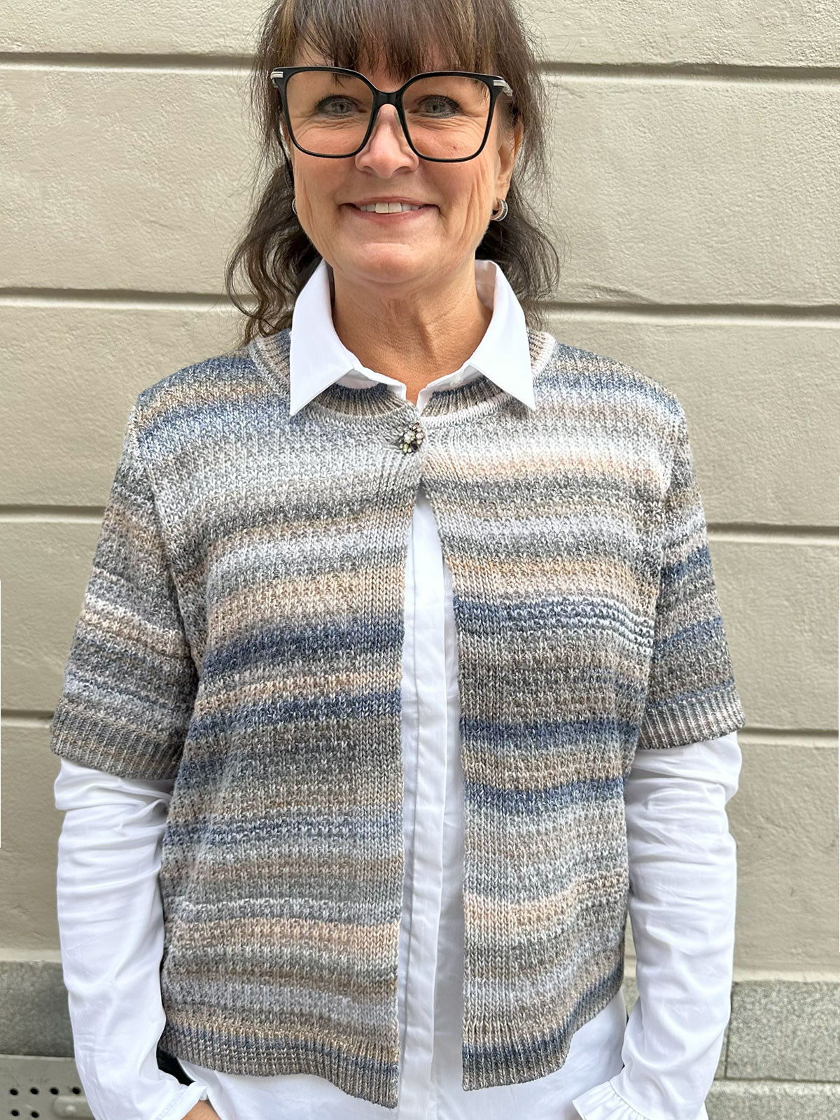 Randig mönsterstickad kofta grå med strassknapp från Skovhuus