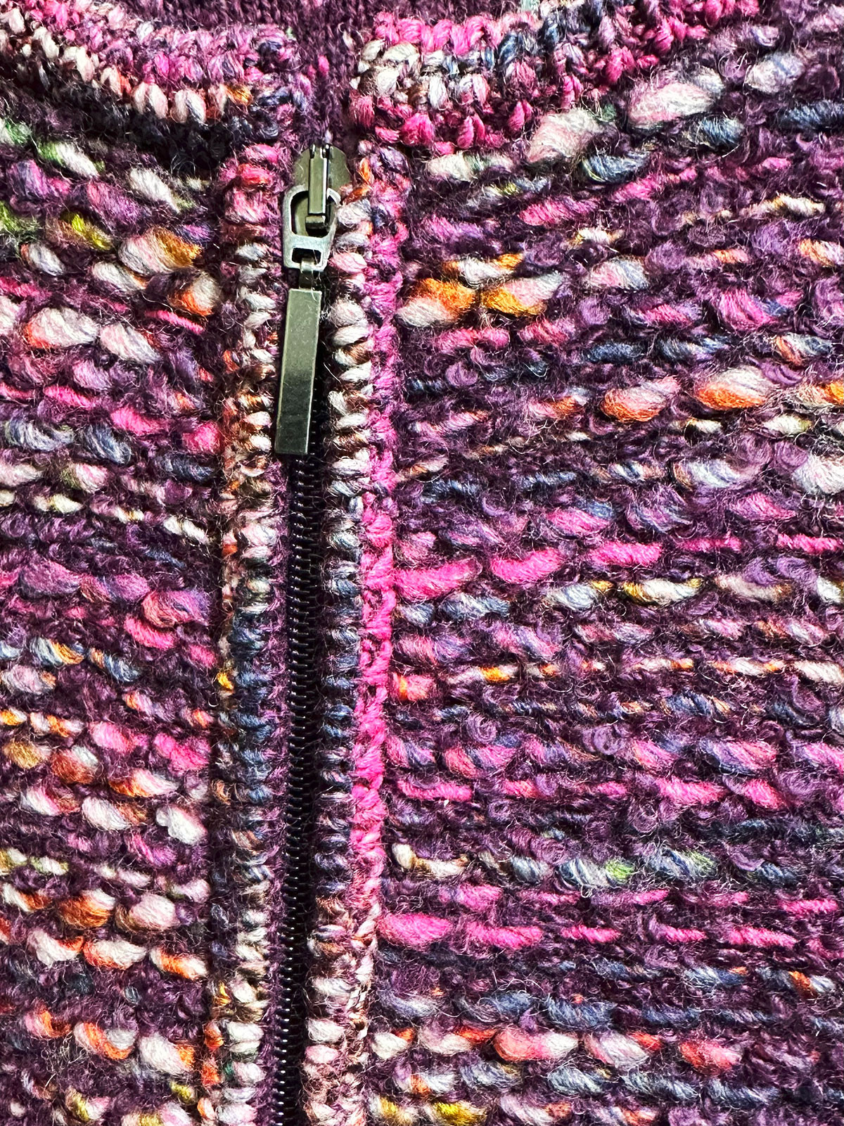 Jacka/kofta, från Rabe i ett melerat, mjukt och strukturerat garn. Modellen är rak med rundad hals och hellång ärm. Stängs med dragkedja. Ofodrad och inga fickor.