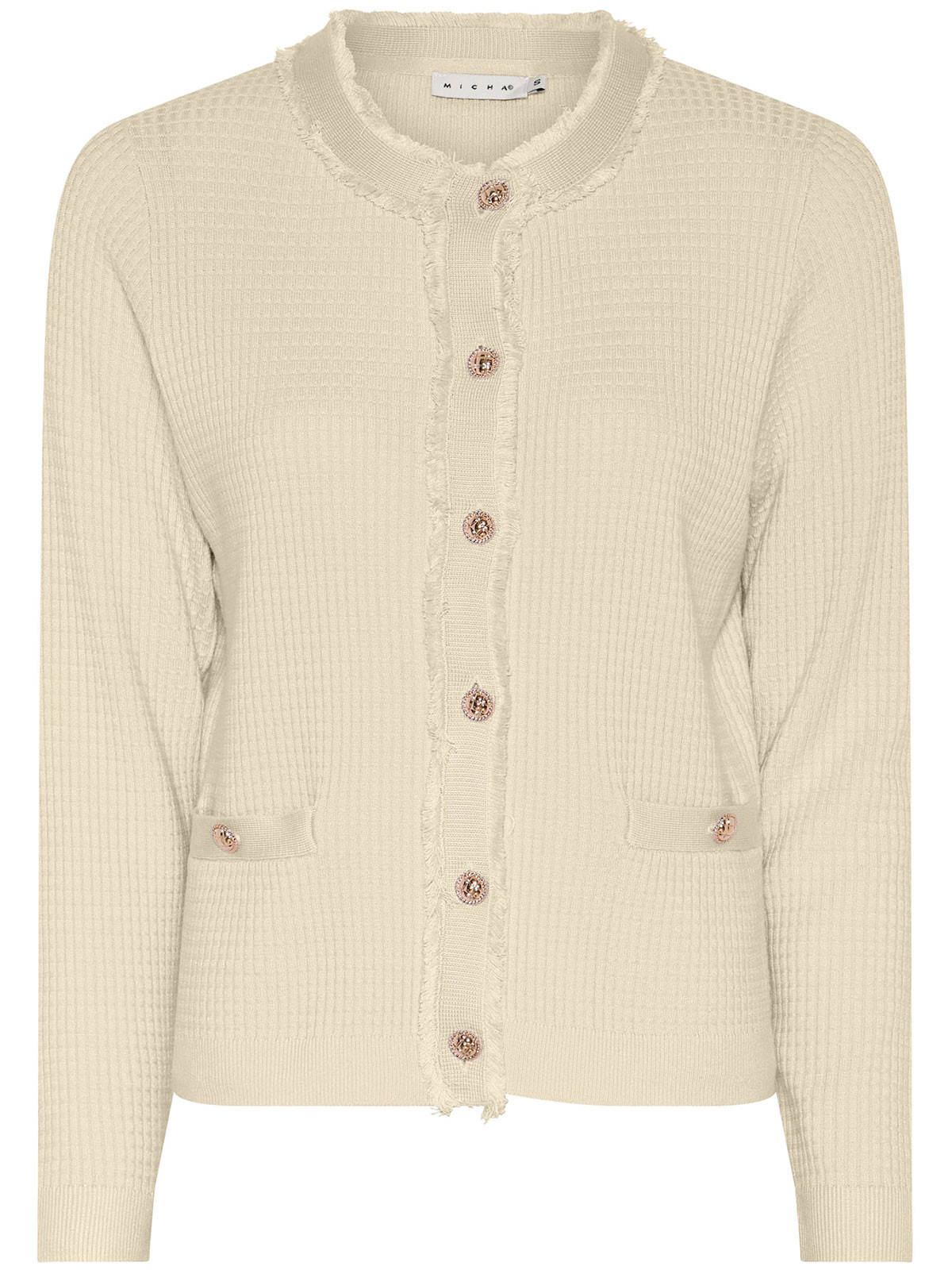 Elegant fin- och mönsterstickad kofta från Micha i klassisk "Chanel"-modell. Rundad hals, hellång ärm, guldknappar, två fickor fram och i mjuk och skön viskosmix.