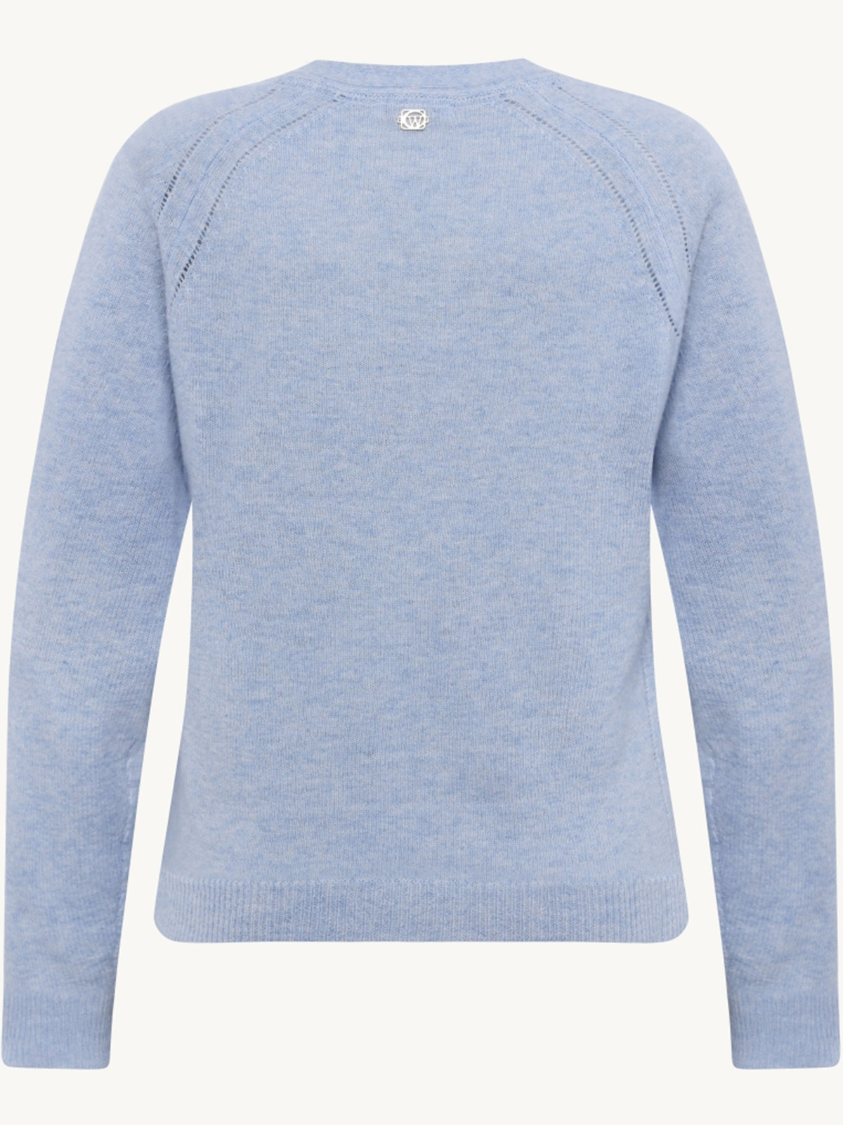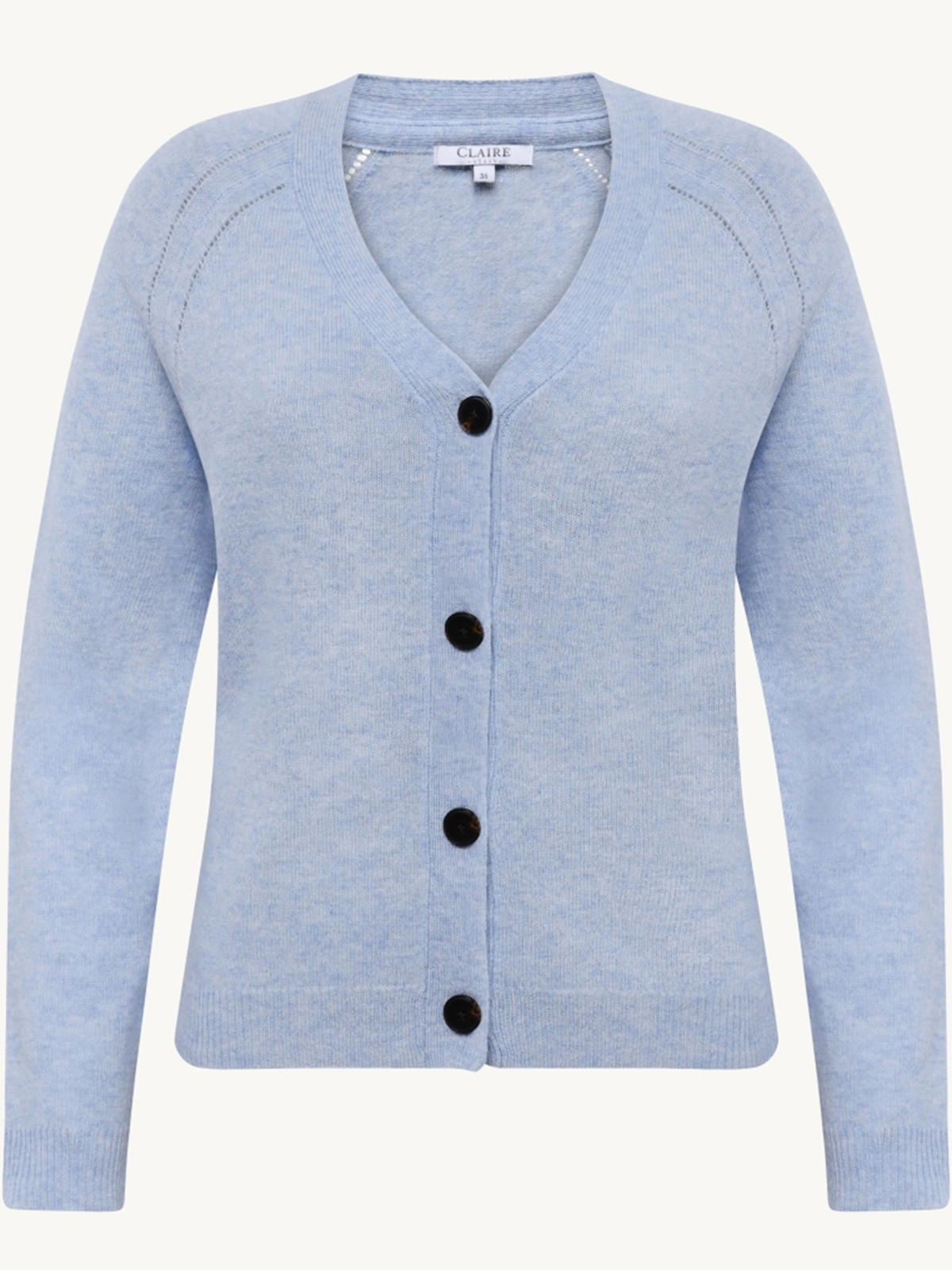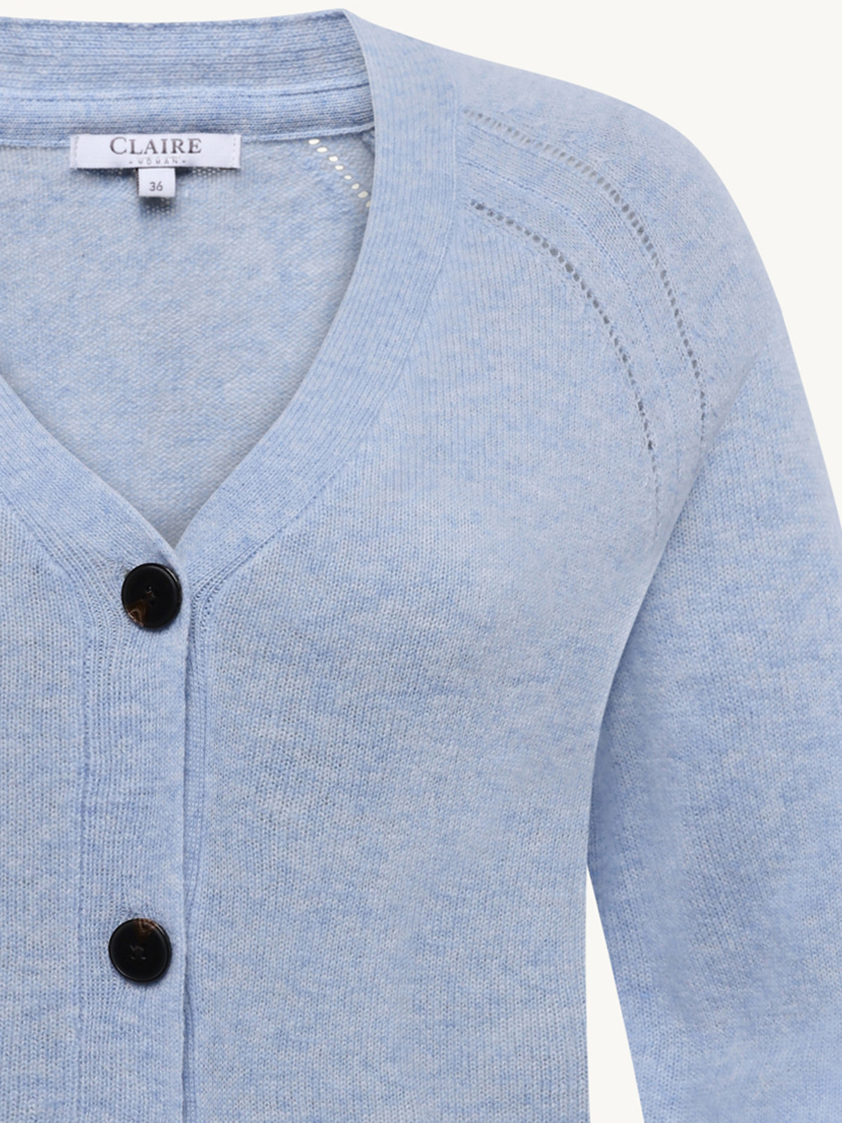 Superfin kofta i mjukaste ull från Claire Woman. Modellen är rak med V-ringad hals, hellång ärm och mudd vid alla avslut. Vid raglansömmarna finns dekorativt hålmönster instickat.