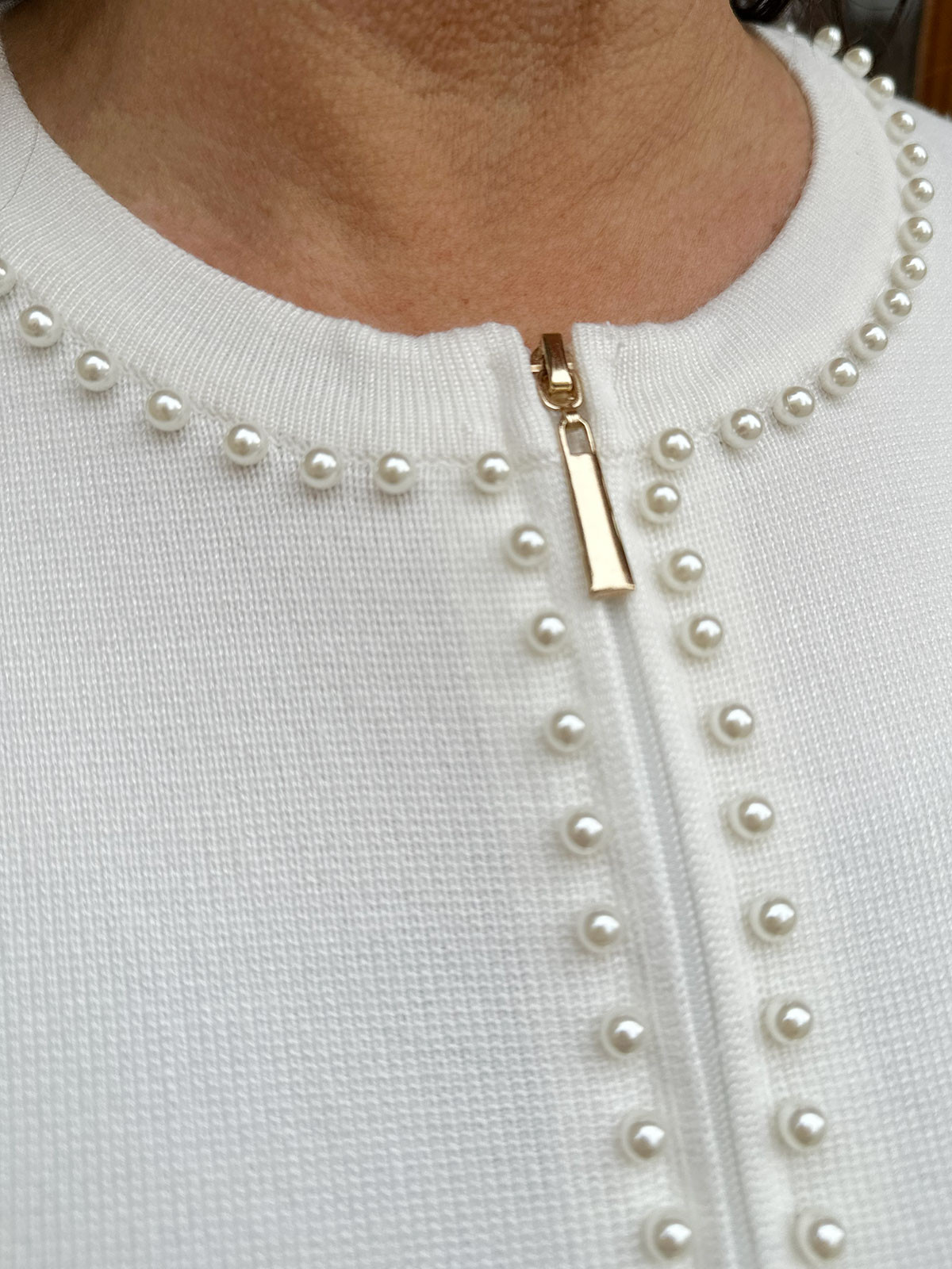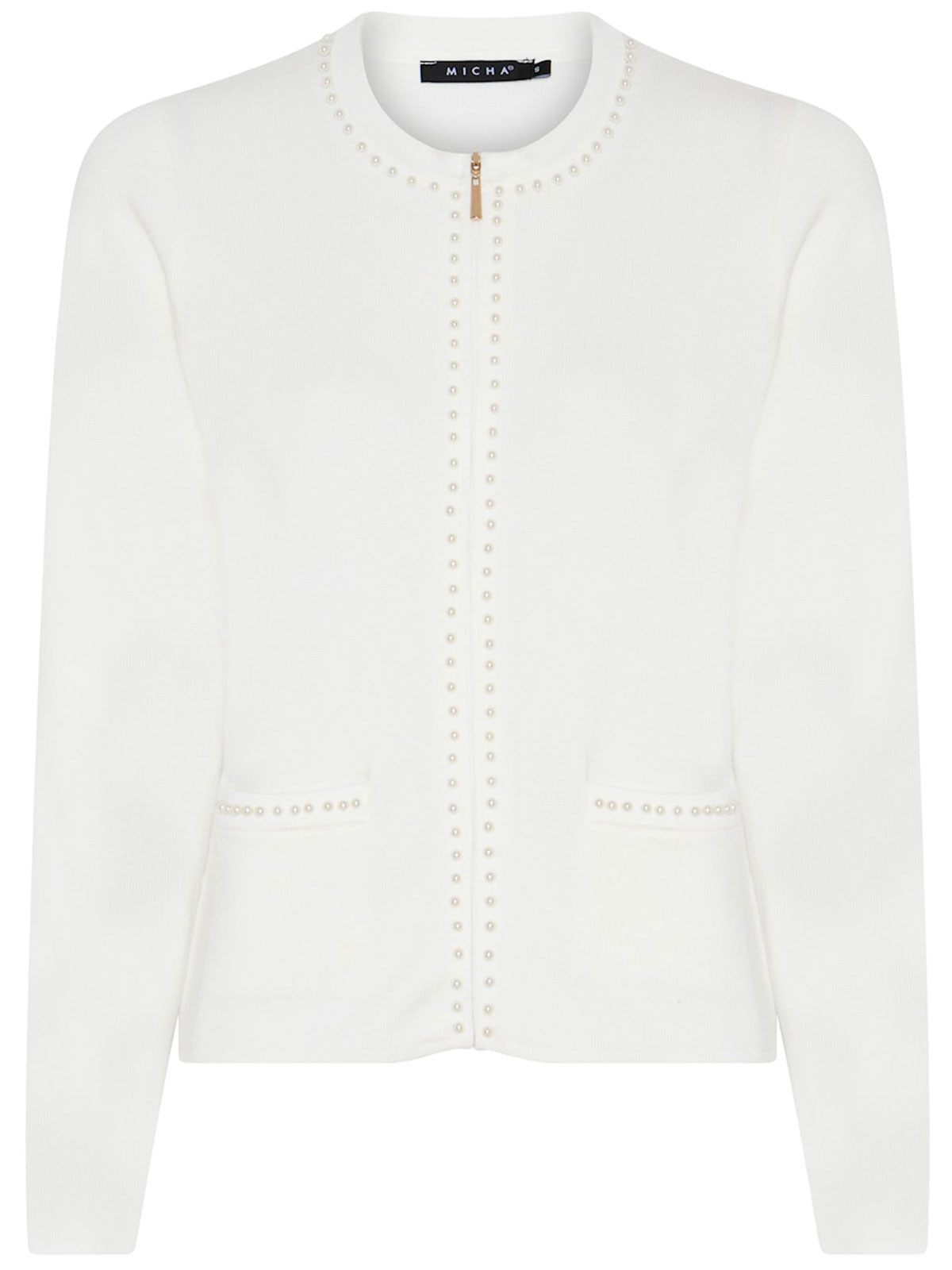 Superfin kofta från Micha med pärldekor. Modellen är klassiskt rak med rundad hals och hellång ärm. Längs med fickor, hals och stängningen fram finns pärlor som dekor. Koftan stängs med en vit dragkedja som har ett guldfärgat spänne.