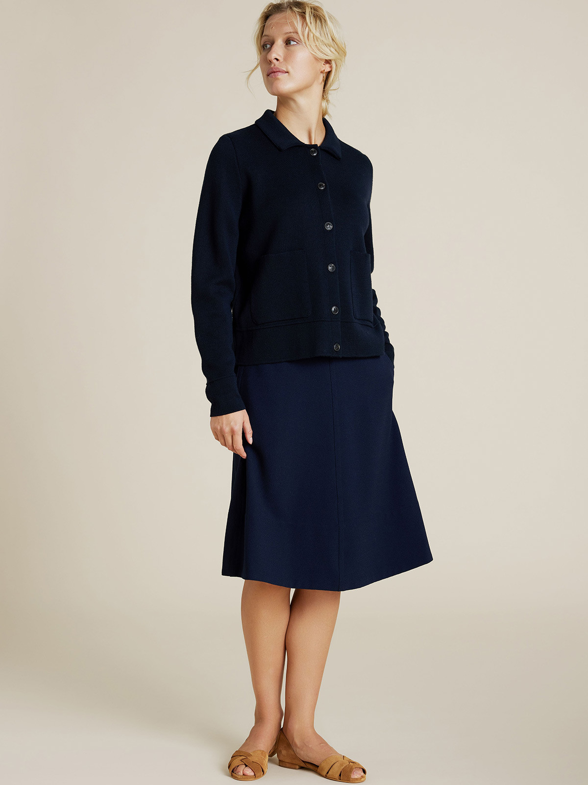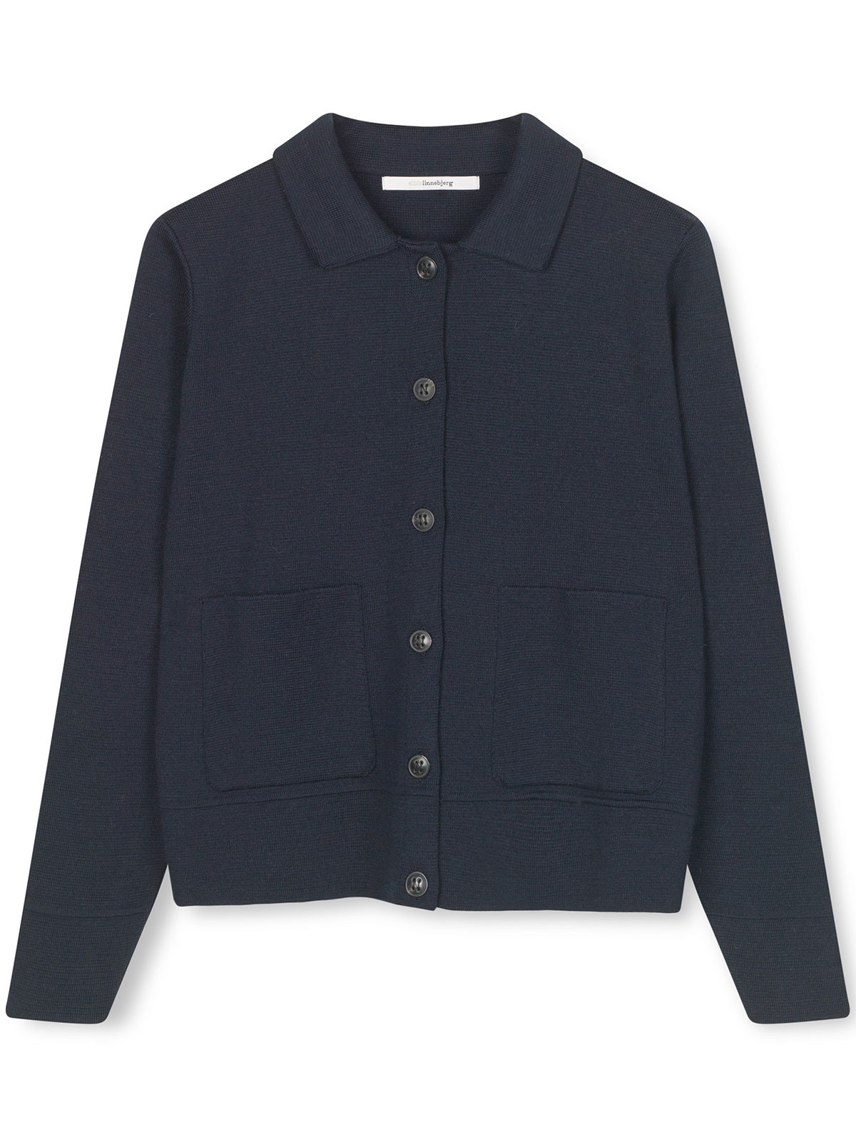 Modellen Kaja från Sibinlinnebjerg är en tätstickad kofta med krage och utanpåliggande fickor. Den har ett klassiskt uttryck och de svarta knapparna färgbryter mot den vackra marinblå färgen.