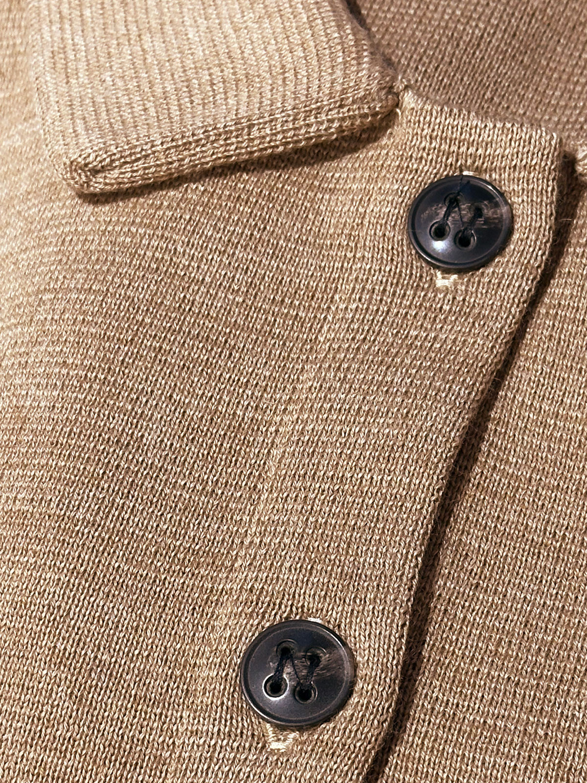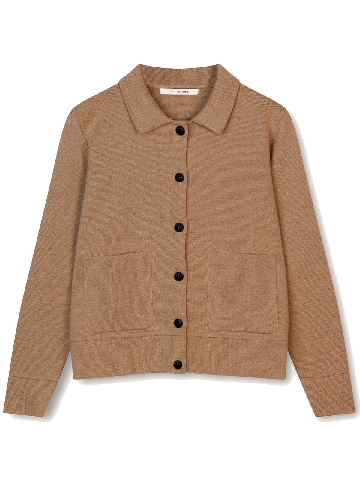 Modellen Kaja från Sibinlinnebjerg är en tätstickad kofta med krage och utanpåliggande fickor. Den har ett klassiskt uttryck och de mörkt melerade knapparna färgbryter fint mot den vackra camelfärgen.