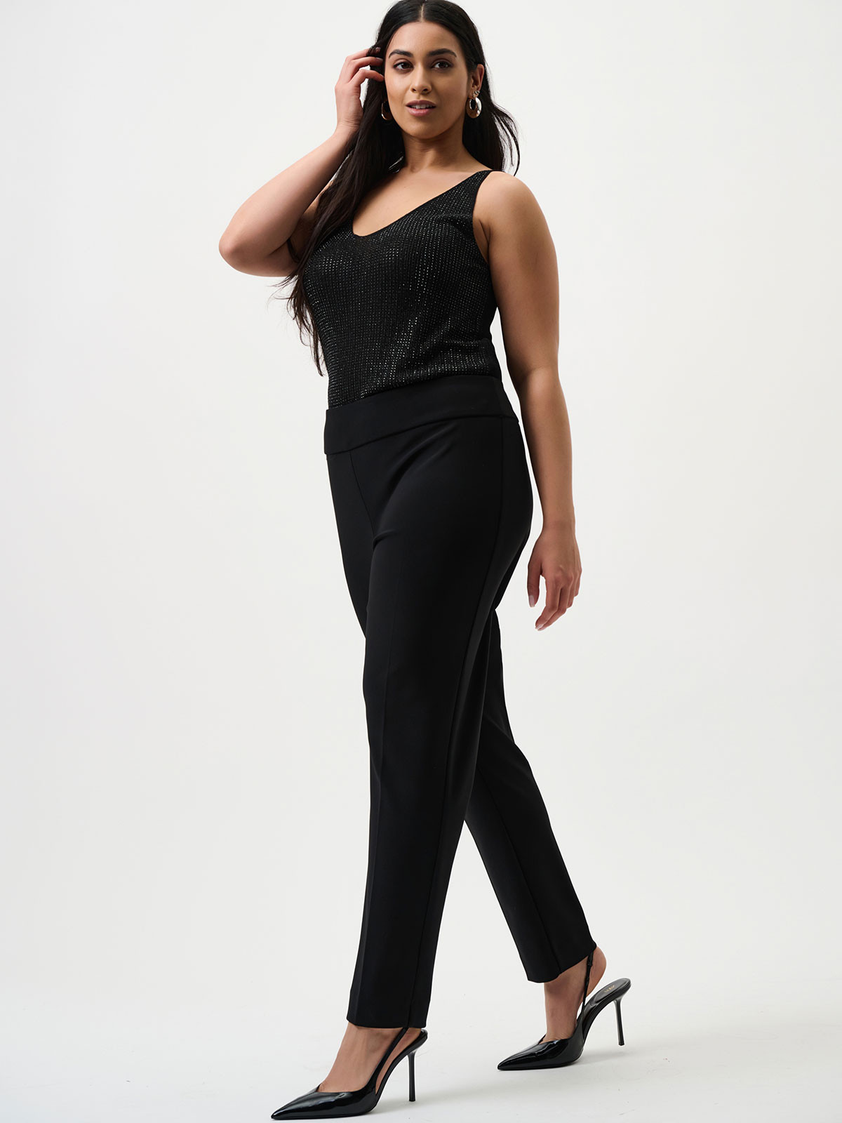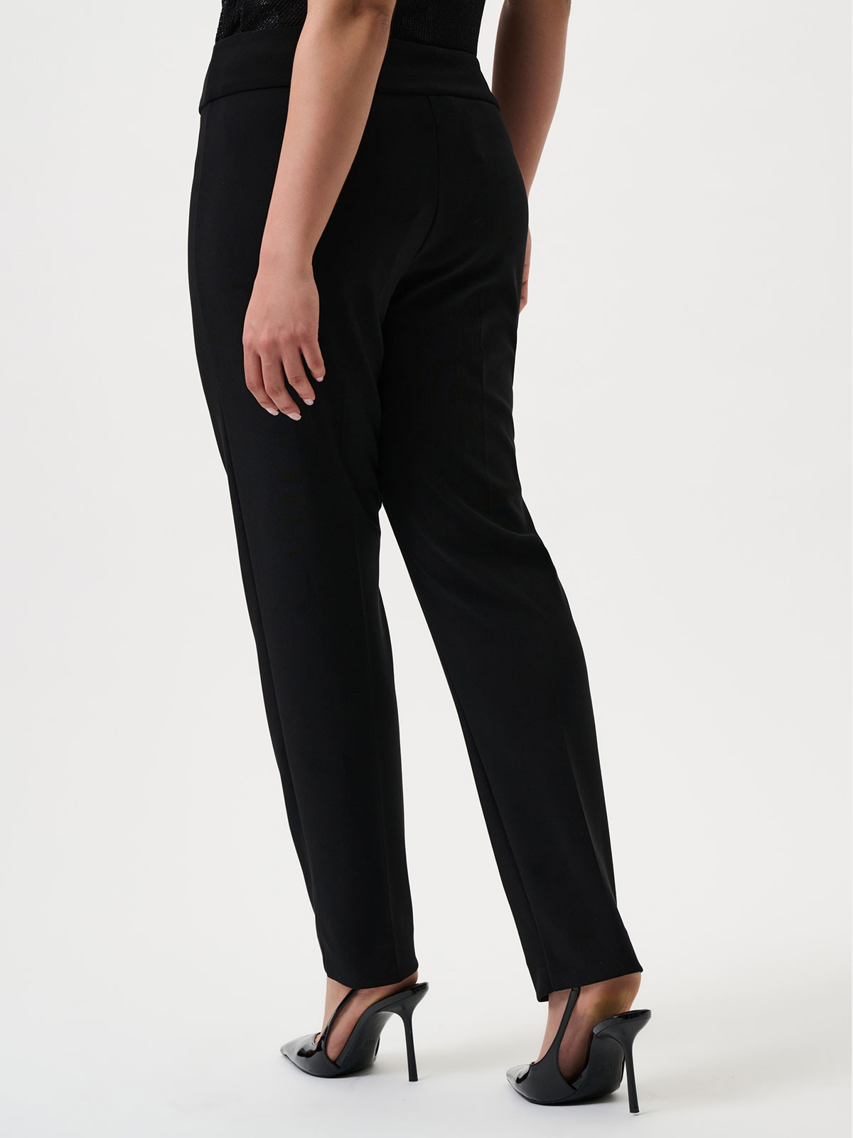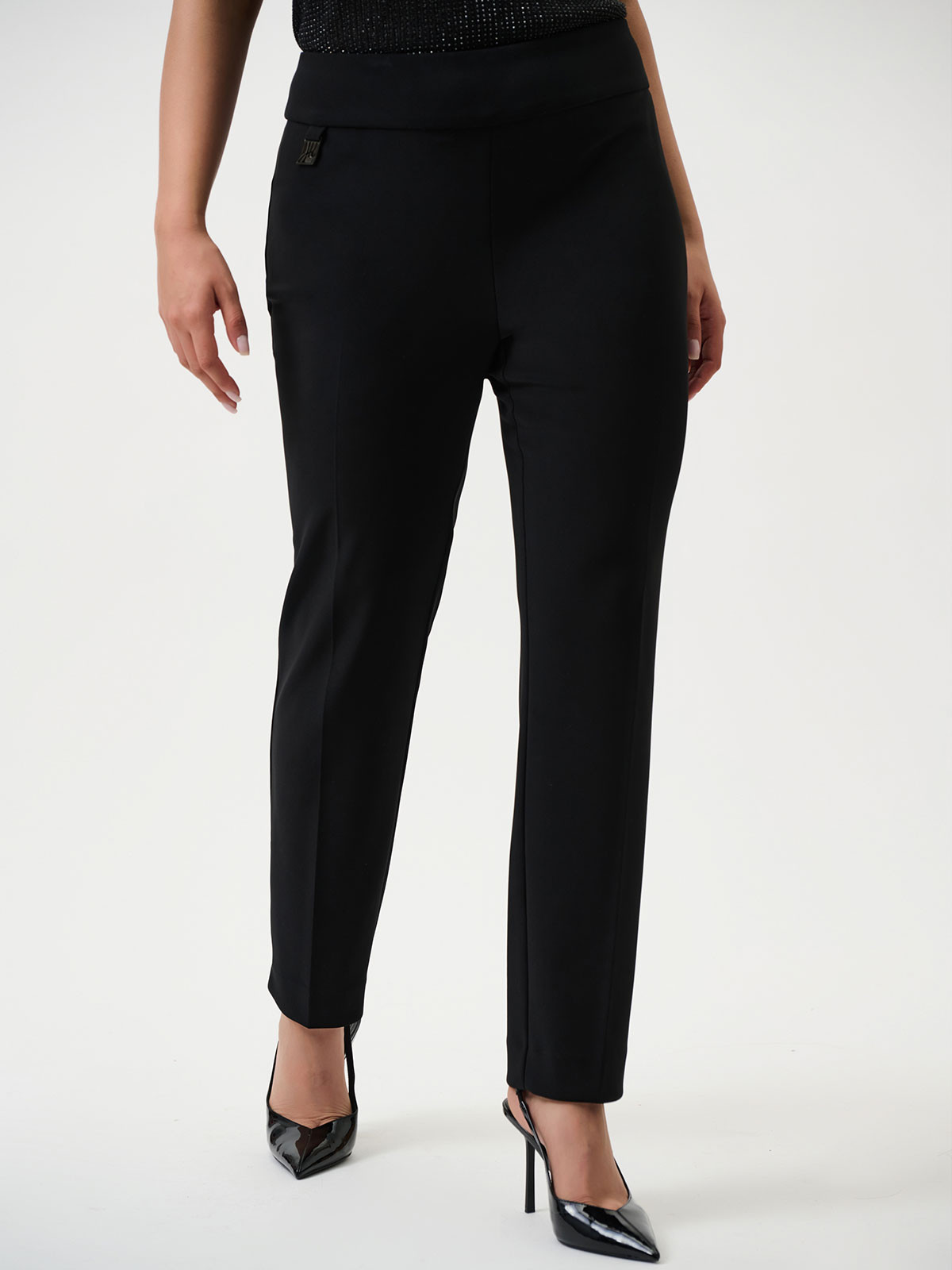 Snygg svart byxa från Joseph Ribkoff. Mycket bekväm och stretchigt material som formar sig efter figuren. Hög midja med skön och bred resårkant. Smalare ben och en lätt dra-på modell utan knäppning. Detta är den perfekta finbyxan - snygg och lättburen. Skrynkelfri!