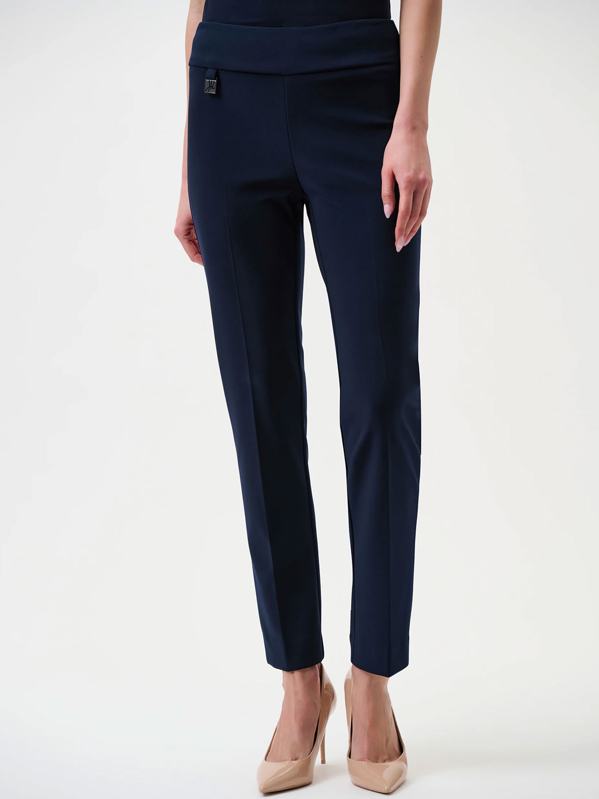 Snygg marinblå byxa från Joseph Ribkoff. Mycket bekväm och stretchigt material som formar sig efter figuren. Hög midja med skön och bred resårkant. Smalare ben och en lätt dra-på modell utan knäppning. Detta är den perfekta finbyxan - snygg och lättburen.