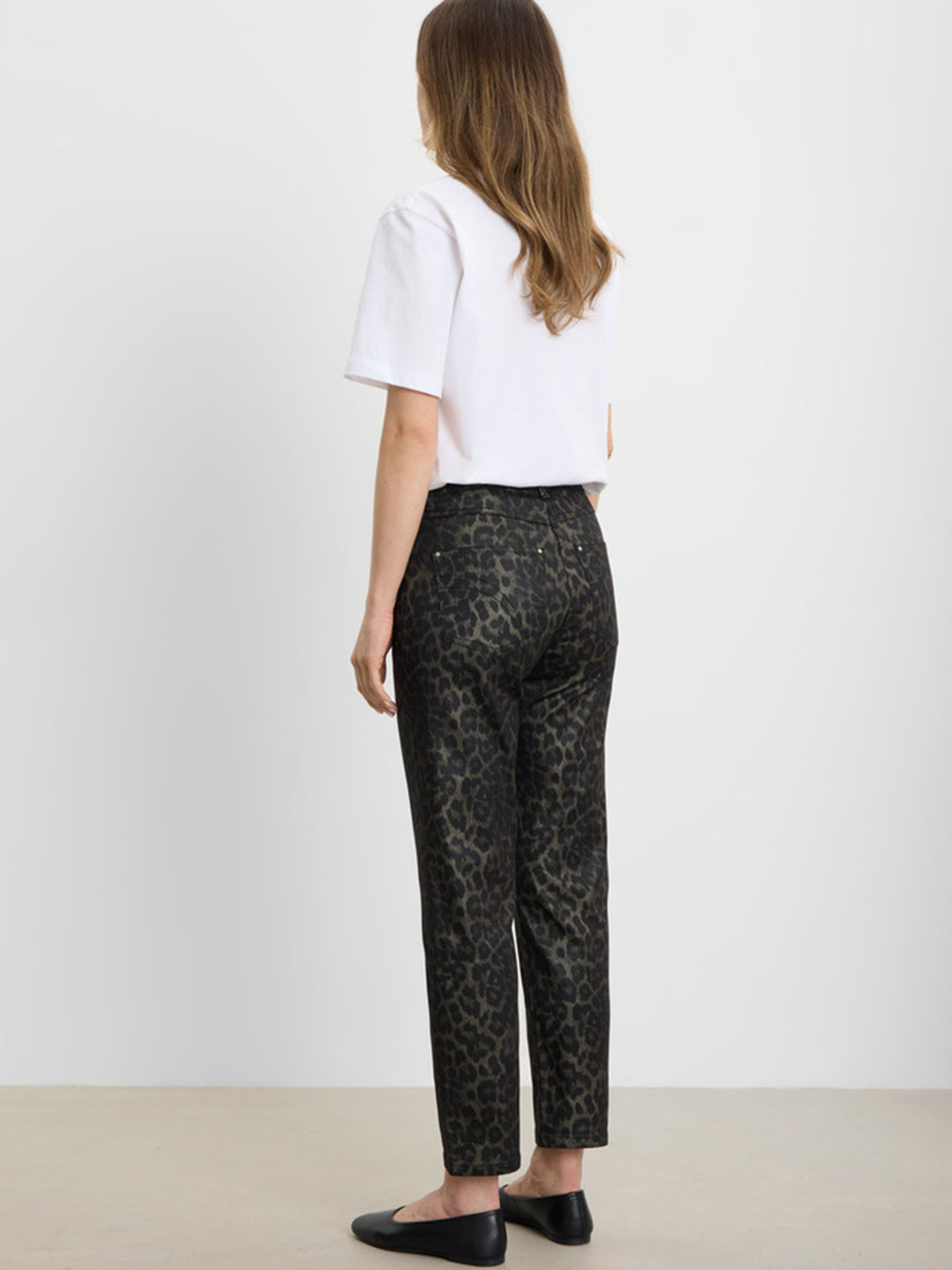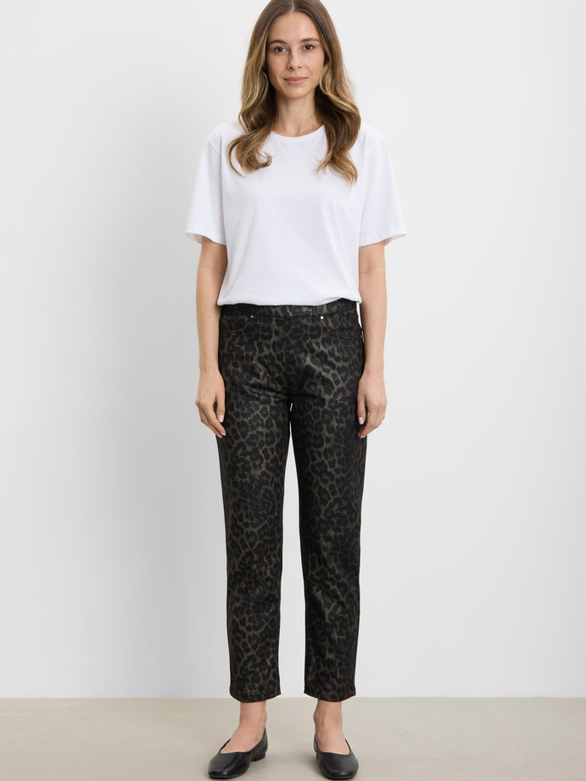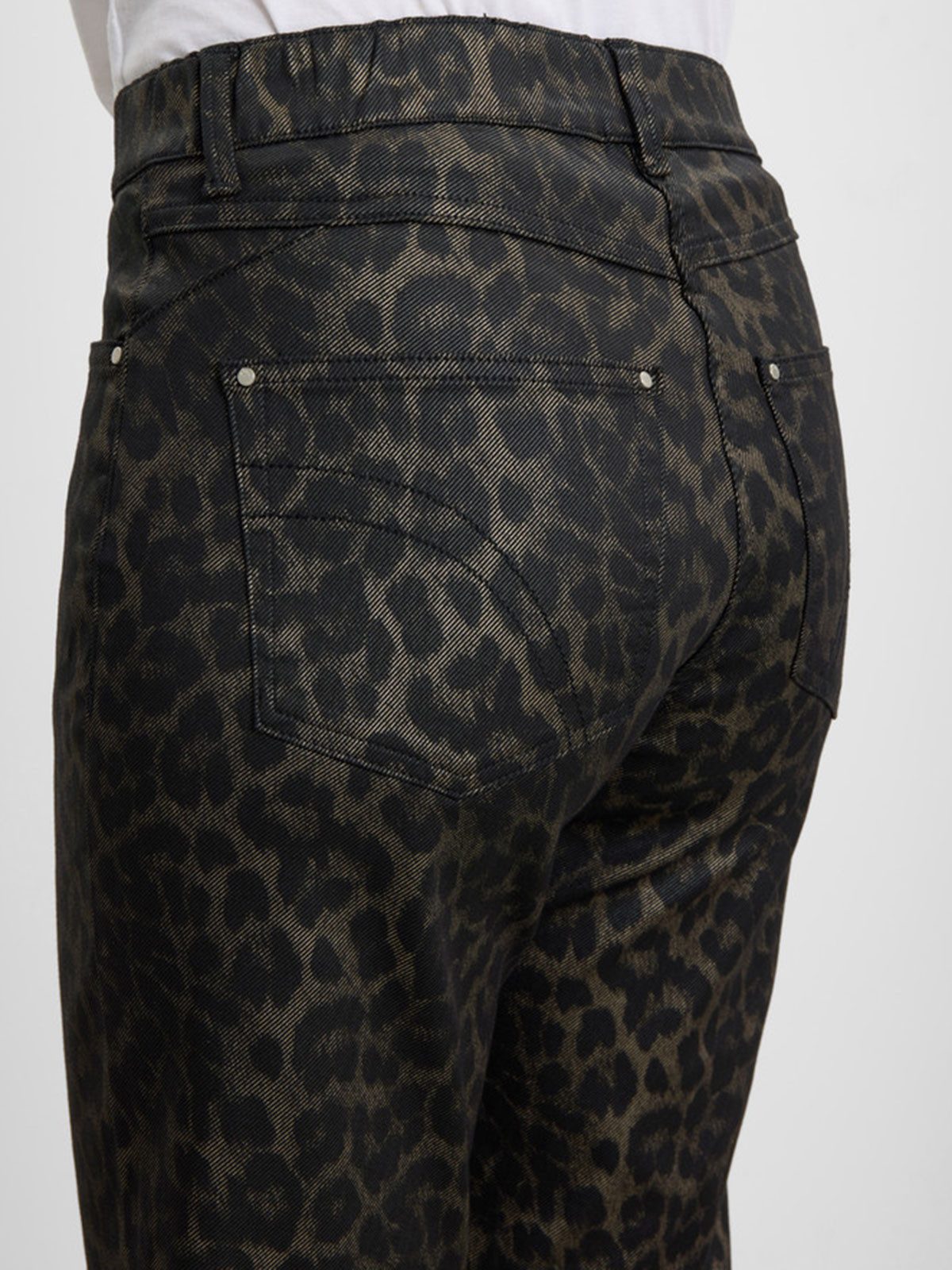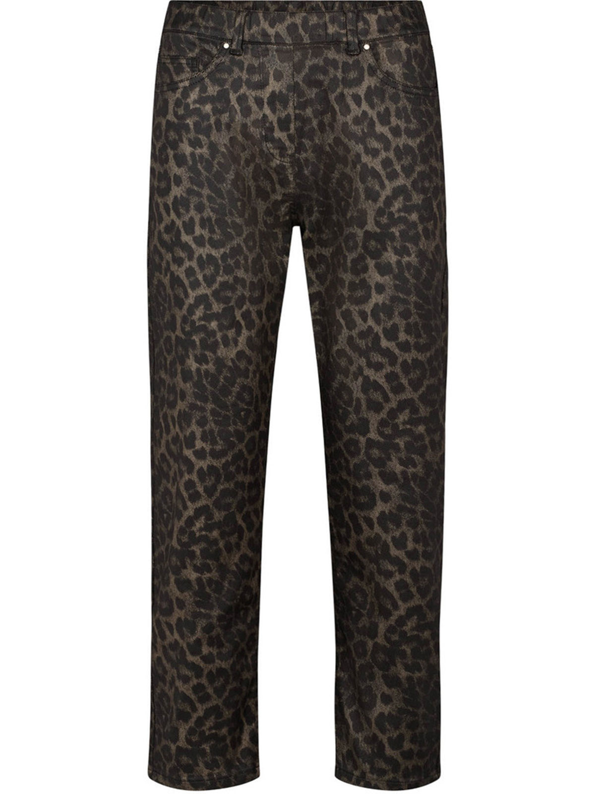 Mirakelbyxan Hannah i 7/8-del längd från Laurie är en dra-på-byxa med resår i midjan. Den har fickor fram och bak samt hällor för skärp i linningen. Här i ett metallicskimrande leopardmönster.