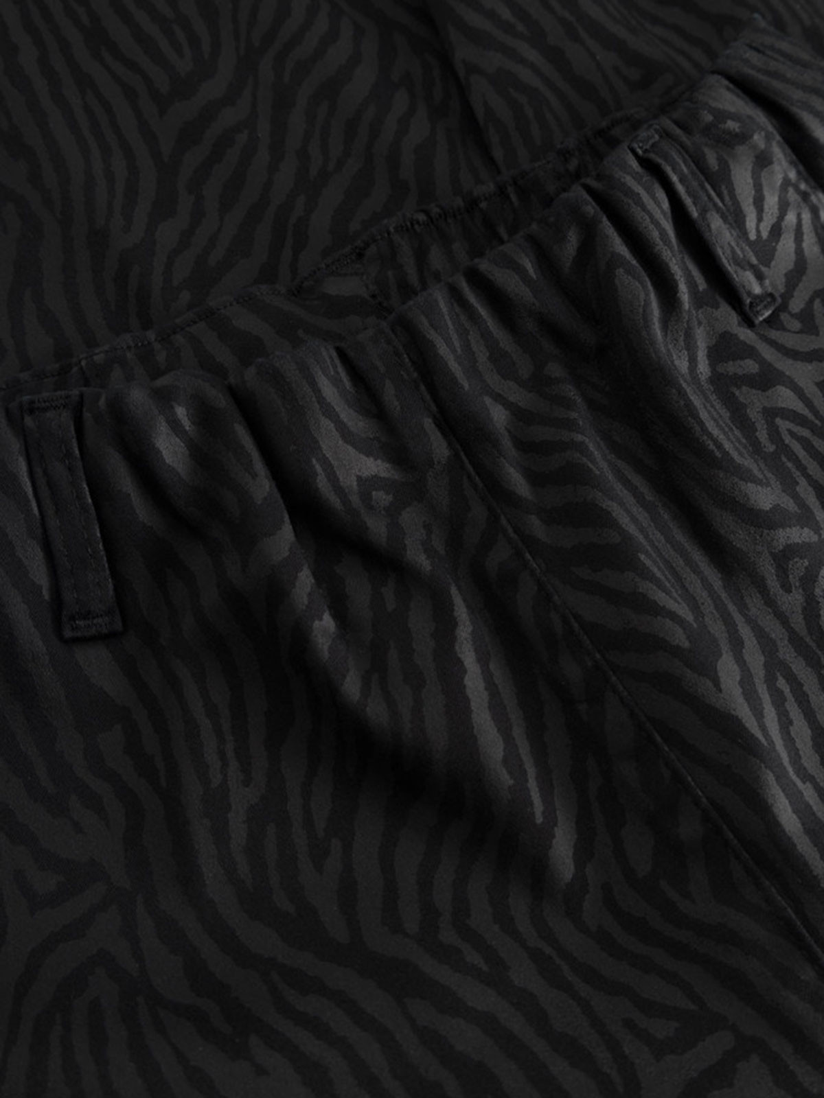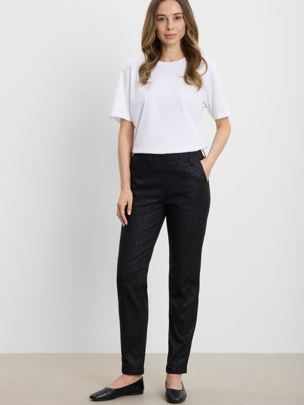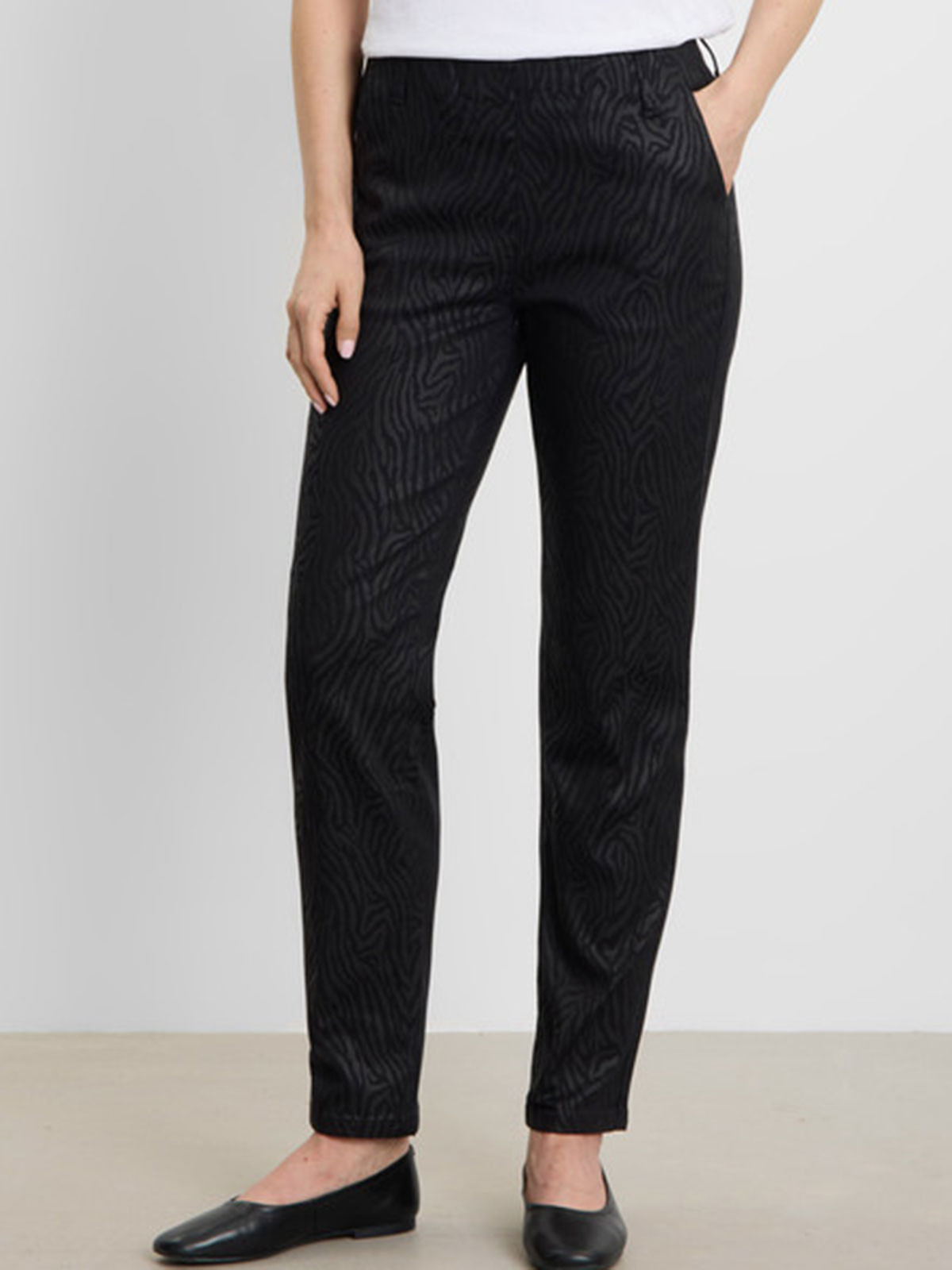 En skön mirakelbyxa från LauRie i ett härligt svart mönster (matt-blankt). Modellen Taylor är en regular och rak modell med snedställda framfickor och bältesöglor i linningen. En praktisk dra-på-modell.